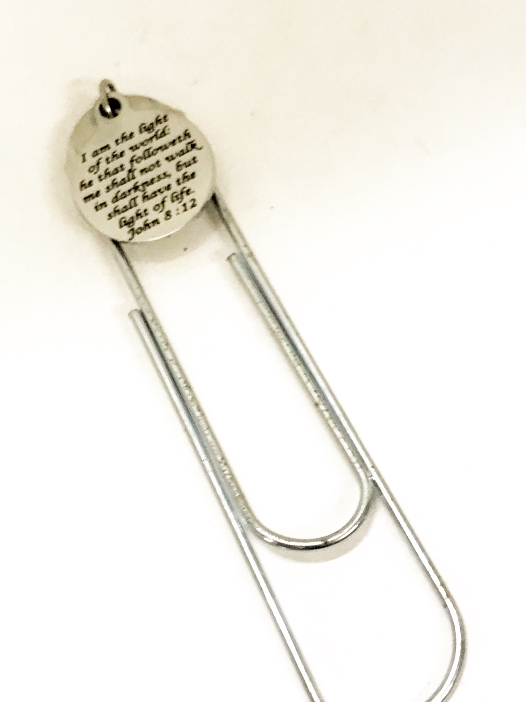 This is a great scripture quote bookmark to remind someone that Jesus is the light of the world. This paper clip bookmark has a stainless steel laser engraved charm with the following scripture quote on it.