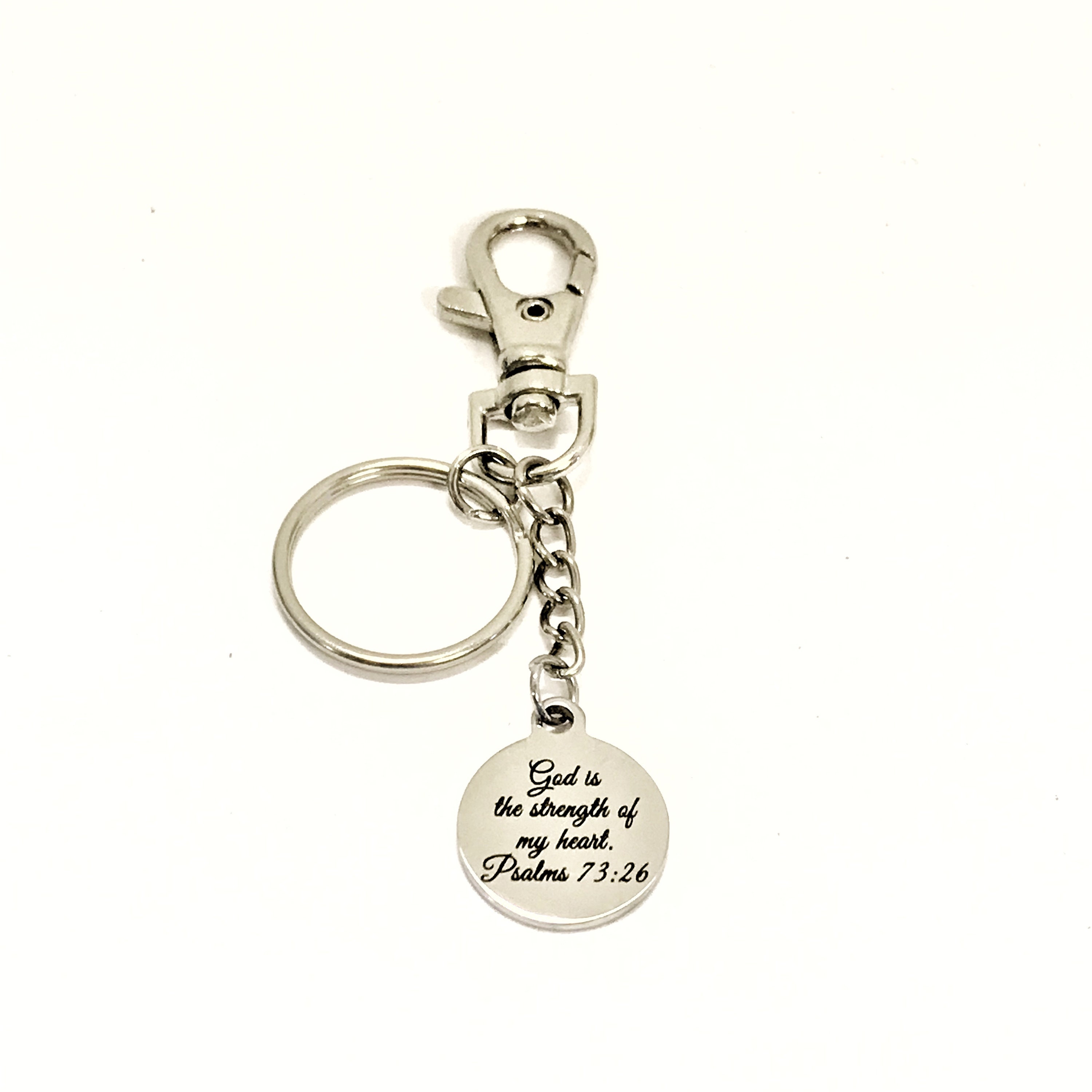 This is a great bible verse keychain gift . The keyring can be clipped onto your bag to make it easy to access without digging to the bottom of the bag. It has a stainless steel laser engraved charm with “God is the strength of my heart.” from Psalms 73:26 on it.