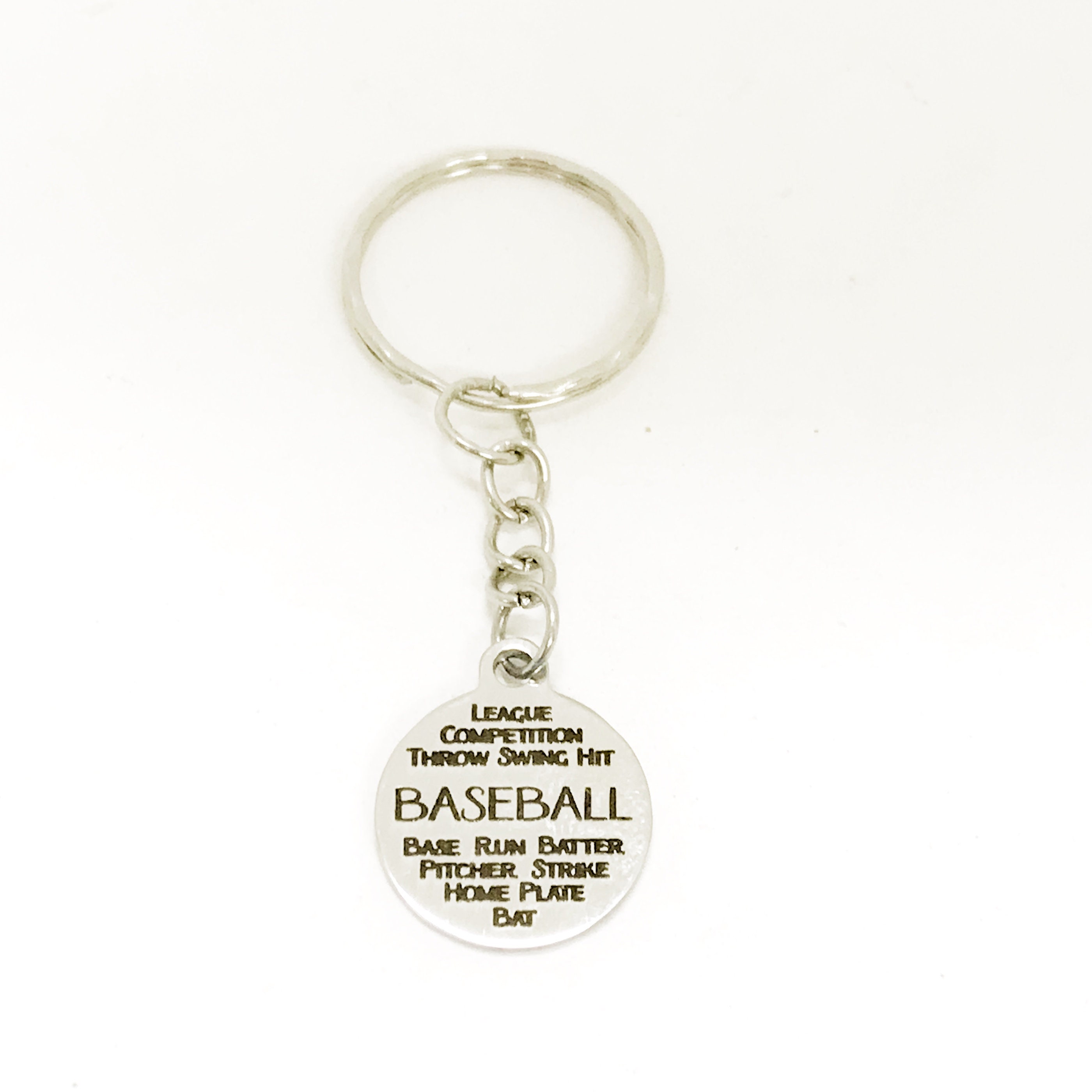 This is a great baseball charm keychain. It has a stainless steel laser engraved charm with the following baseball words on it: League, Competition, Throw, Swing, Hit, Base, Run, Batter, Pither, Strike, Home Plate, Bat