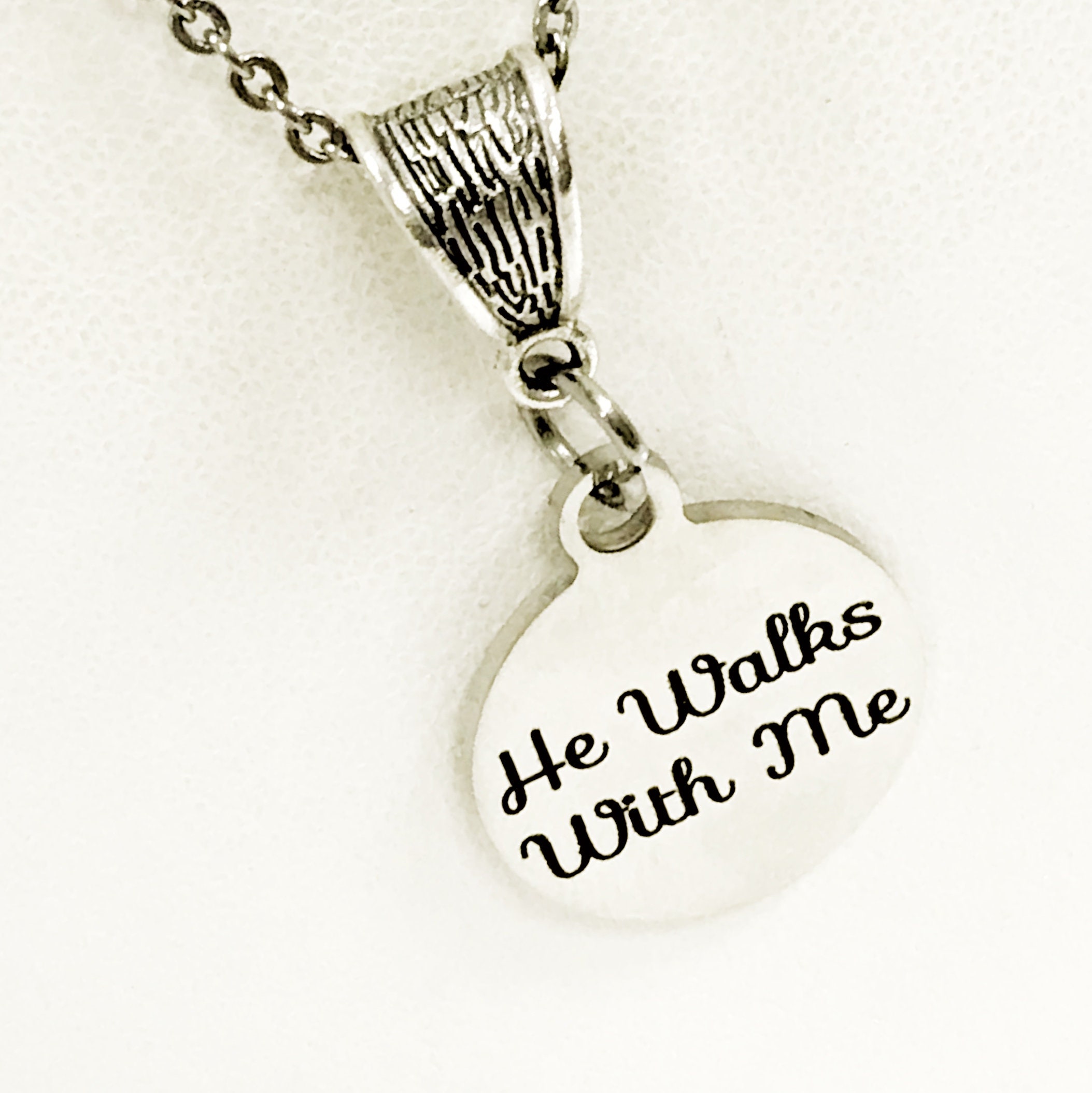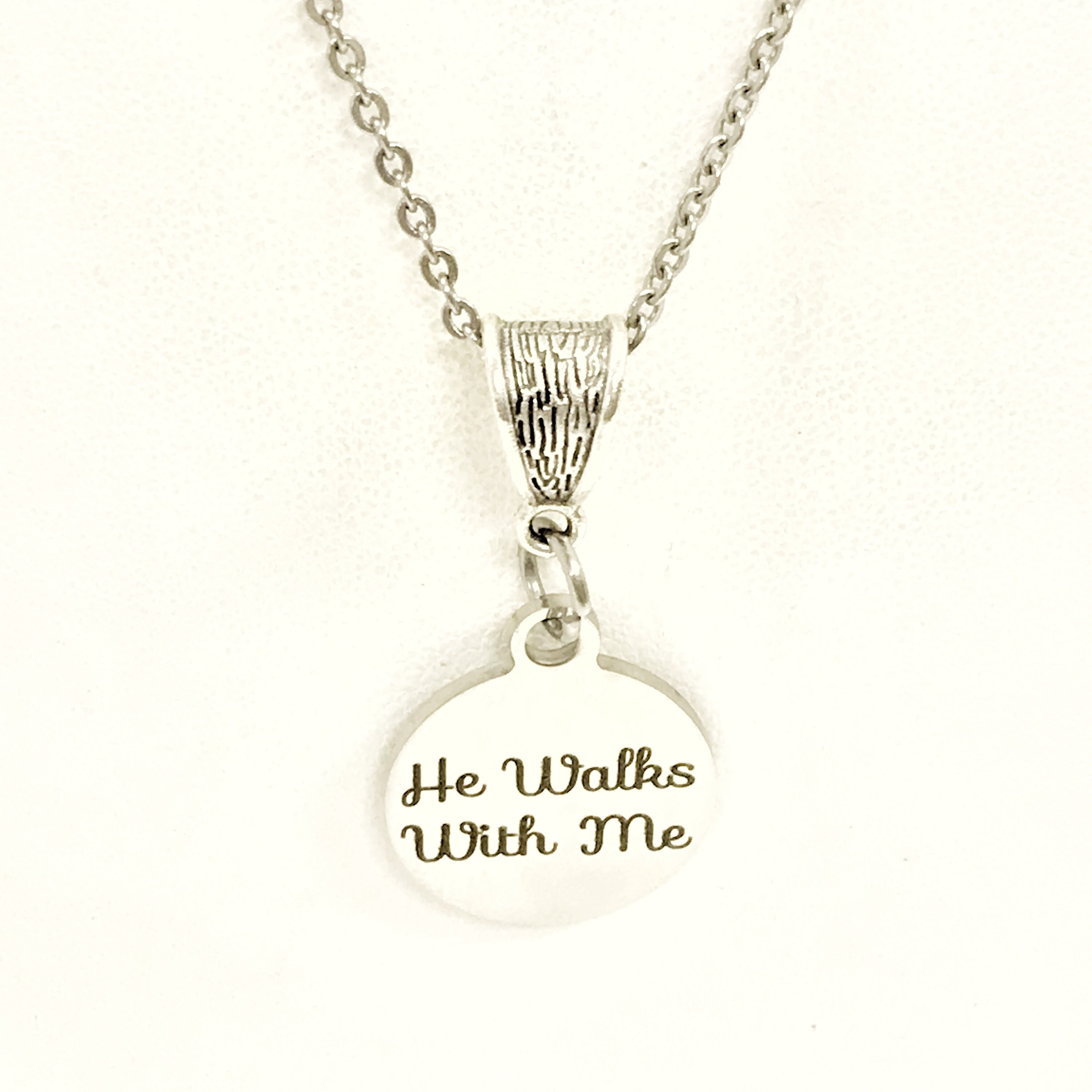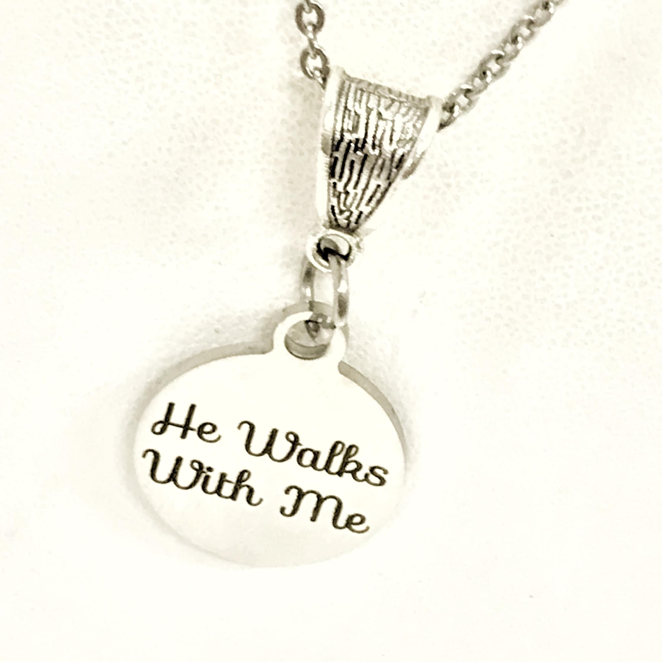 This beautiful necklace would make a great gift to remind someone that Jesus walks with them each step of their life. The pendant is a stainless steel laser engraved charm with “He walks with me” on it with a silver-tone bail.