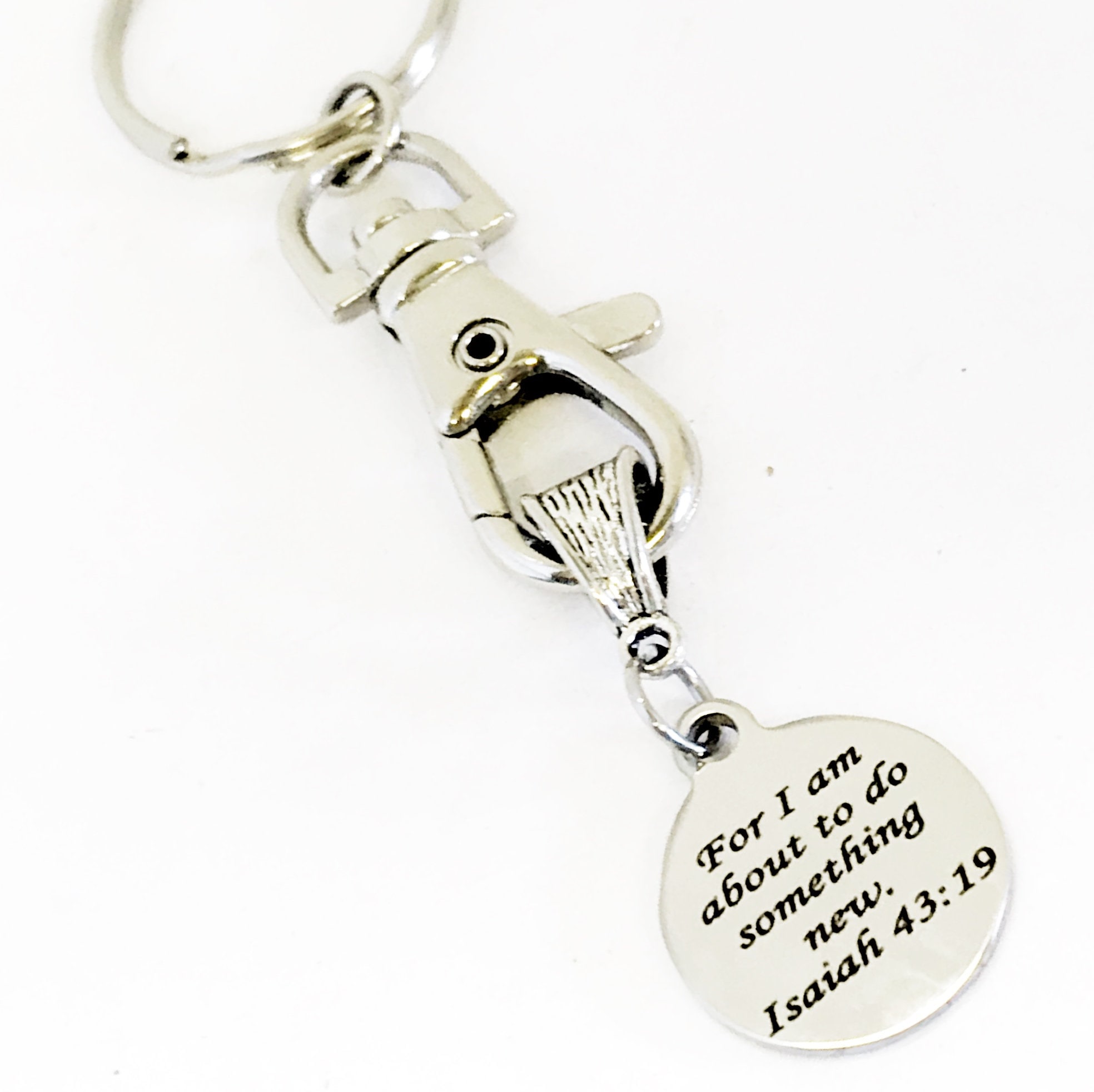 This keychain gift is a great gift to someone that Jesus is the fresh start and new beginning that we all need. It has a stainless steel laser engraved charm with “For I am about to do something new” from Isaiah 43:19 on it.