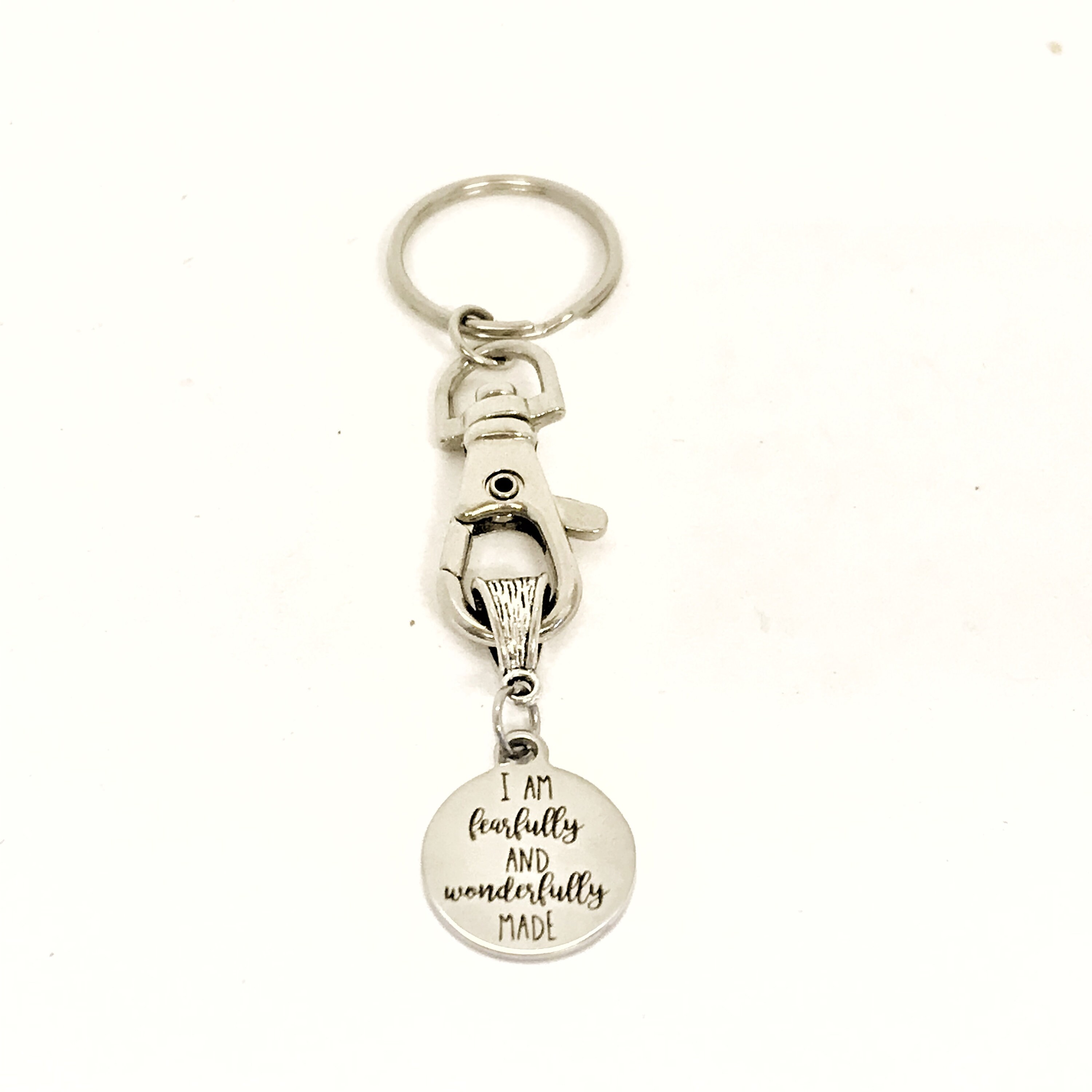 This keychain gift is a great reminder of the Bible verse of Psalms 139:14 that tells us that we are each made by God fearfully and wonderfully. It has a stainless steel laser engraved charm with “I am fearfully and wonderfully made” on it.
