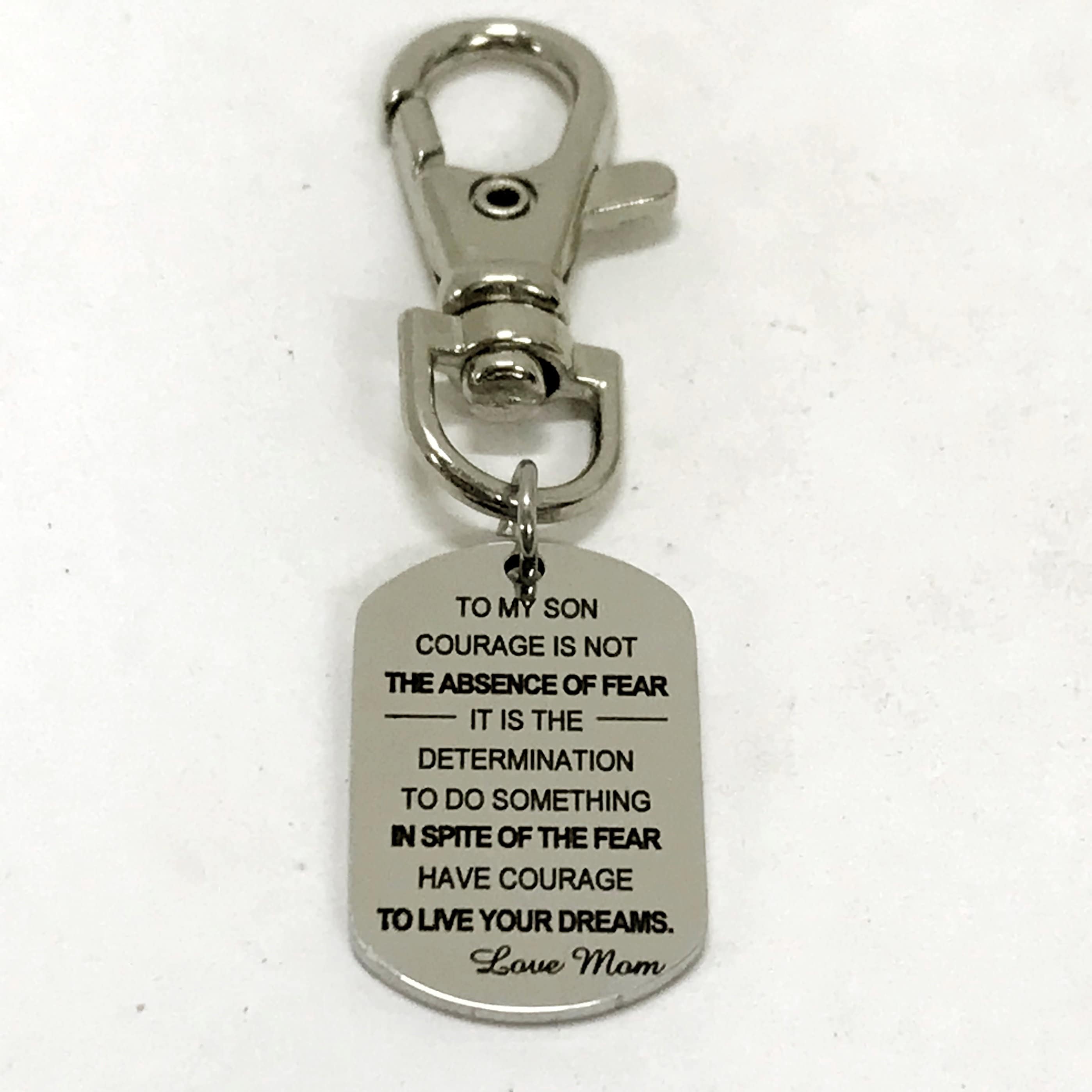 This is a great zipper pull or bag charm clip gift that would be perfect gift to remind your son to have courage and live his dreams. It would be a great charm to clip onto a sports bag, book bag or keychain. The charm measures approx. 28mm x 18mm (1.1in x .7in). It has the following words on it: