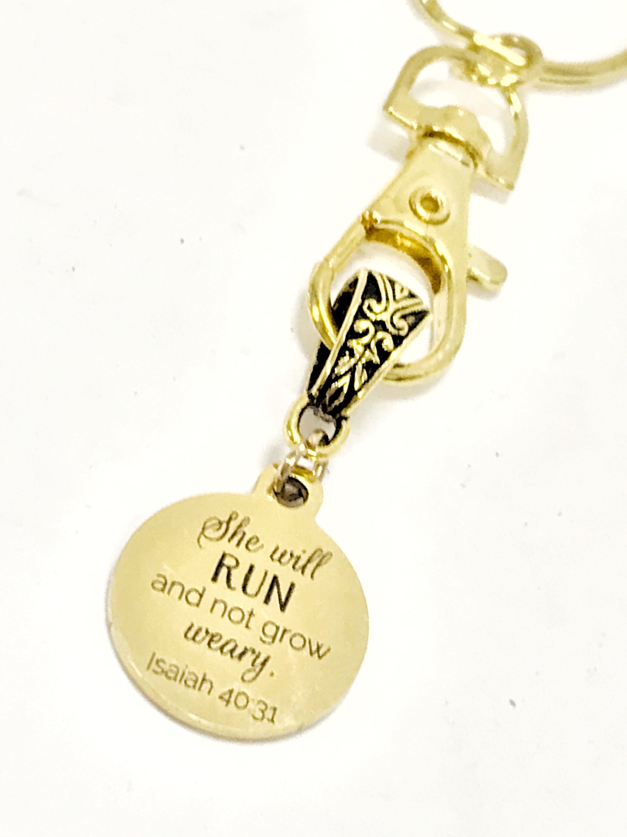 This is a great keychain that has a goldtone stainless steel laser engraved charm which says, "She will run and not grow weary" from Isaiah 40:31 on it.