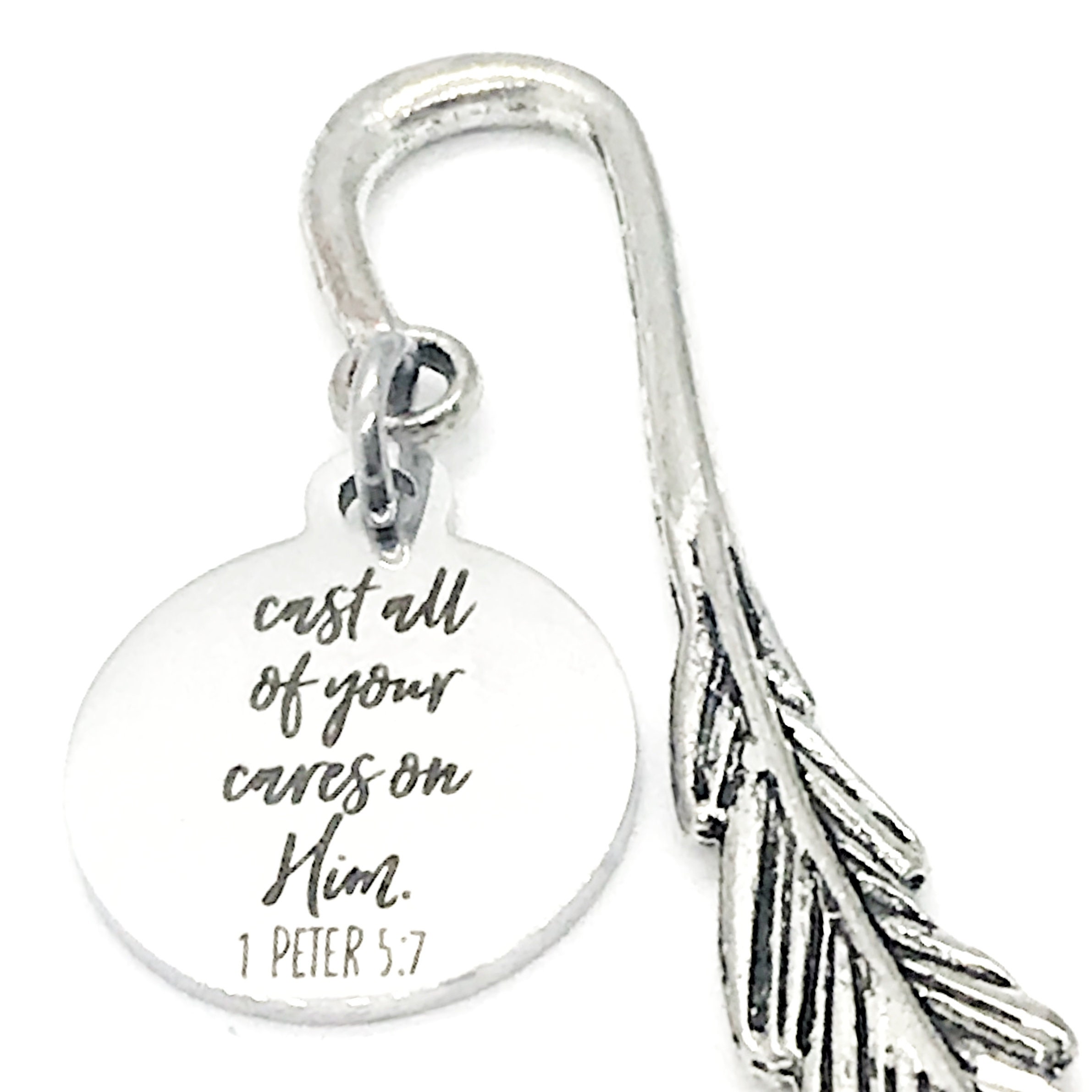 This bookmark would be a great gift to remind someone to cast their cares and worries on the Lord. It has a stainless steel laser engraved charm with “Cast all of your cares on Him” from 1 Peter 5:7 on it.