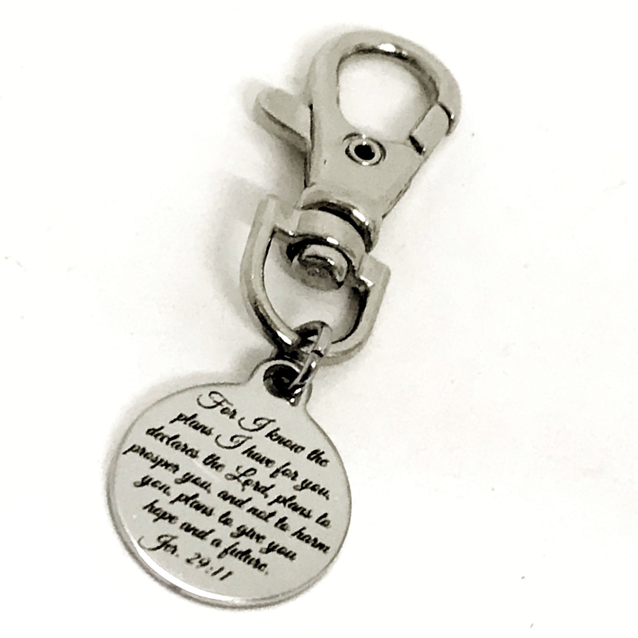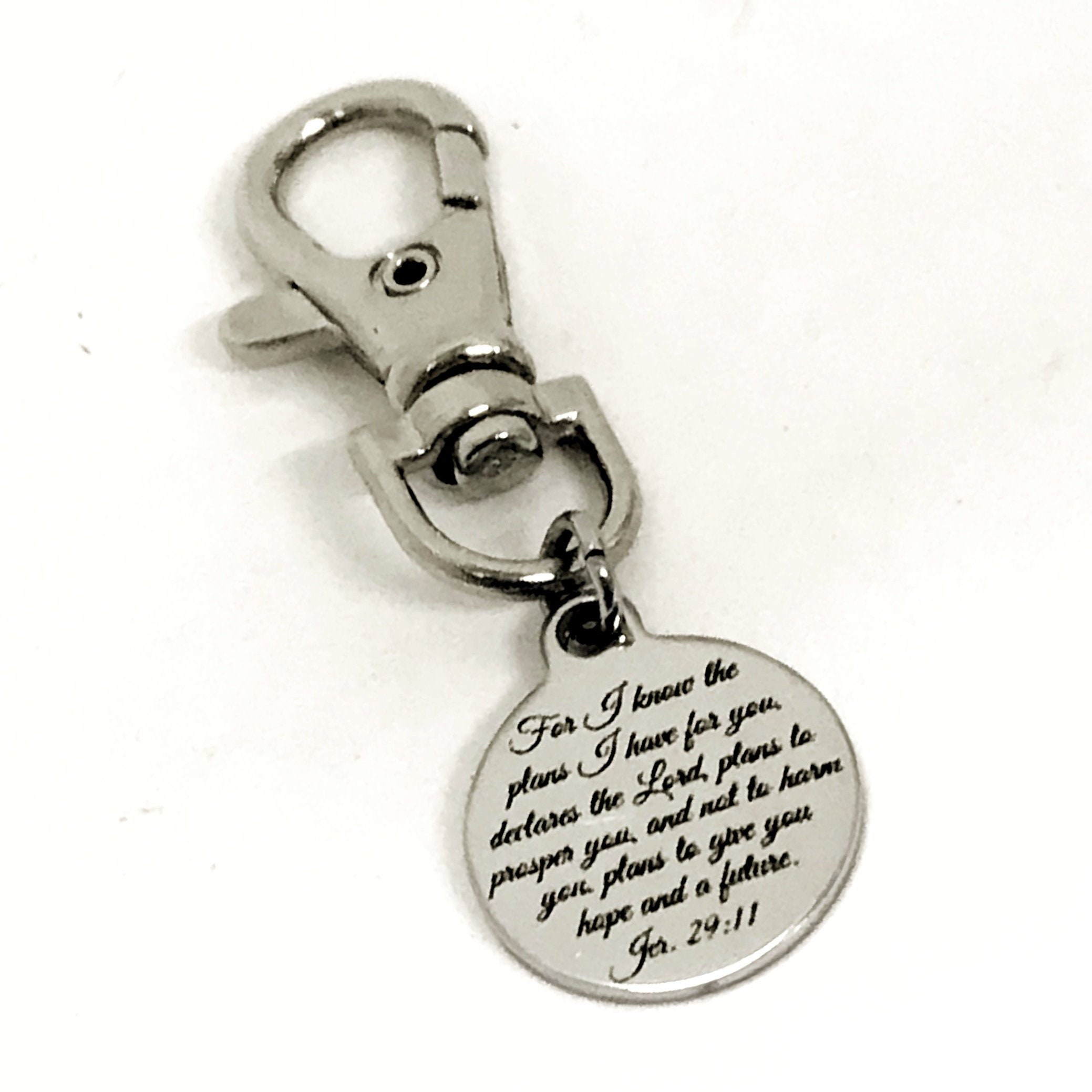This is a great bible verse zipper pull or bag charm. The charm measures approx 3/4 inch across. It has the following verse from Jeremiah 29:11 on it: