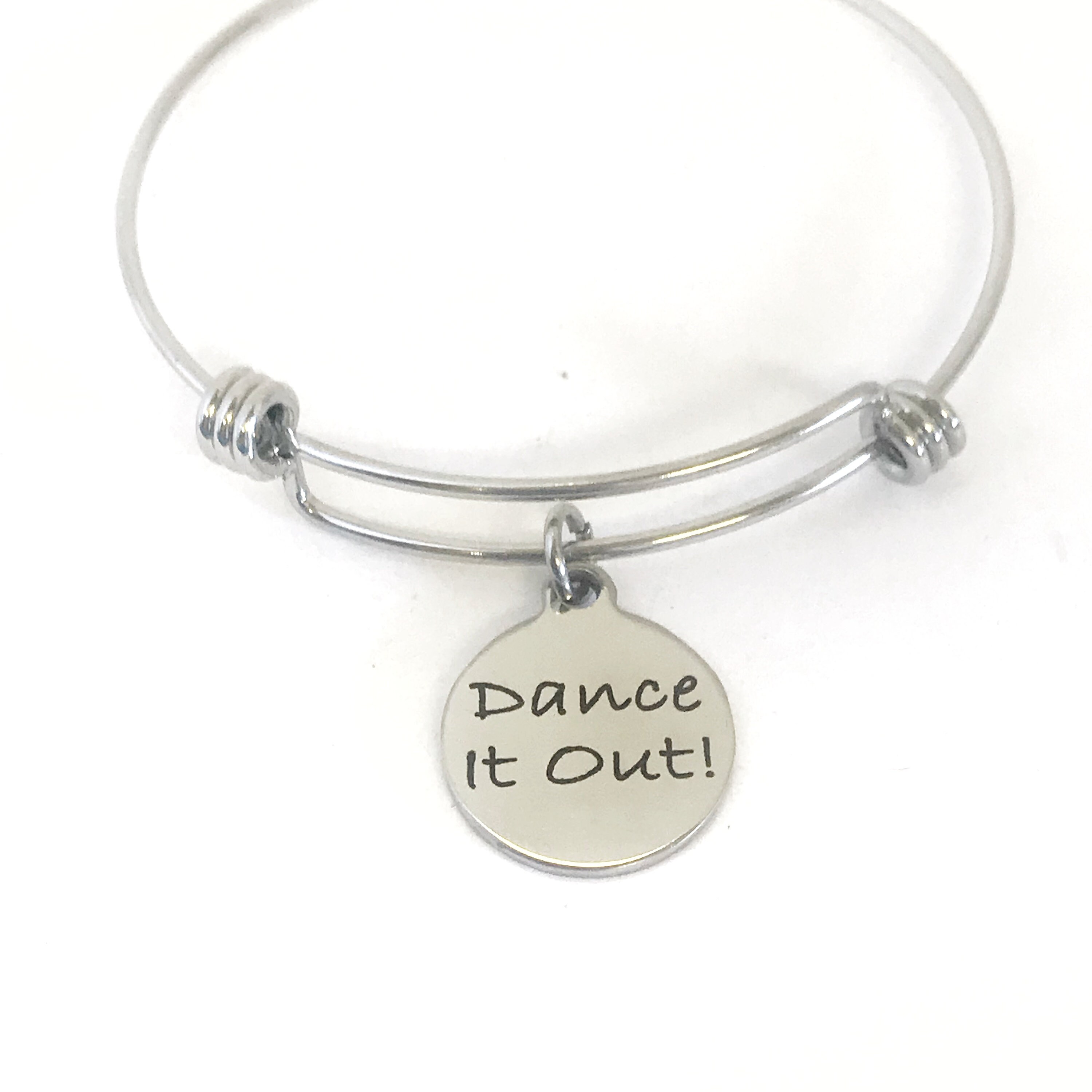 This stacking bangle bracelet would be a great gift for you and your friends that love to dance out your stresses, worries, and frustrations. It has a stainless steel laser engraved charm with “Dance It Out” on it.