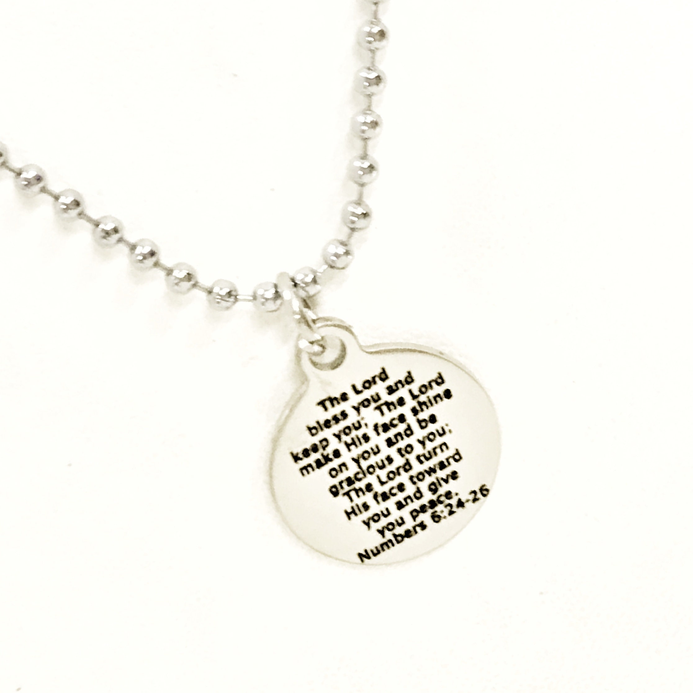 The pendant is a stainless steel laser engraved charm on a 24 inch ball chain. The charm has the following on it:
