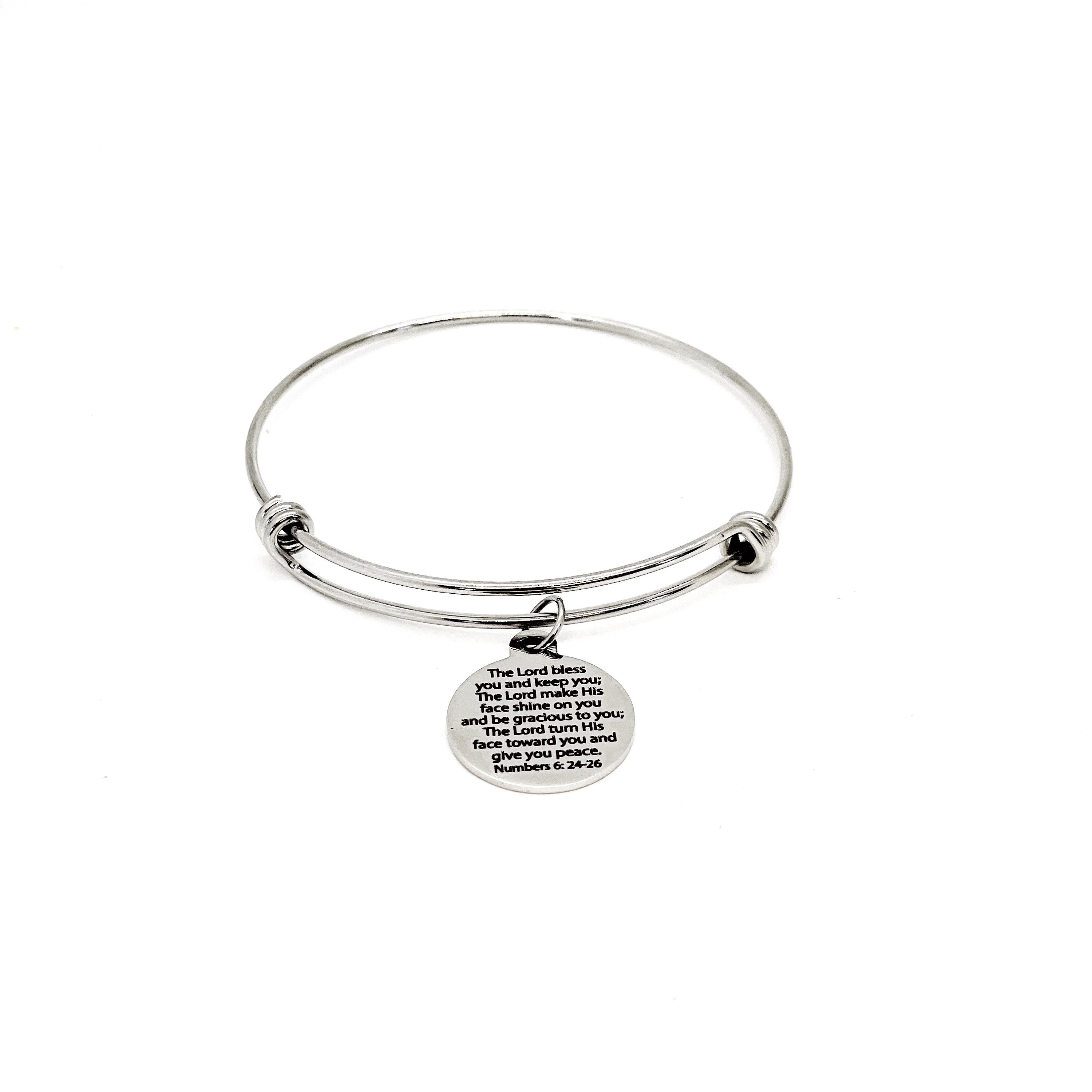 This stacking bangle bracelet would be a great Christian jewelry gift. It has a stainless steel laser engraved charm with the following Christian blessing on it.