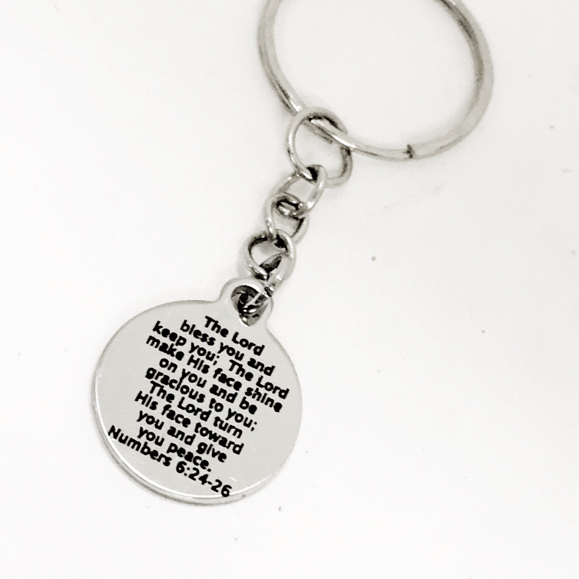 This is a great scripture blessing keychain. It has a stainless steel laser engraved charm with the following scripture blessing on it.