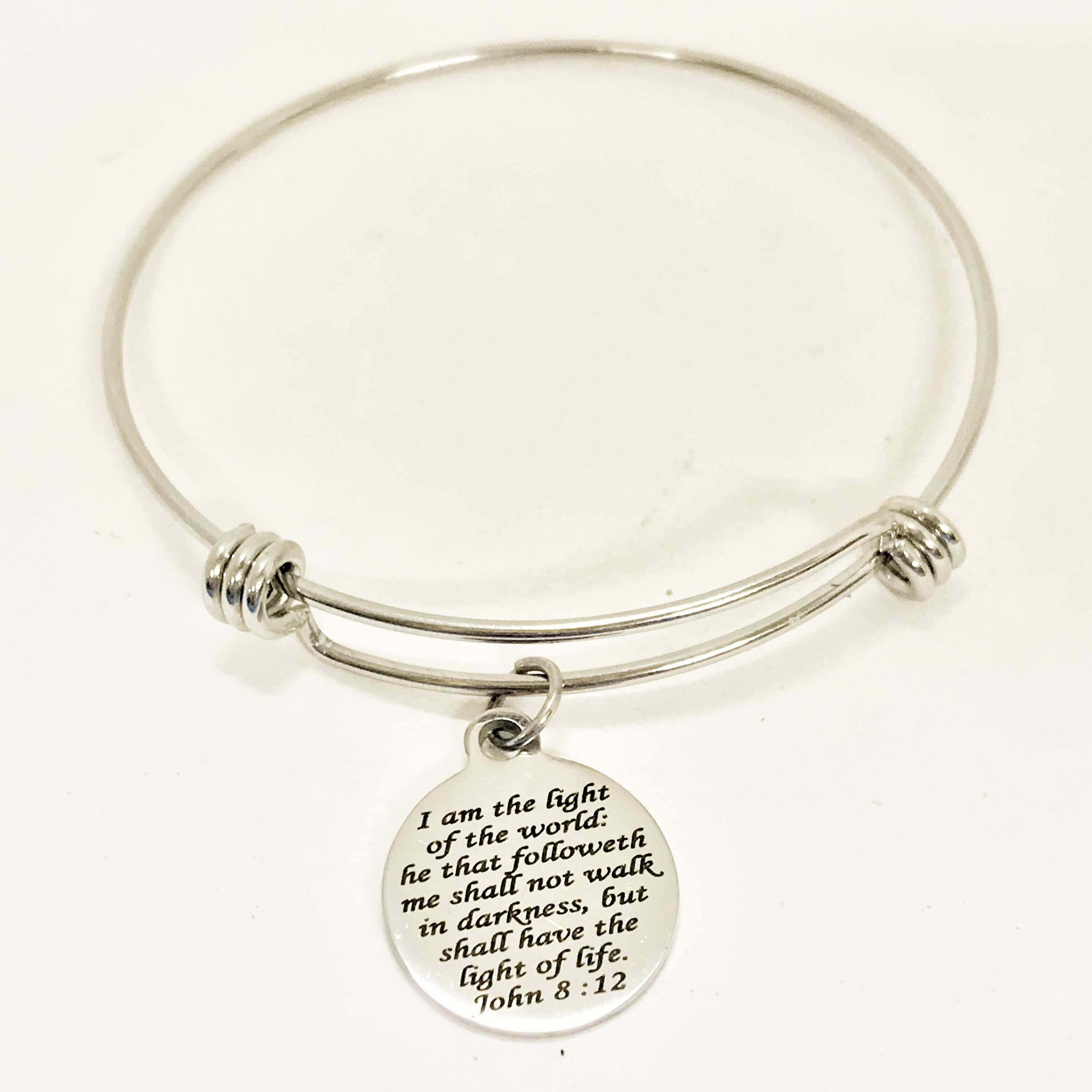 This stacking bangle bracelet would be a great Christian jewelry gift to remind the wearer that Jesus is the light of the world. It has a stainless steel laser engraved charm with the following scripture quote on it: