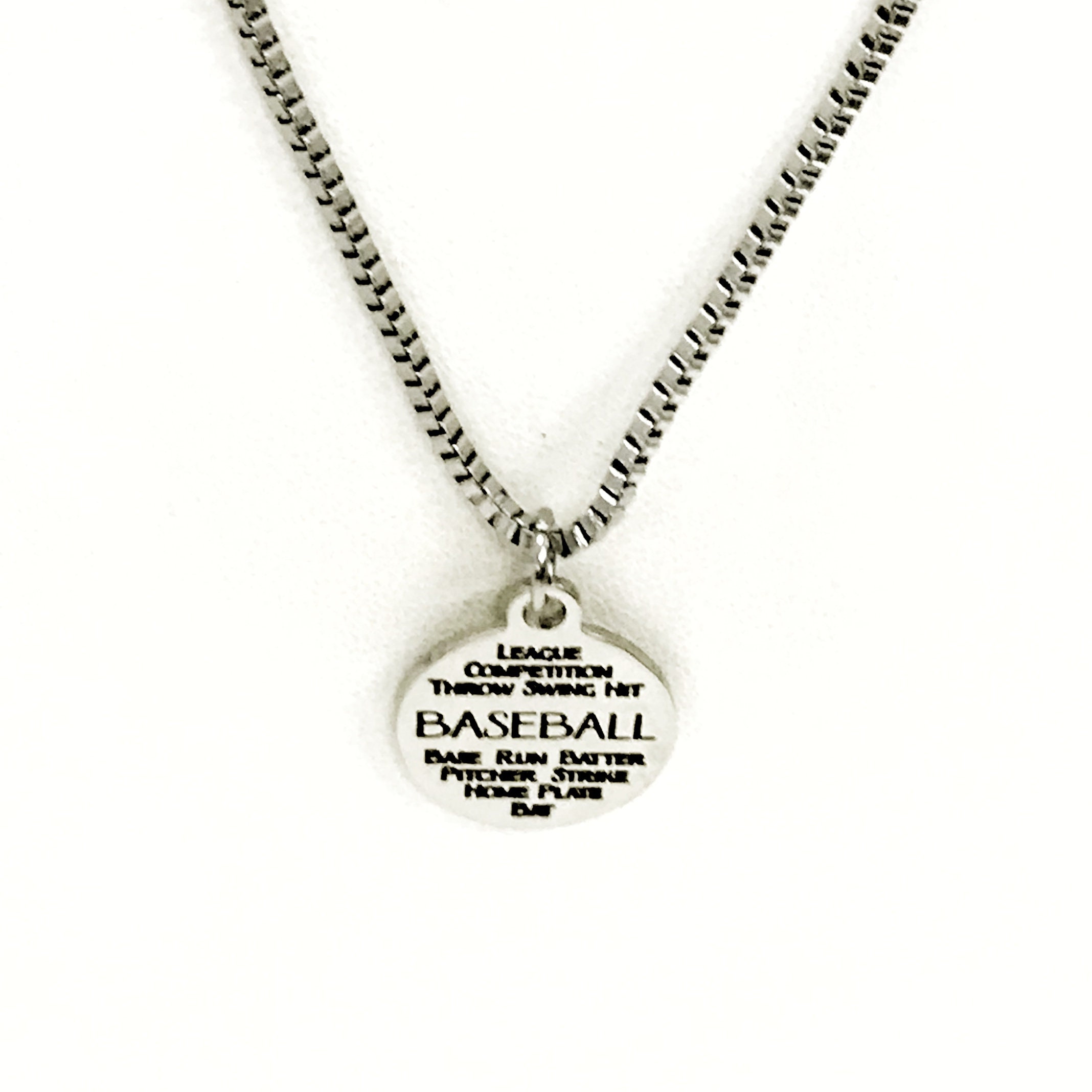 This is great stainless steel baseball necklace. It would make the perfect gift for the baseball player on your shopping list. This necklace comes with a stainless steel laser engraved charm pendant on a 22 inch stainless steel box chain. The pendant has the following baseball words on it: League, Competition, Throw, Sewing, Hit, Base, Run, Batter, Pitcher, Strike, Home Plate, Bat.