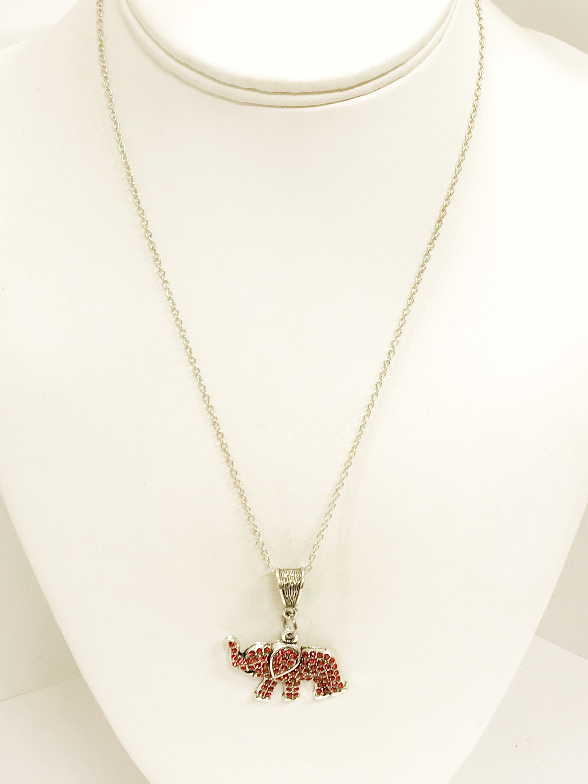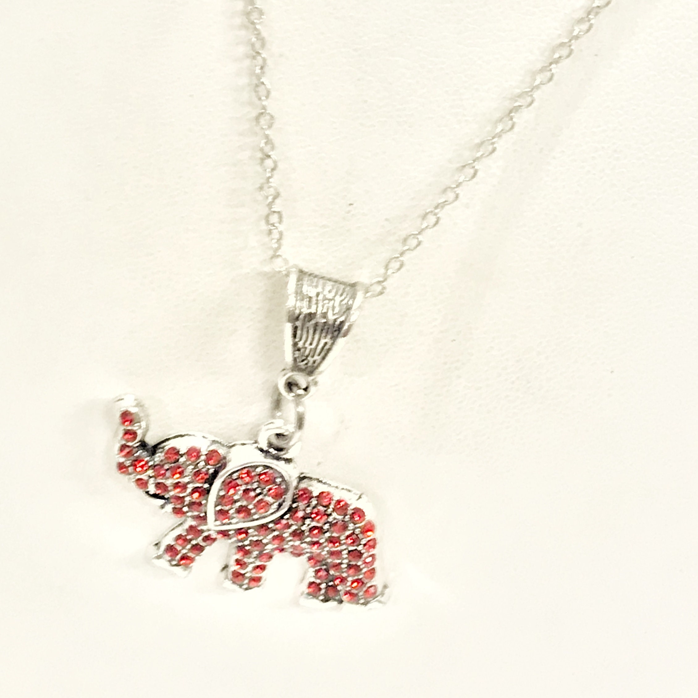 The elephant is known as a symbol for good luck, power, intelligence and peace. This necklace is a red crystal elephant charm pendant on a silver plated link chain. This pendant is available on your choice of 16, 18, 20, 22, 24, 26, 28 or 30 inch chain. The pendant is also available for individual purchase if you have another chain on which you would like to wear it.