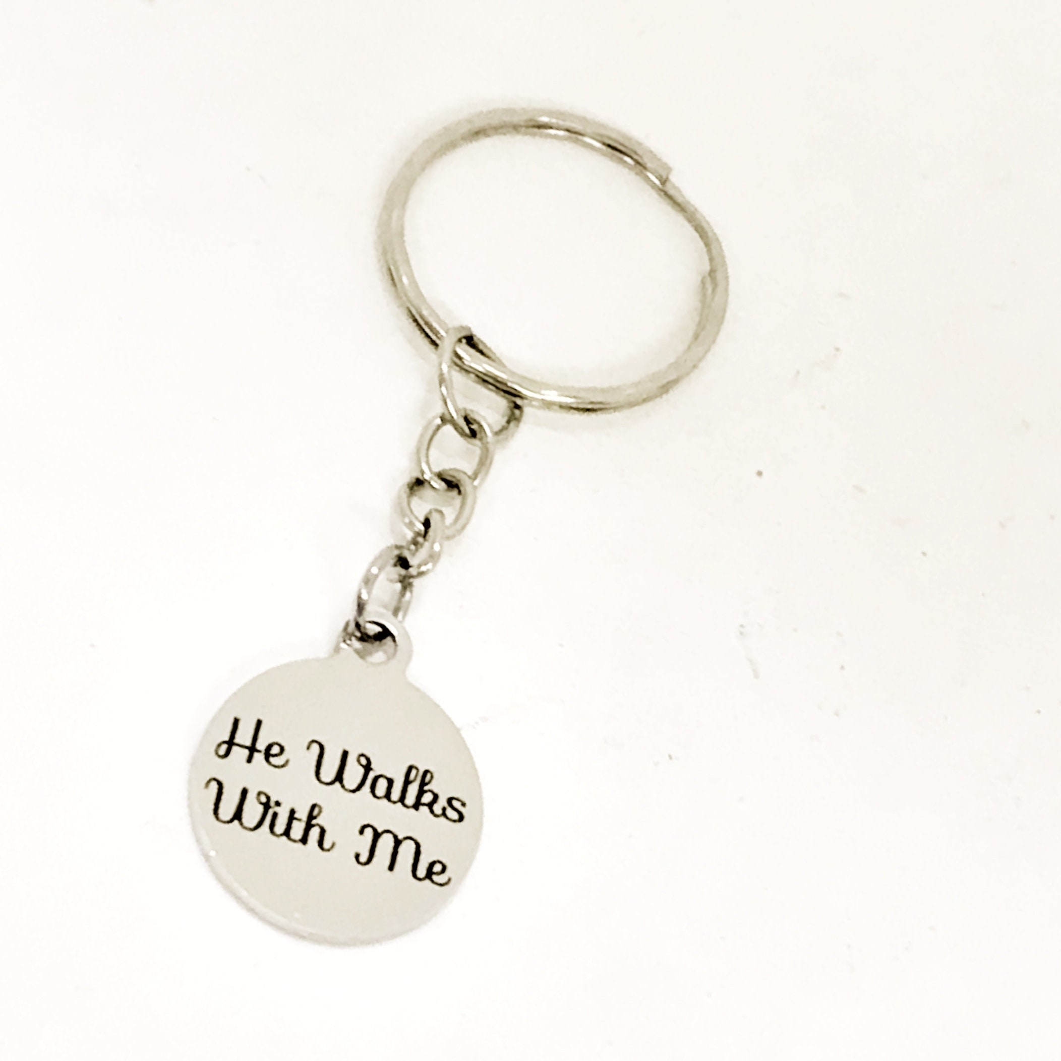 This is a great encouragement keychain. It has a stainless steel laser engraved charm with “He Walks With Me” on it.