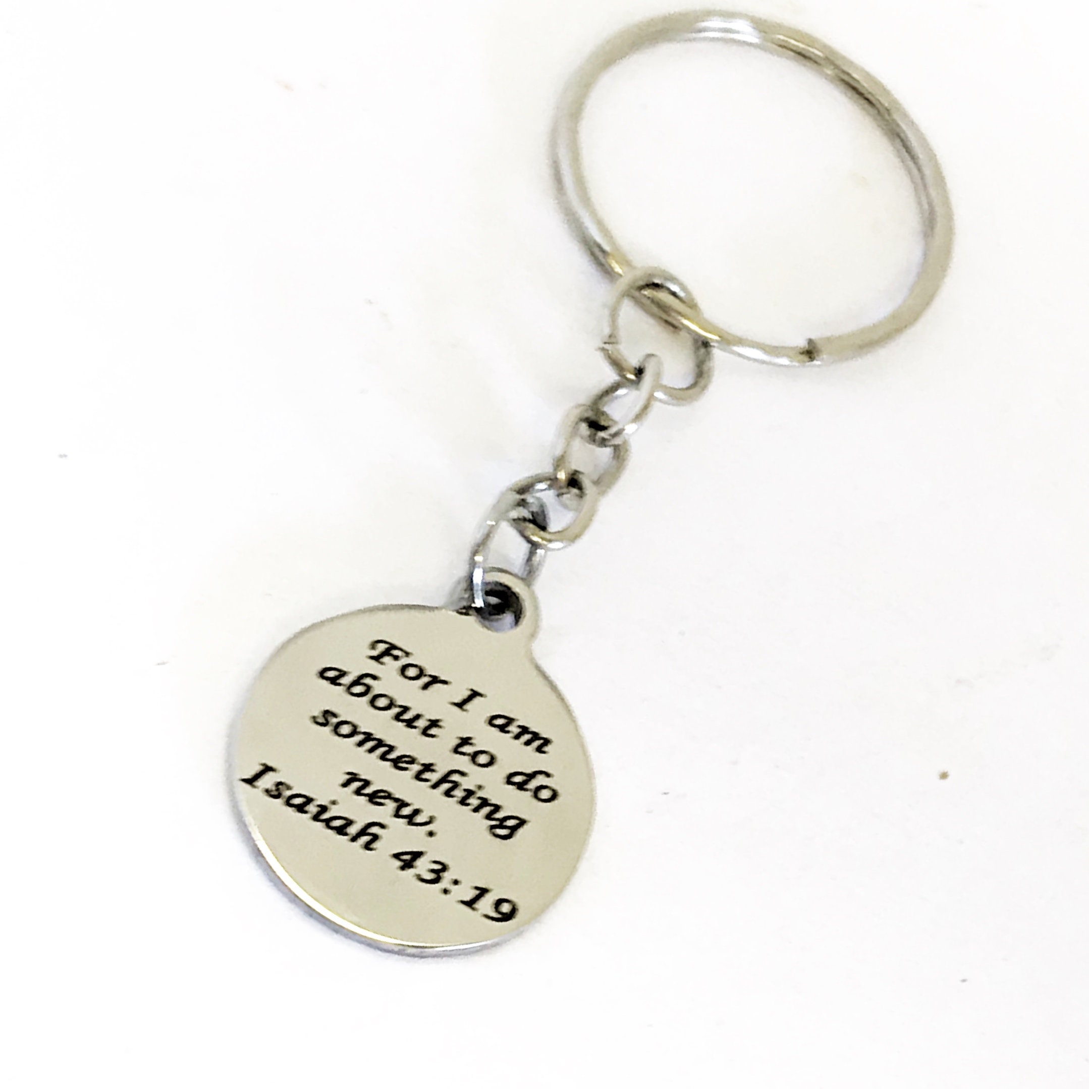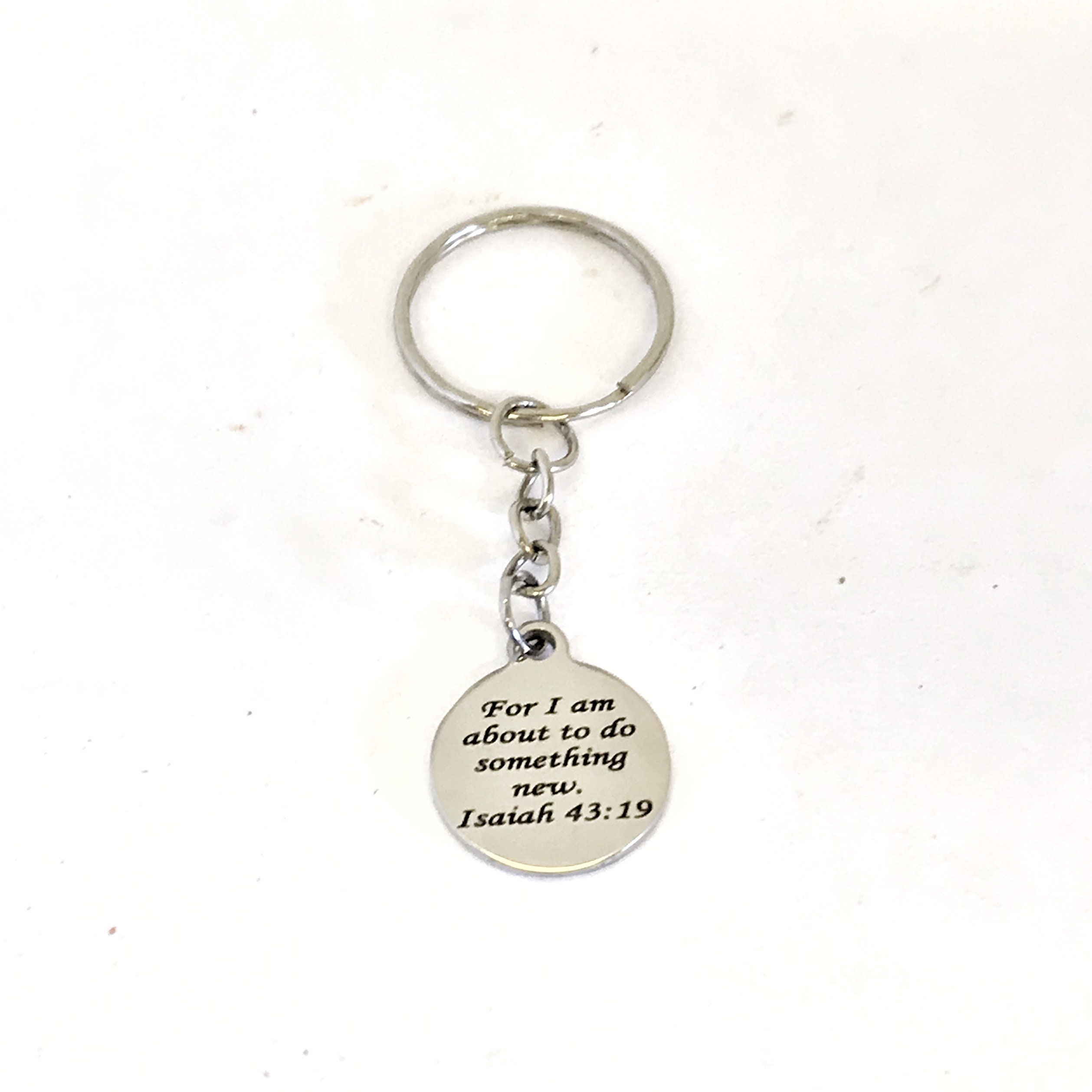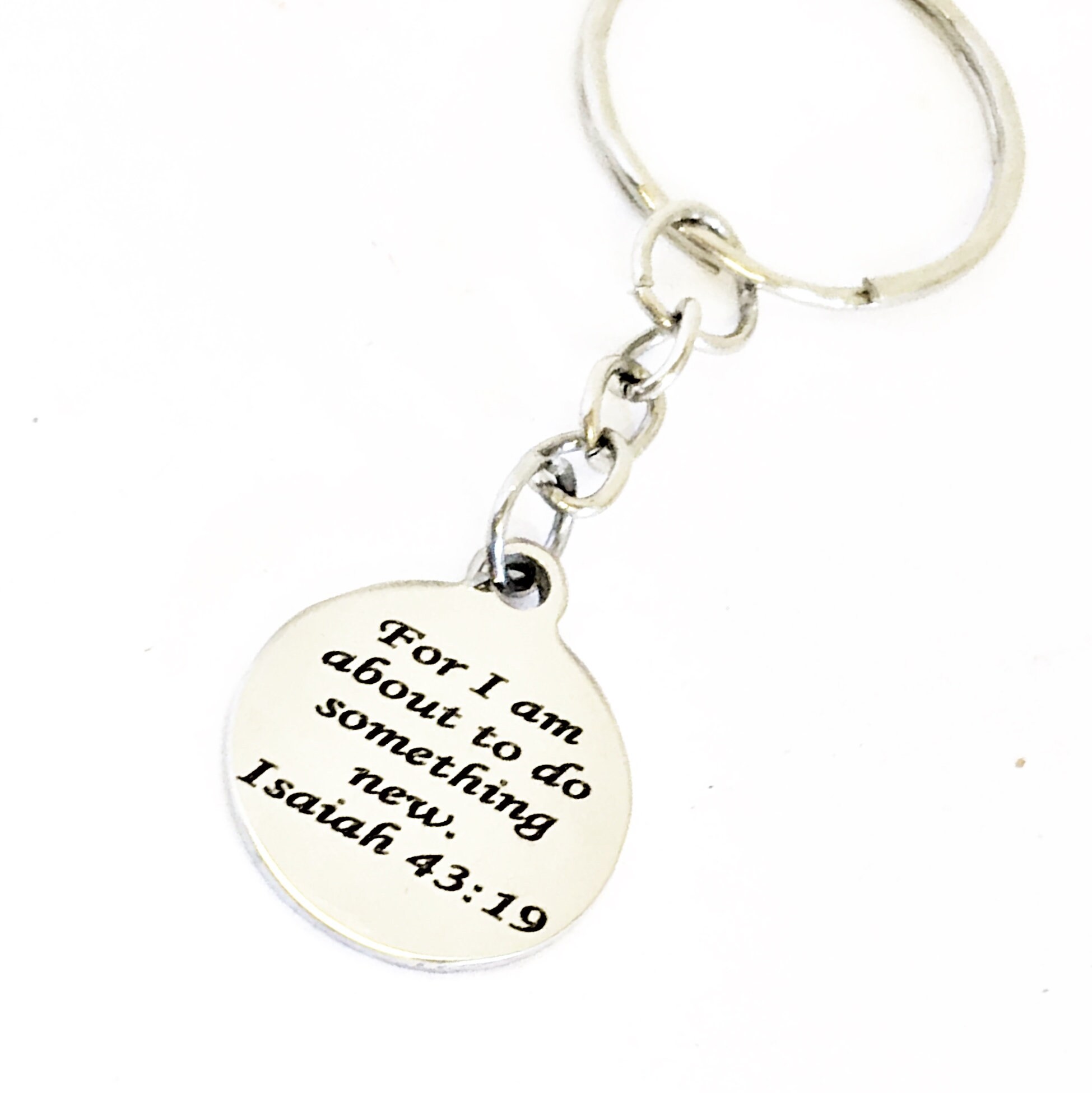This is a great Christian encouragement keychain. It has a stainless steel laser engraved charm with “For I am about to do something new” from Isaiah 43:19 on it.
