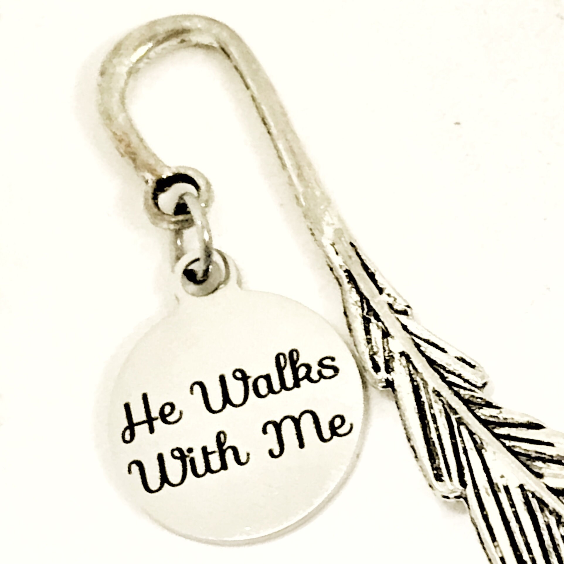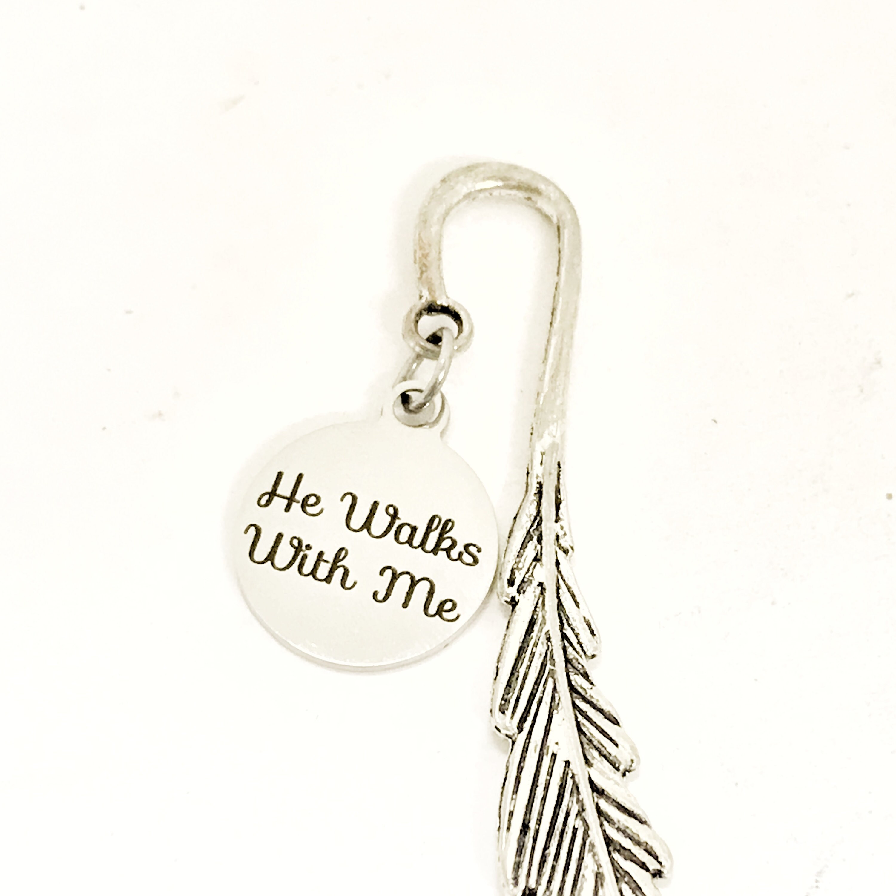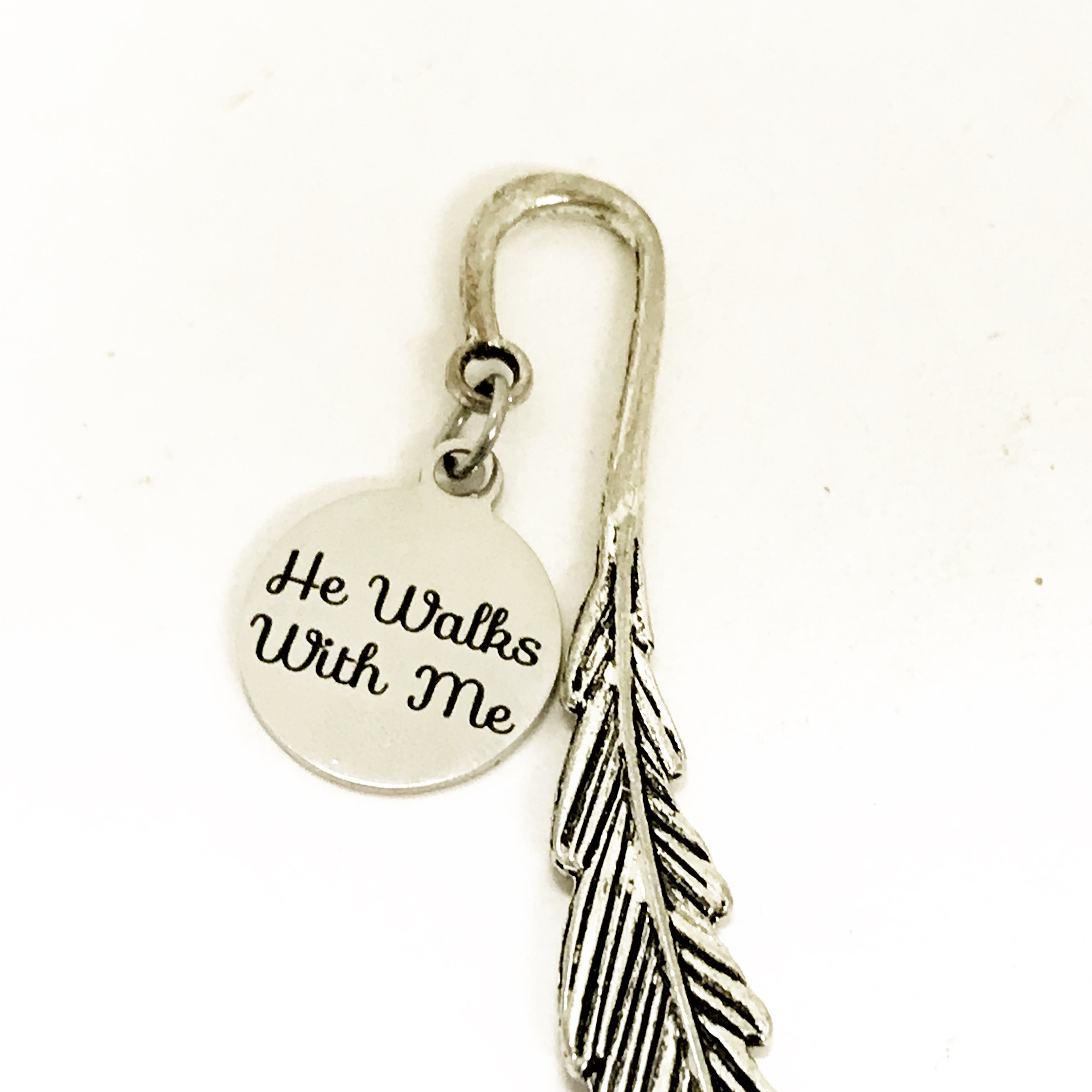 This bookmark would be a great gift to remind someone that no matter how alone we may feel, Jesus is there with us. It has a stainless steel laser engraved charm with “He walks with me” on it.