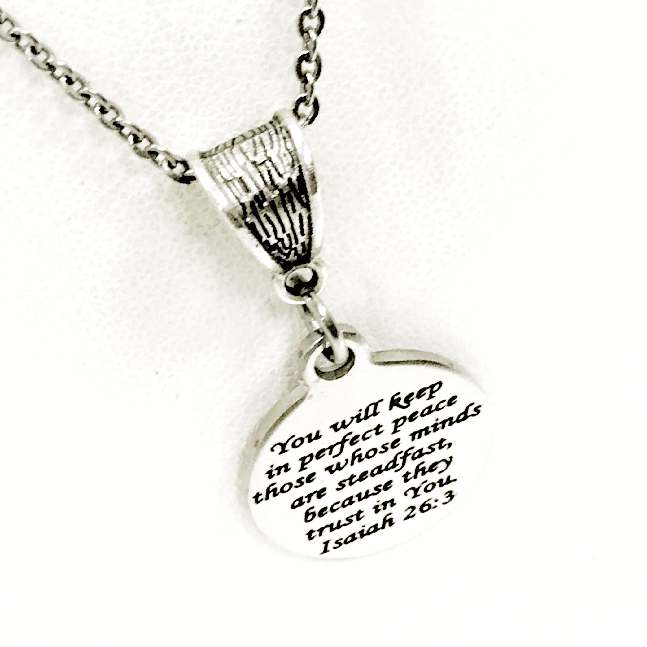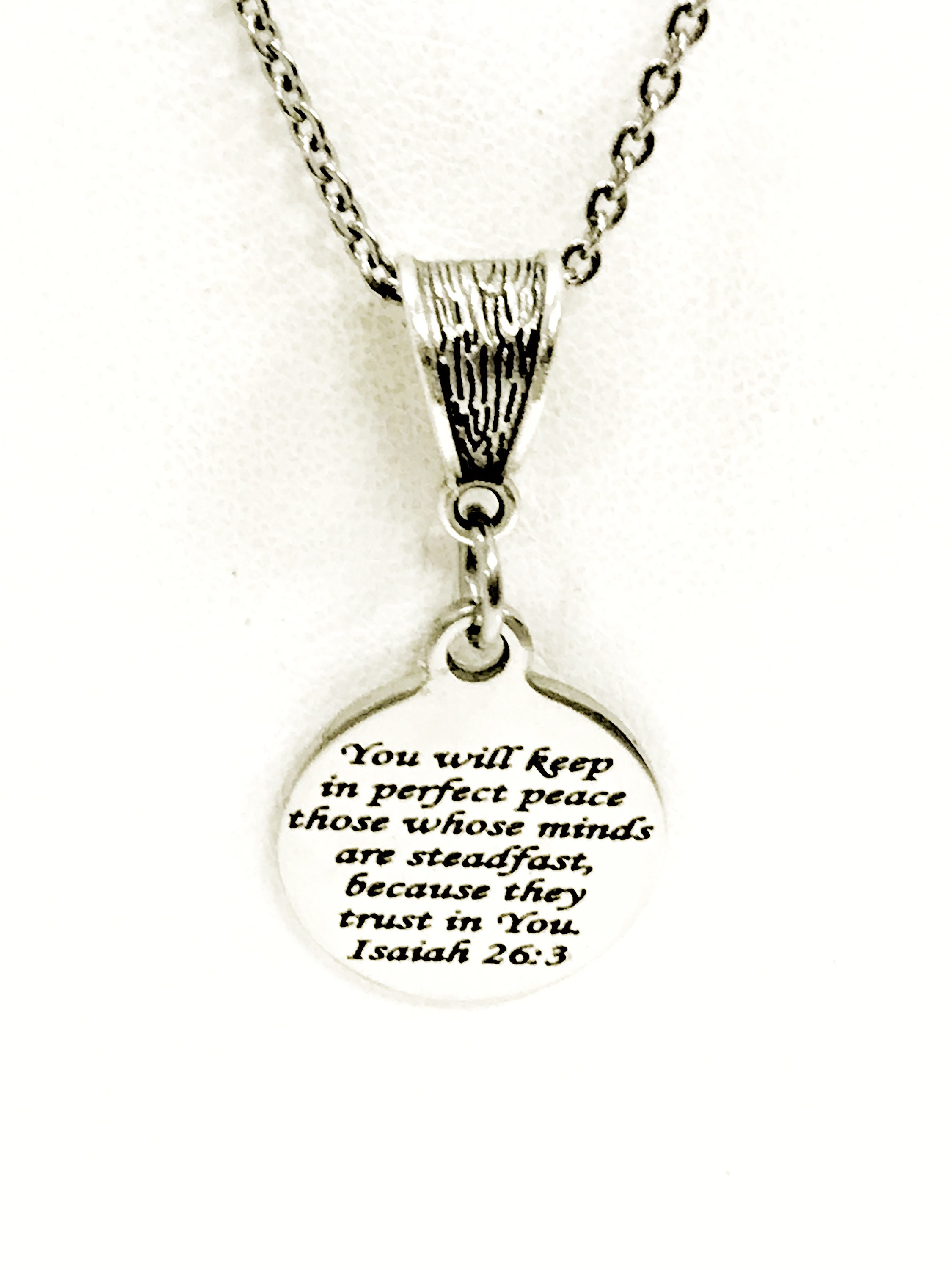 This beautiful necklace would make a great gift to remind the wearer that God’s peace is perfect. The pendant is a stainless steel laser engraved charm with “You will keep in perfect peace those whose minds are steadfast, because they trust in You. Isaiah 26:3” on it with a silver-tone bail.
