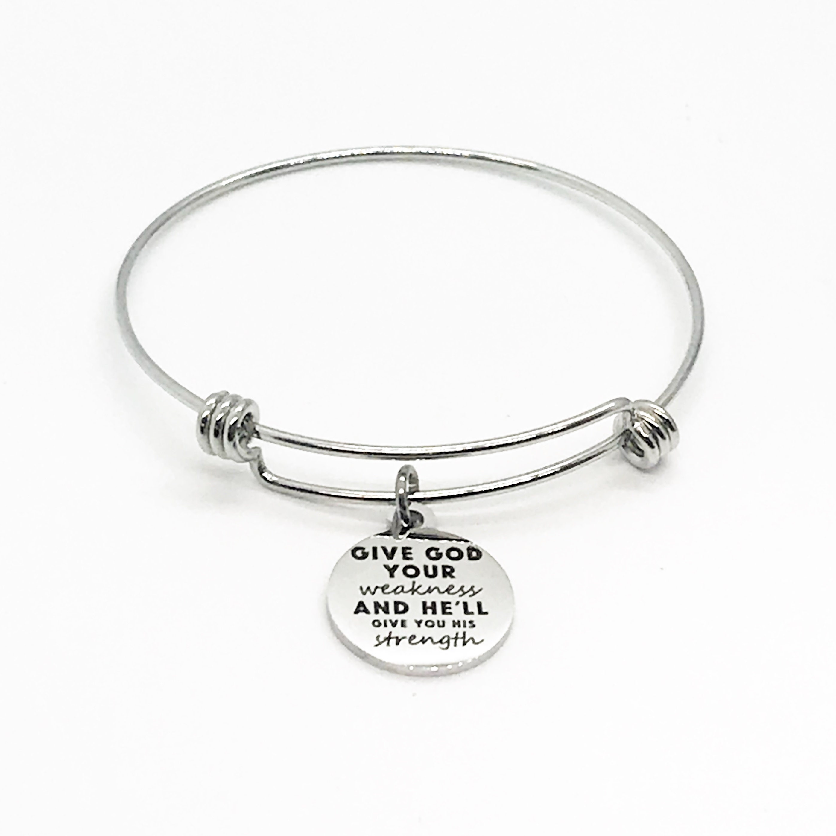 This stacking bangle bracelet would be a great Christian charm bracelet jewelry gift. It has a stainless steel laser engraved charm with “Give God your weakness and He’ll give you His strength” on it.