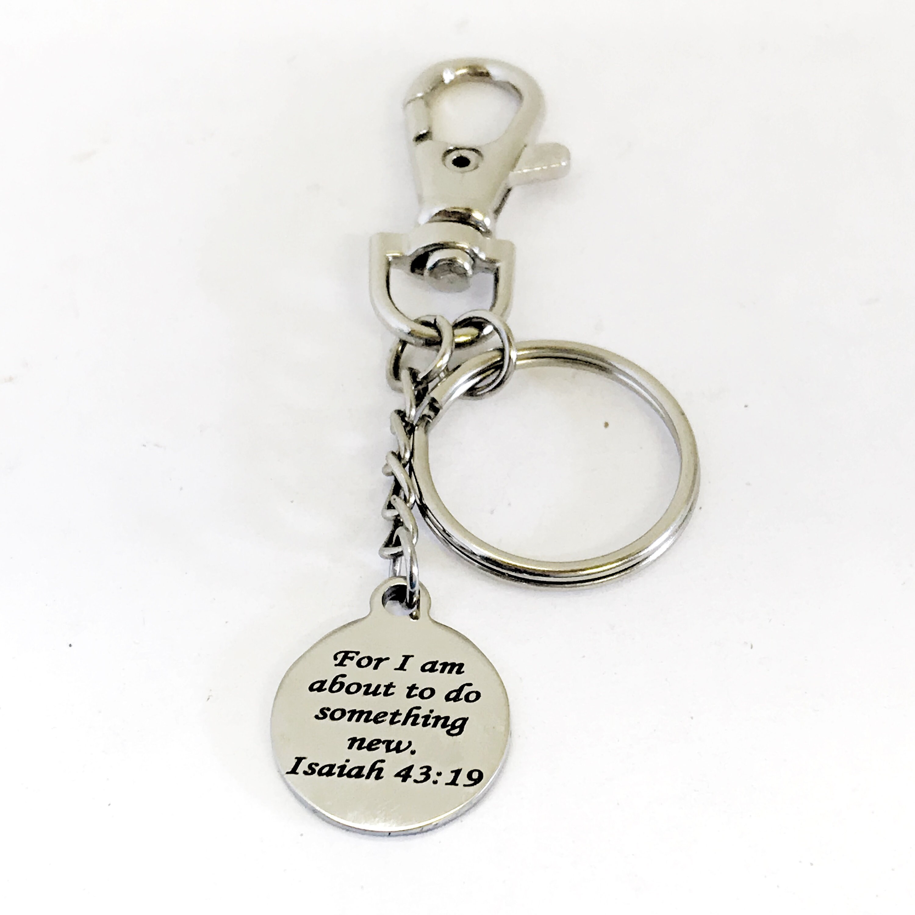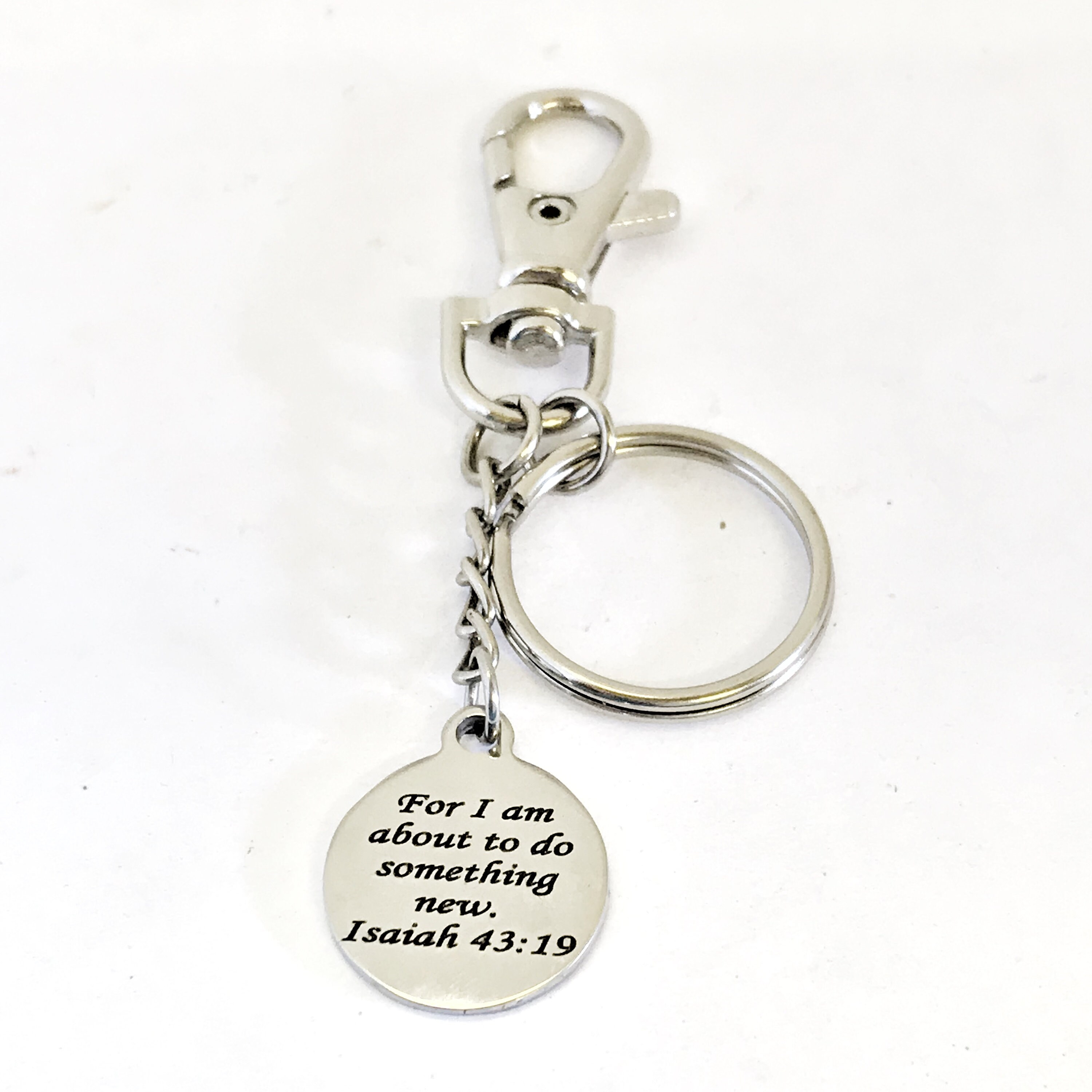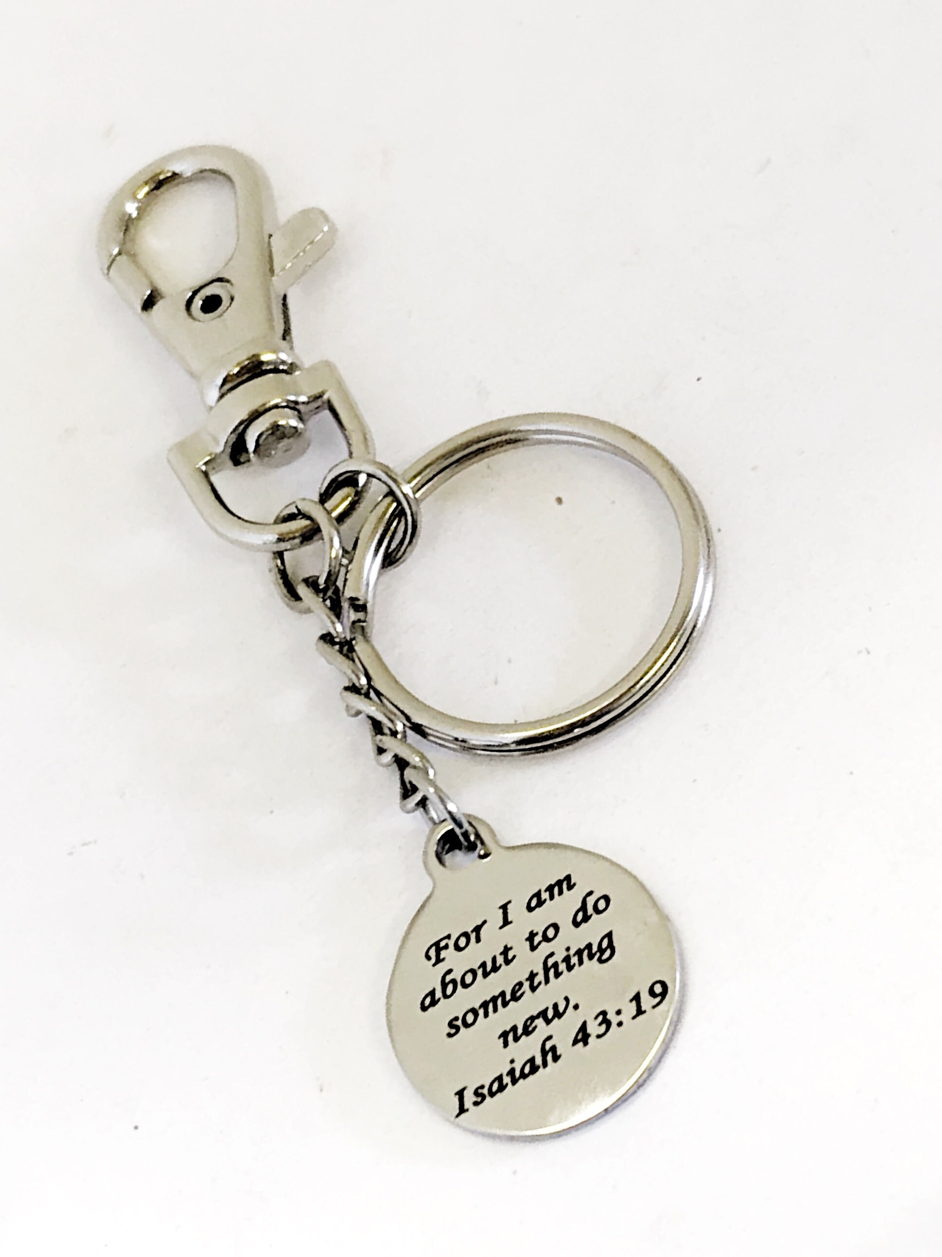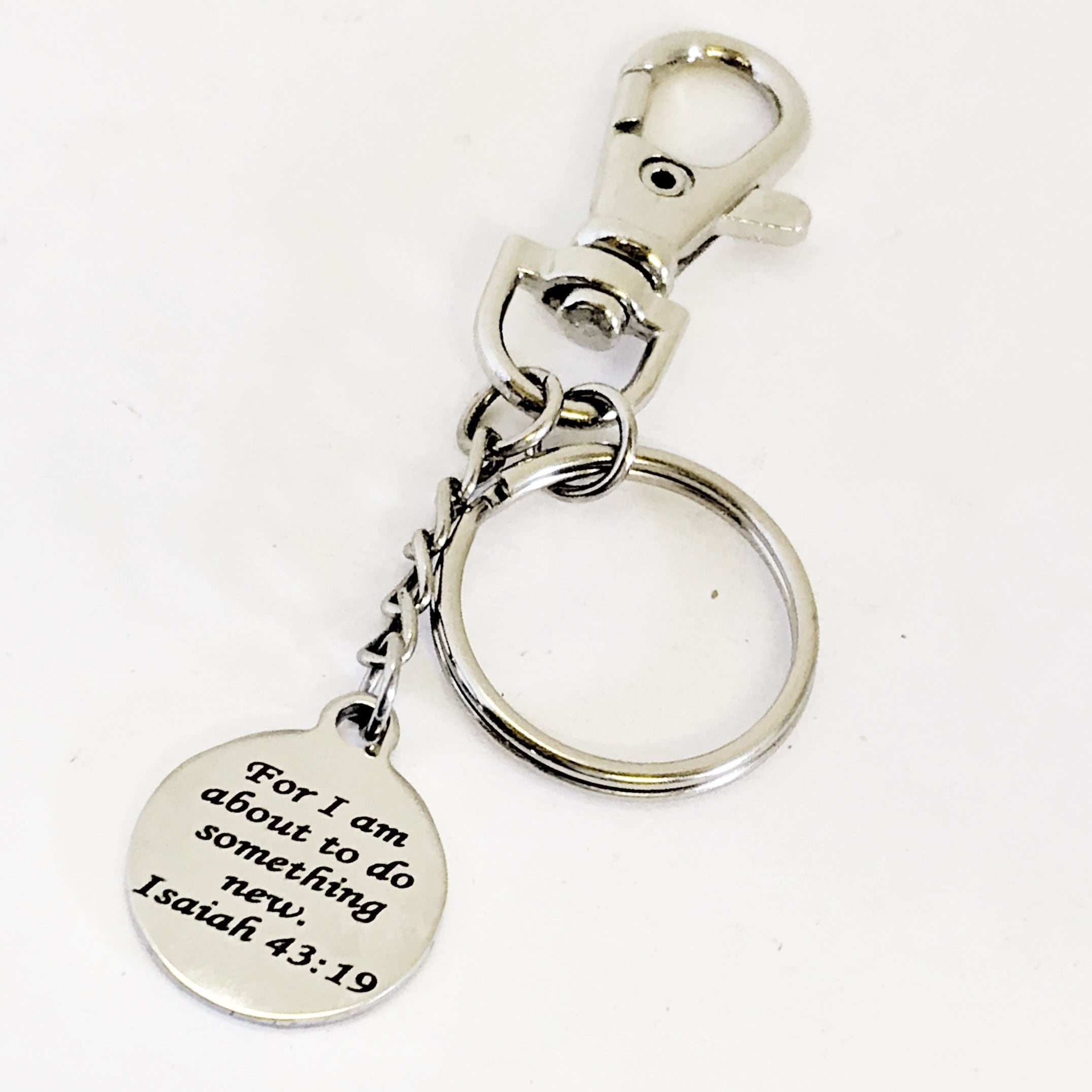 This is a great Christian keychain gift . The keyring can be clipped onto your bag to make it easy to access without digging to the bottom of the bag. It has a stainless steel laser engraved charm with “For I am about to do something new” from Isaiah 43:19 on it.