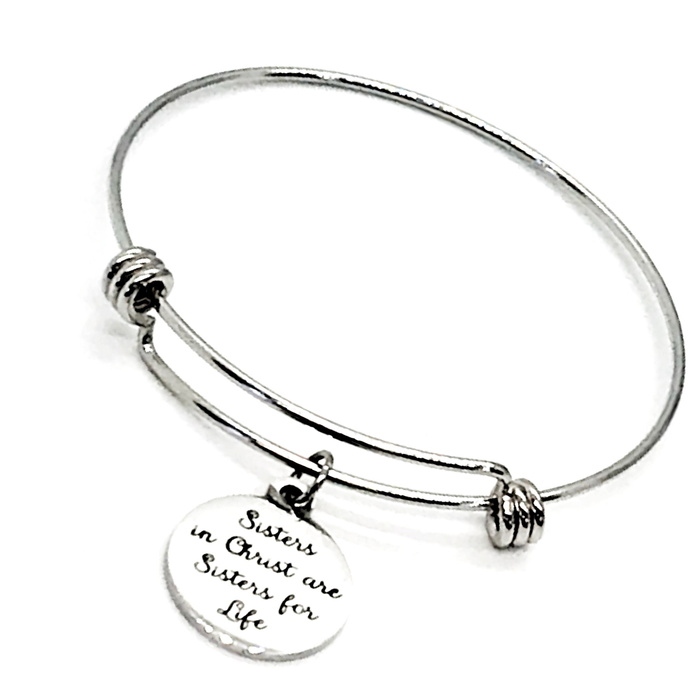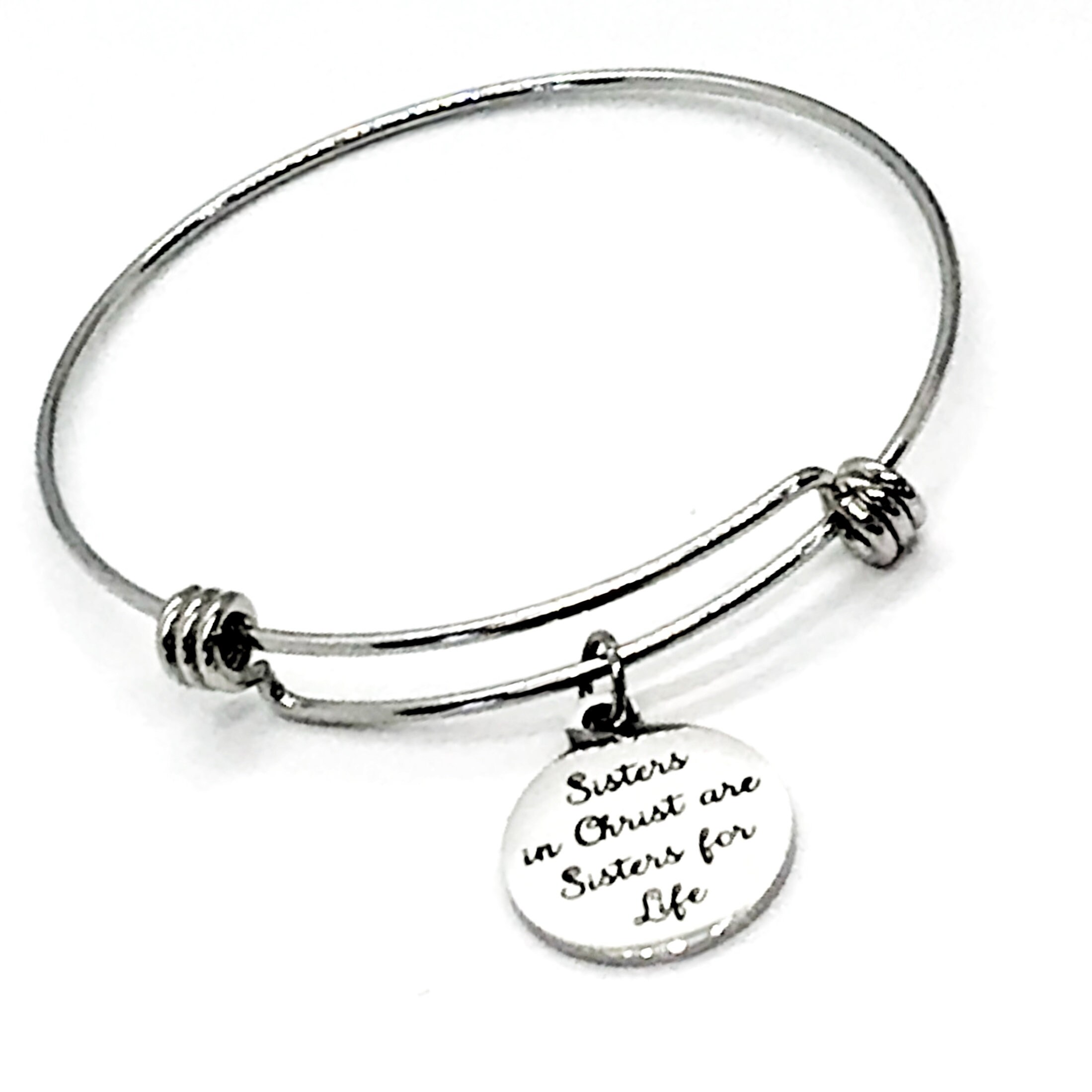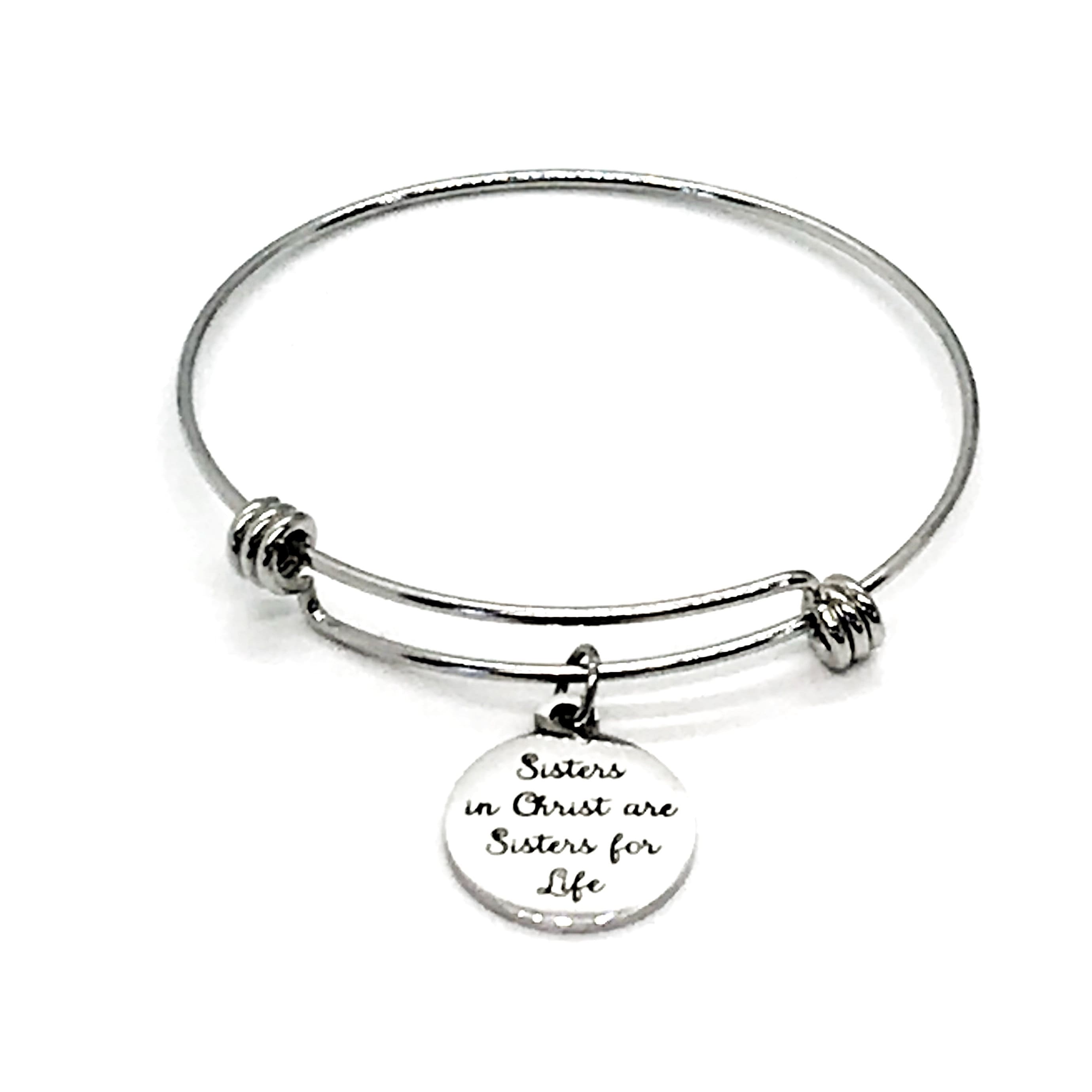 This stacking bangle charm bracelet jewelry gift would be a great baptism gift or gift for a Christian women’s bible study group. It has a stainless steel laser engraved charm with “Sisters in Christ are sisters for life” on it.