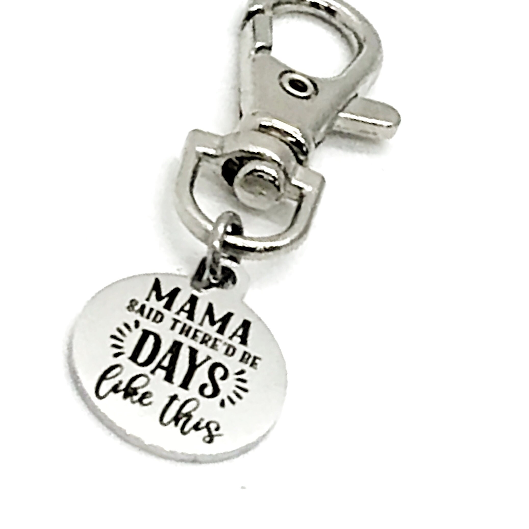 This is a great zipper pull or bag charm clip gift that would be perfect gift of encouragement. It would be a great charm to clip onto a tote, purse, sports bag, book bag or keychain. It has “Mama said there’d be days like this” on it.
