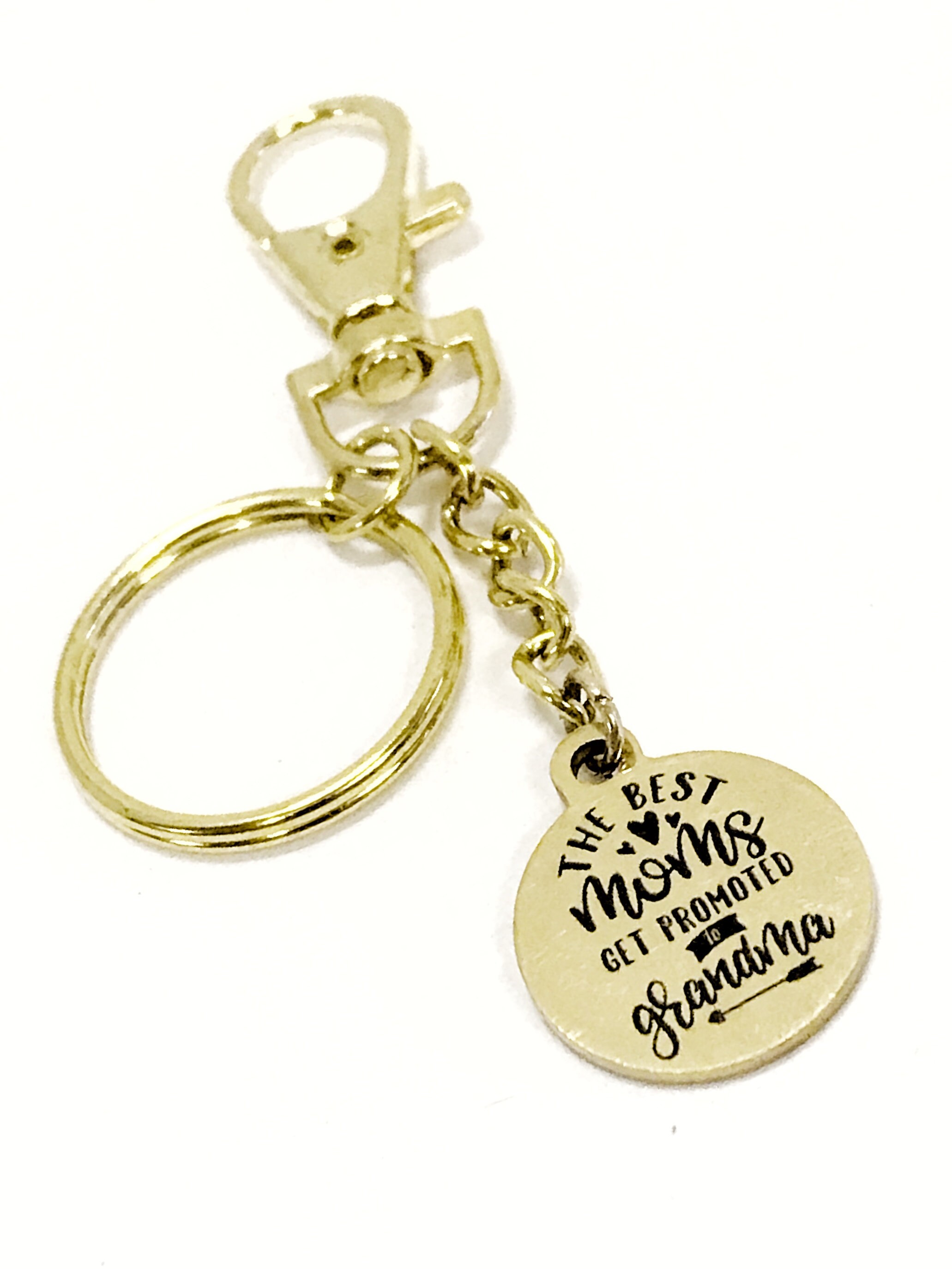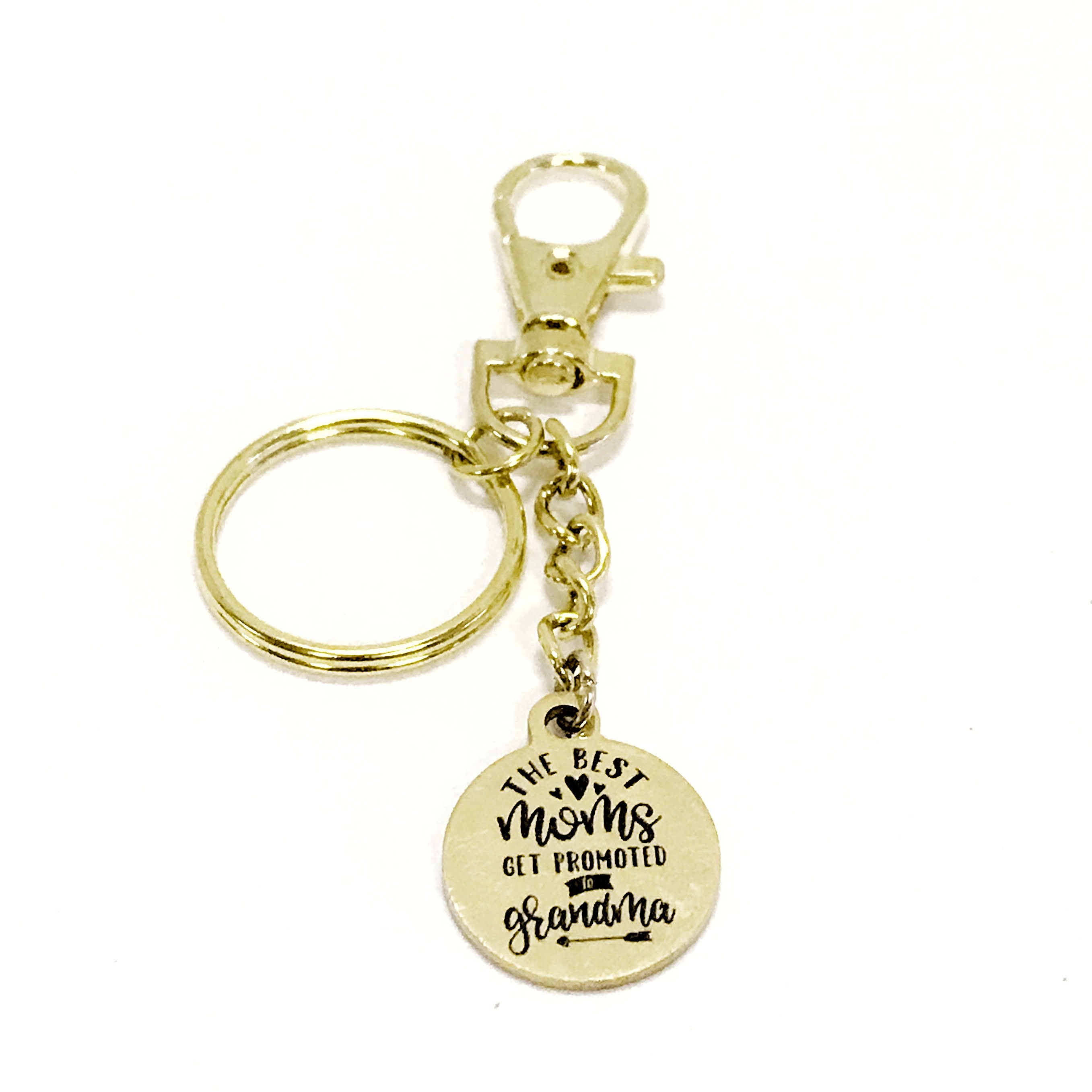 This is a great goldtone keychain gift . The keyring can be clipped onto your bag to make it easy to access without digging to the bottom of the bag. It has a stainless steel laser engraved charm with “The best moms get promoted to Grandma” on it.