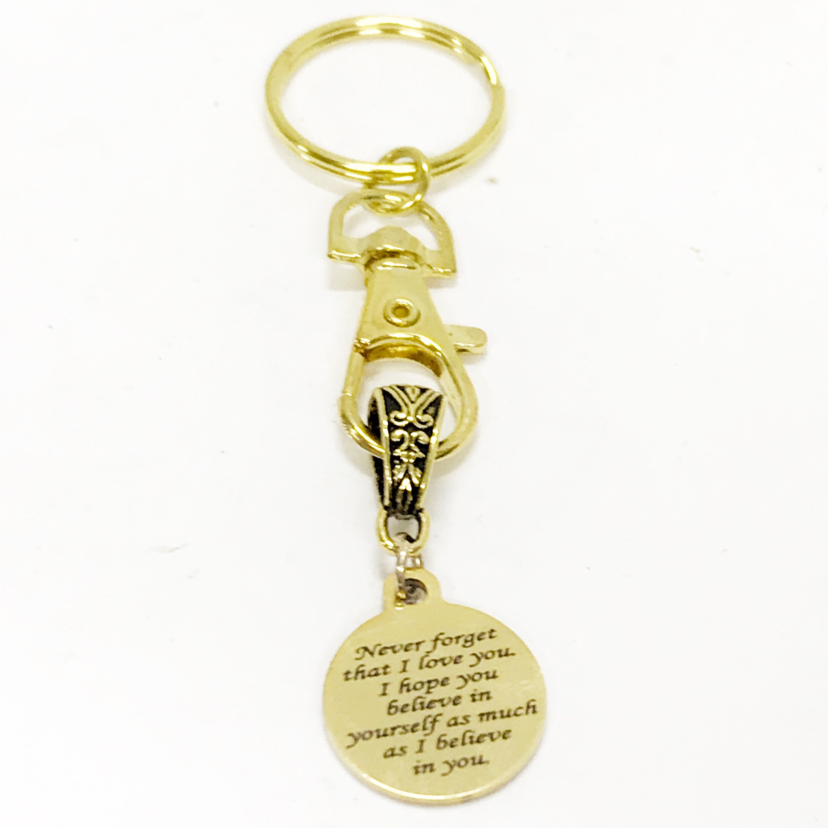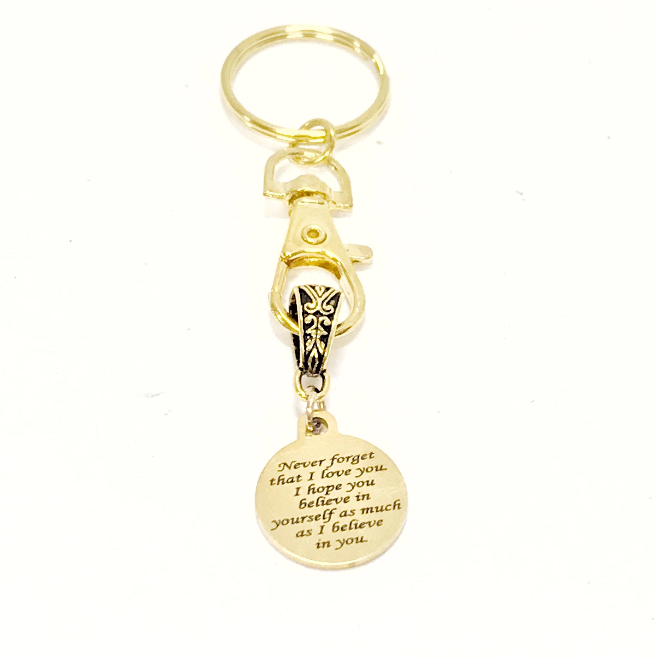 This is a great encouragement keychain that has a goldtone stainless steel laser engraved charm which says, "Never forget that I love you. I hope you believe in yourself as much as I believe in you" on it.