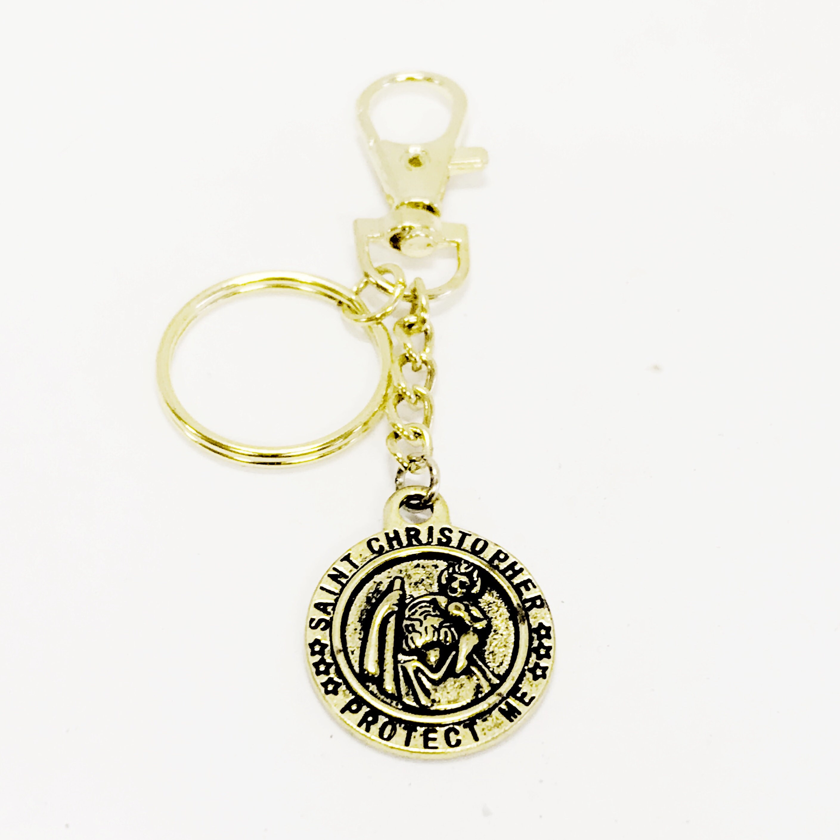 This is a great goldtone keychain gift . The keyring can be clipped onto your bag to make it easy to access without digging to the bottom of the bag. It has a St. Christopher charm on it.