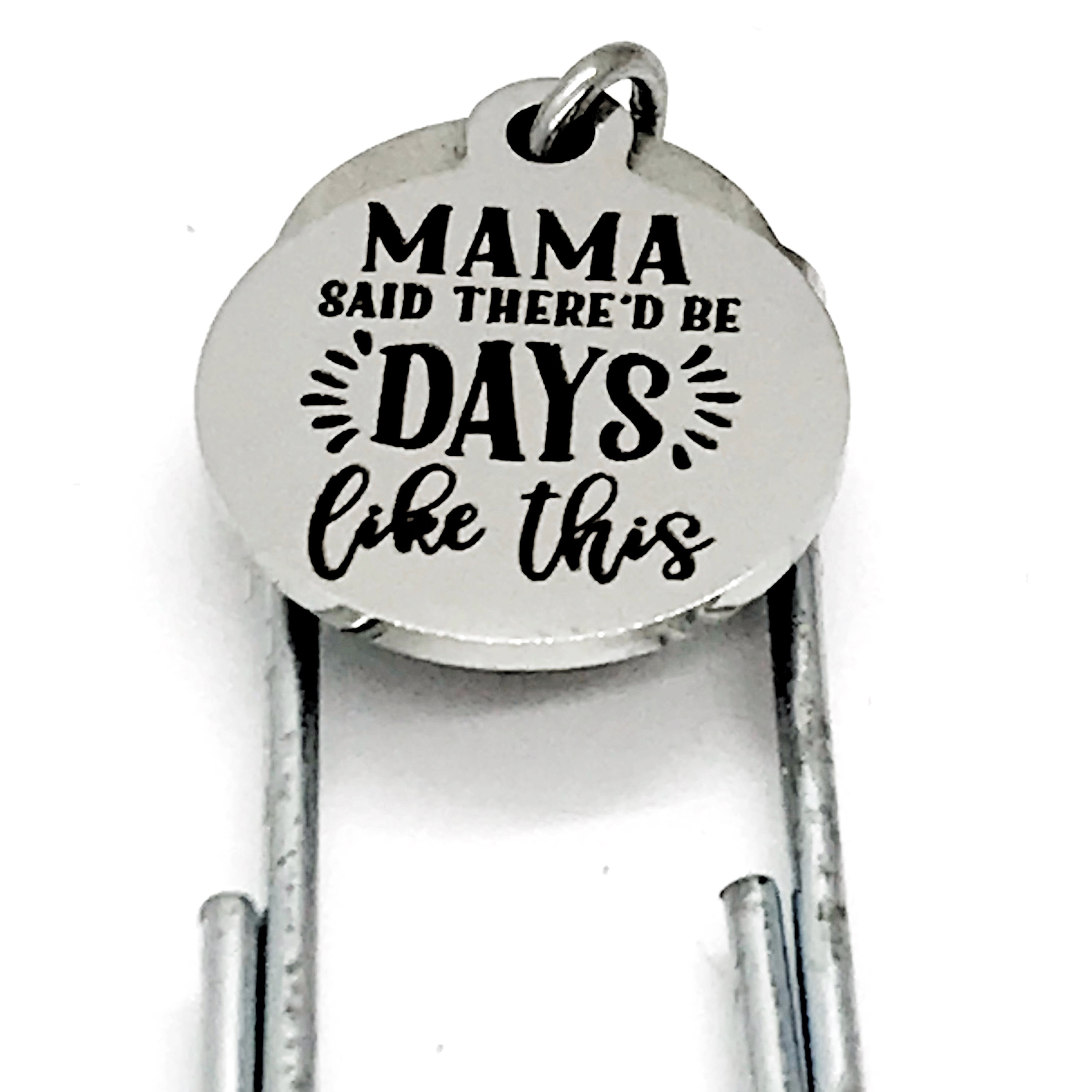 This is a gift for someone that loves planner bookmarks or reads! It is a paperclip charm bookmark . This paper clip bookmark has a stainless steel laser engraved charm with “Mama said there’d be days like this” on it.