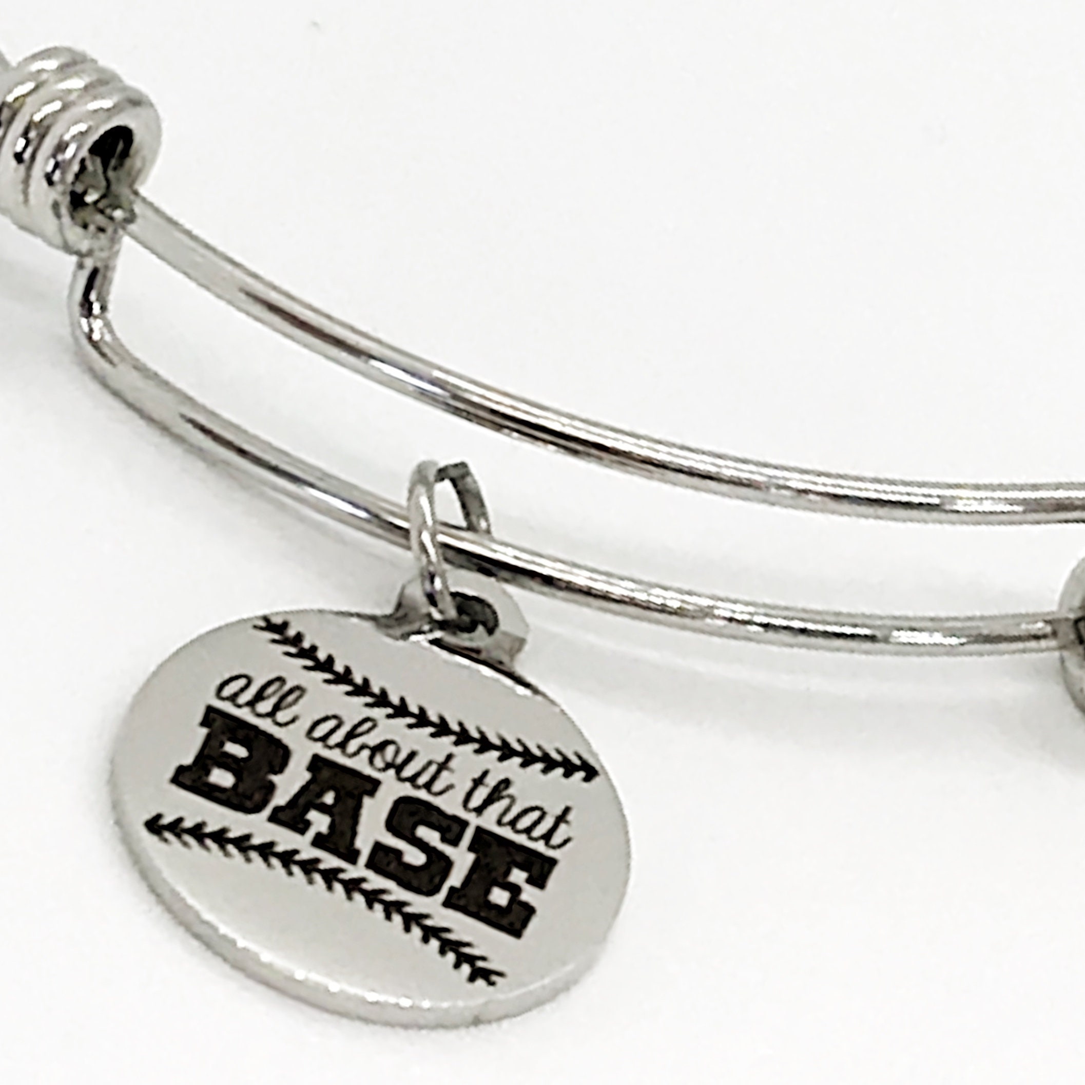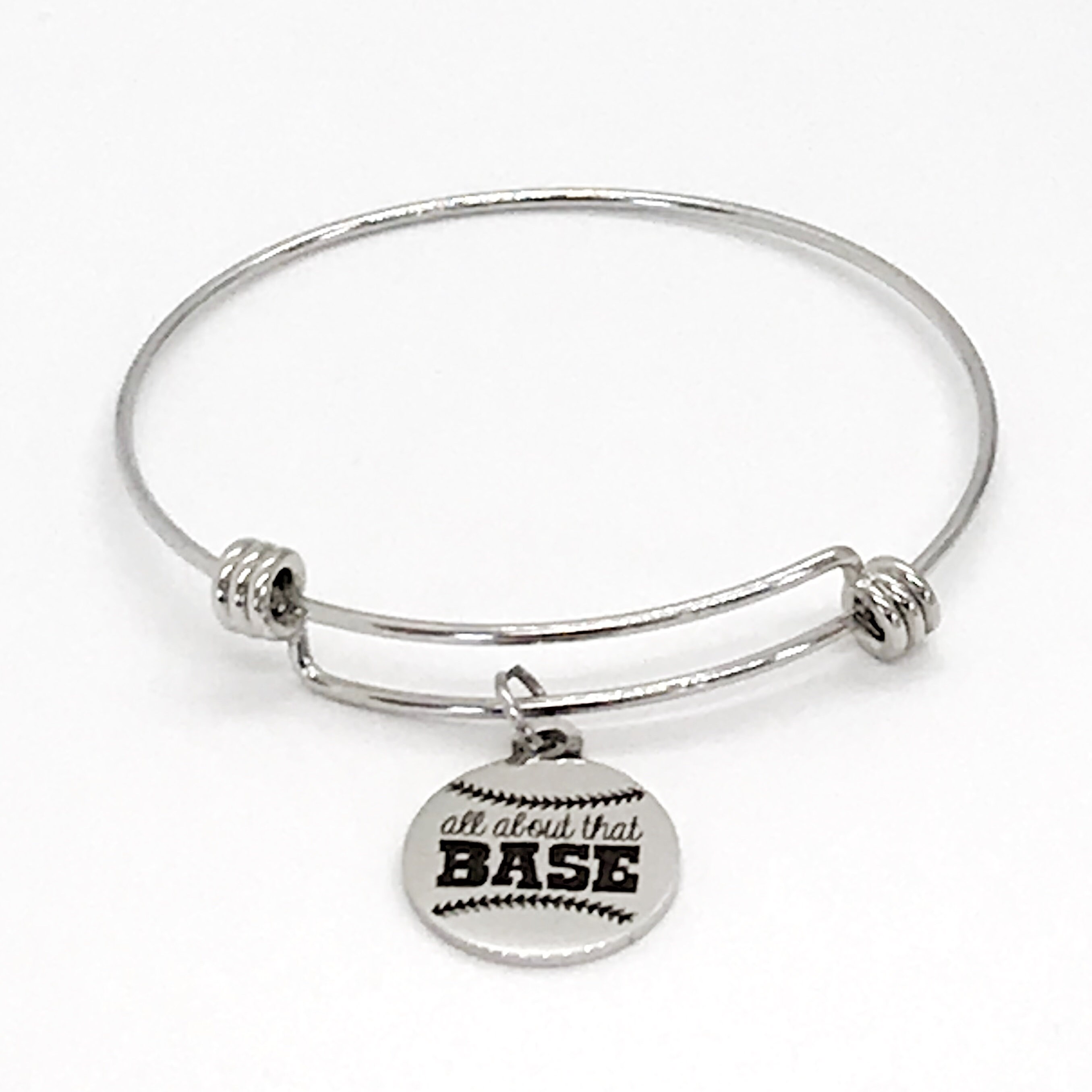 This is a beautiful bangle bracelet with a laser engraved stainless steel charm that has "All about that Base" on it.