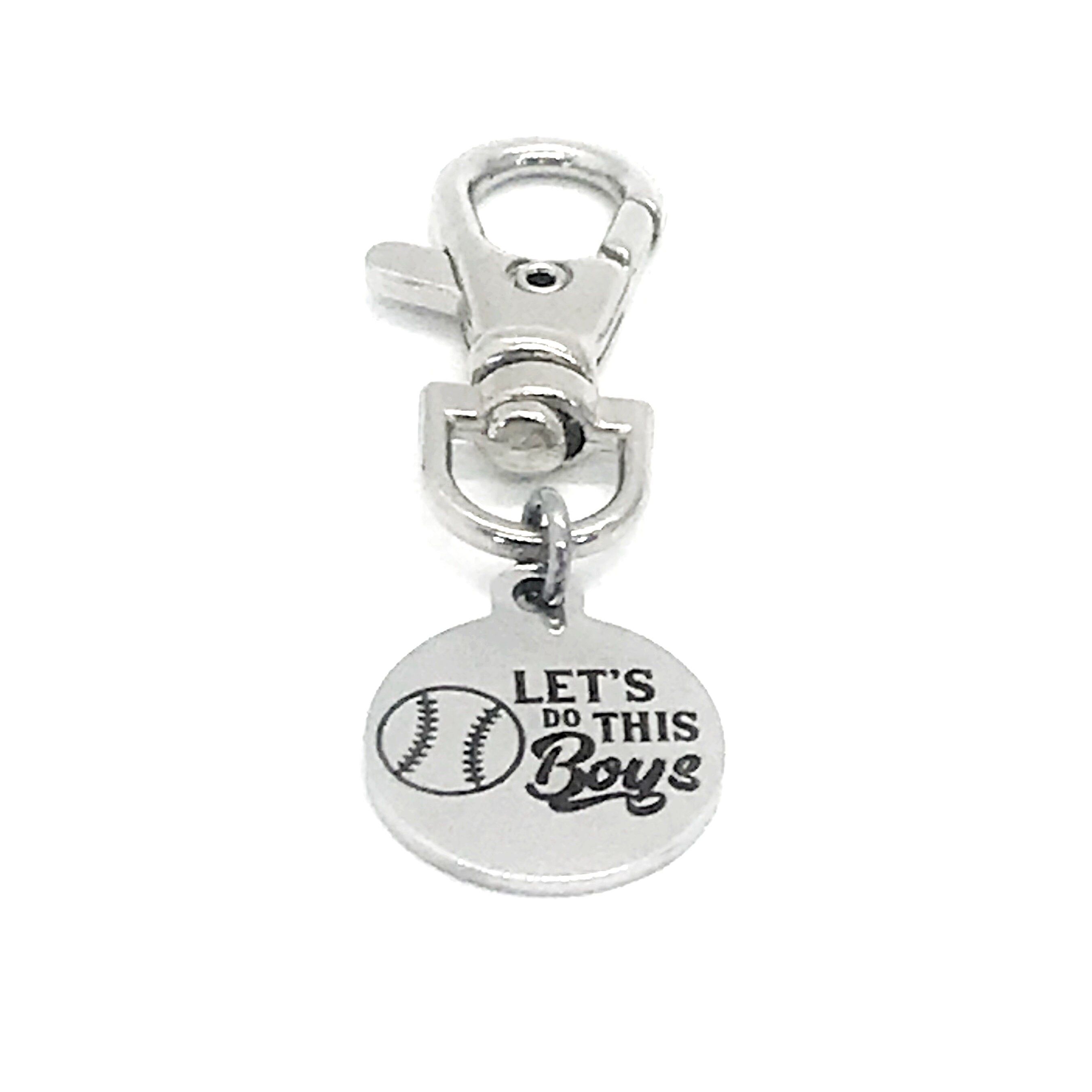 This is a great zipper pull or bag charm clip gift that would be a great gift for a baseball player or baseball mom. It would be a great charm to clip onto a tote, purse, sports bag, book bag or keychain. It has a stainless steel laser engraved charm with “Let’s do this boys” on it.