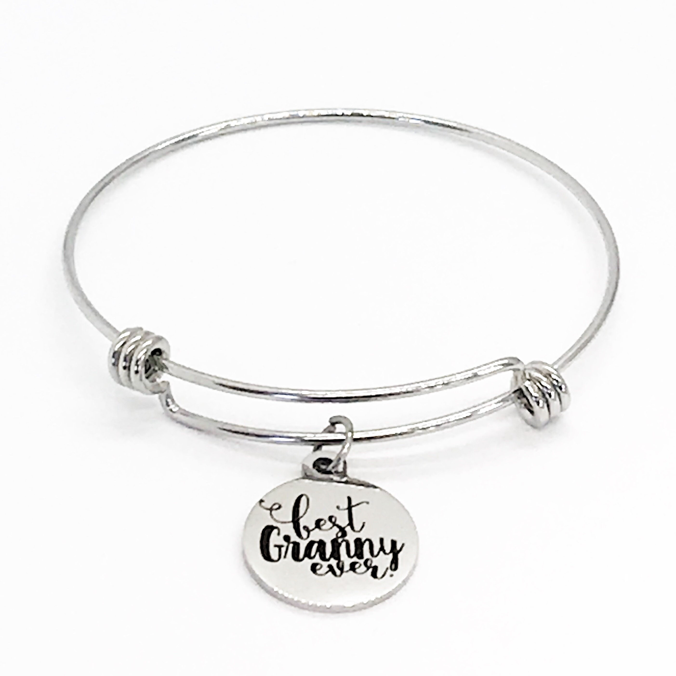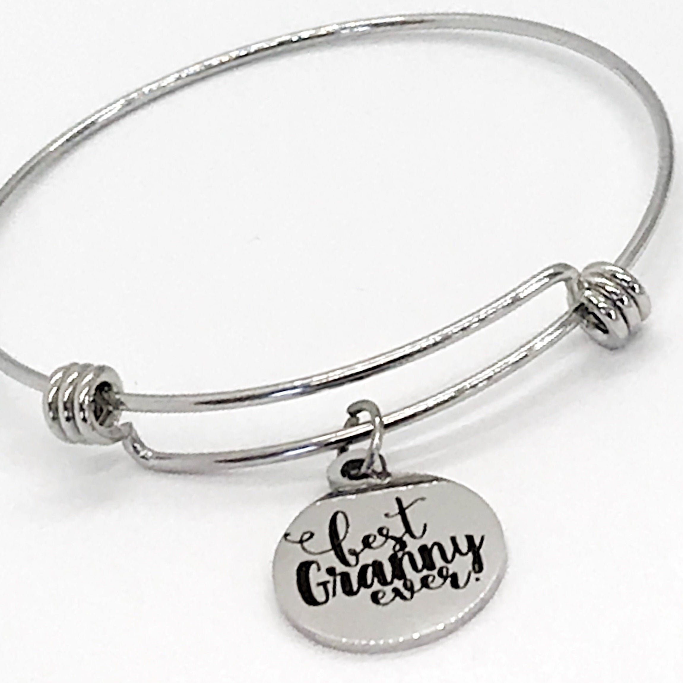 This is a beautiful bangle bracelet with a laser engraved stainless steel charm that has "Best Granny Ever" on it.