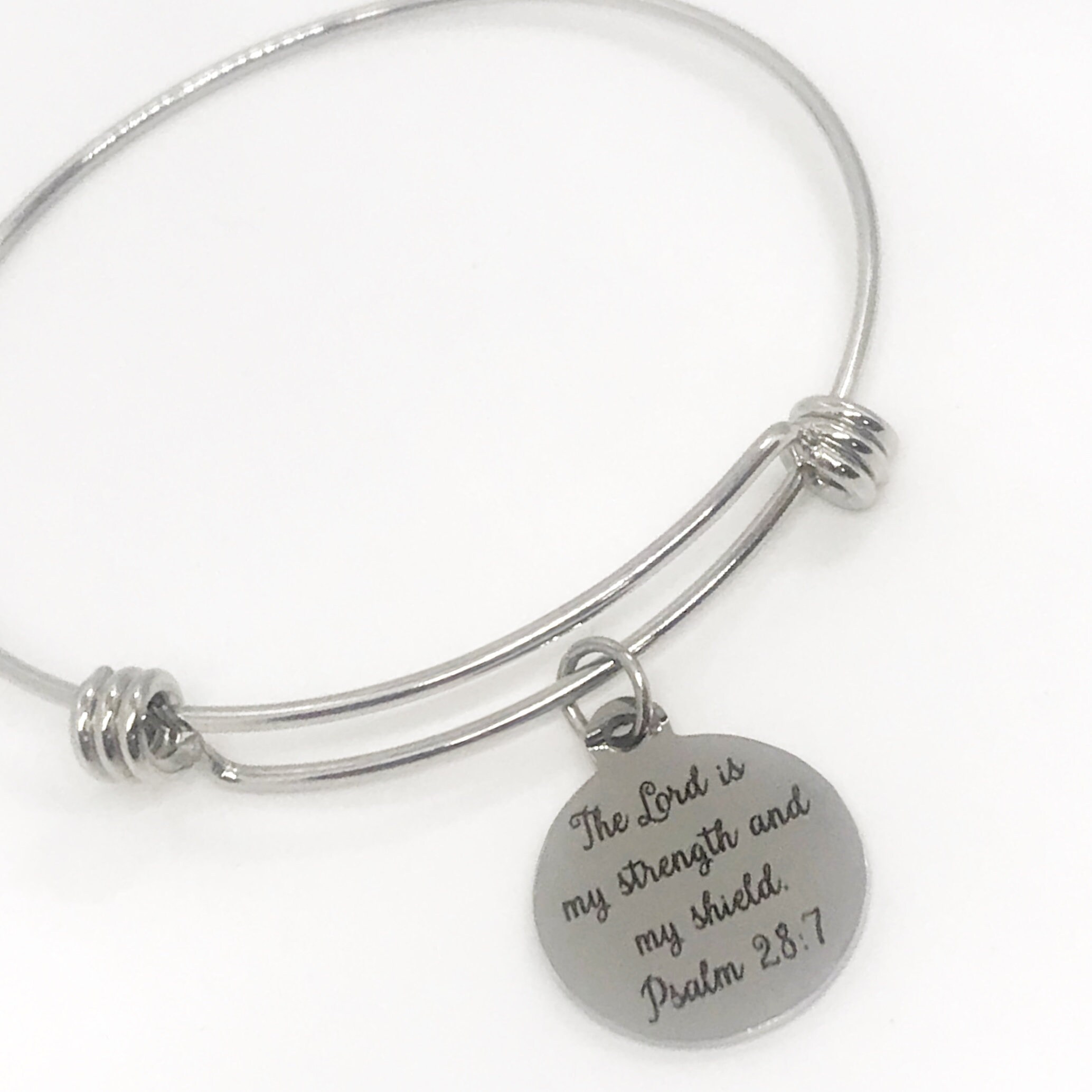 This stacking bangle charm bracelet jewelry gift would be a great baptism gift or gift for a Christian women’s bible study group. It has a stainless steel laser engraved charm with “The Lord is my strength and my shield” from Psalm 28:7 on it.
