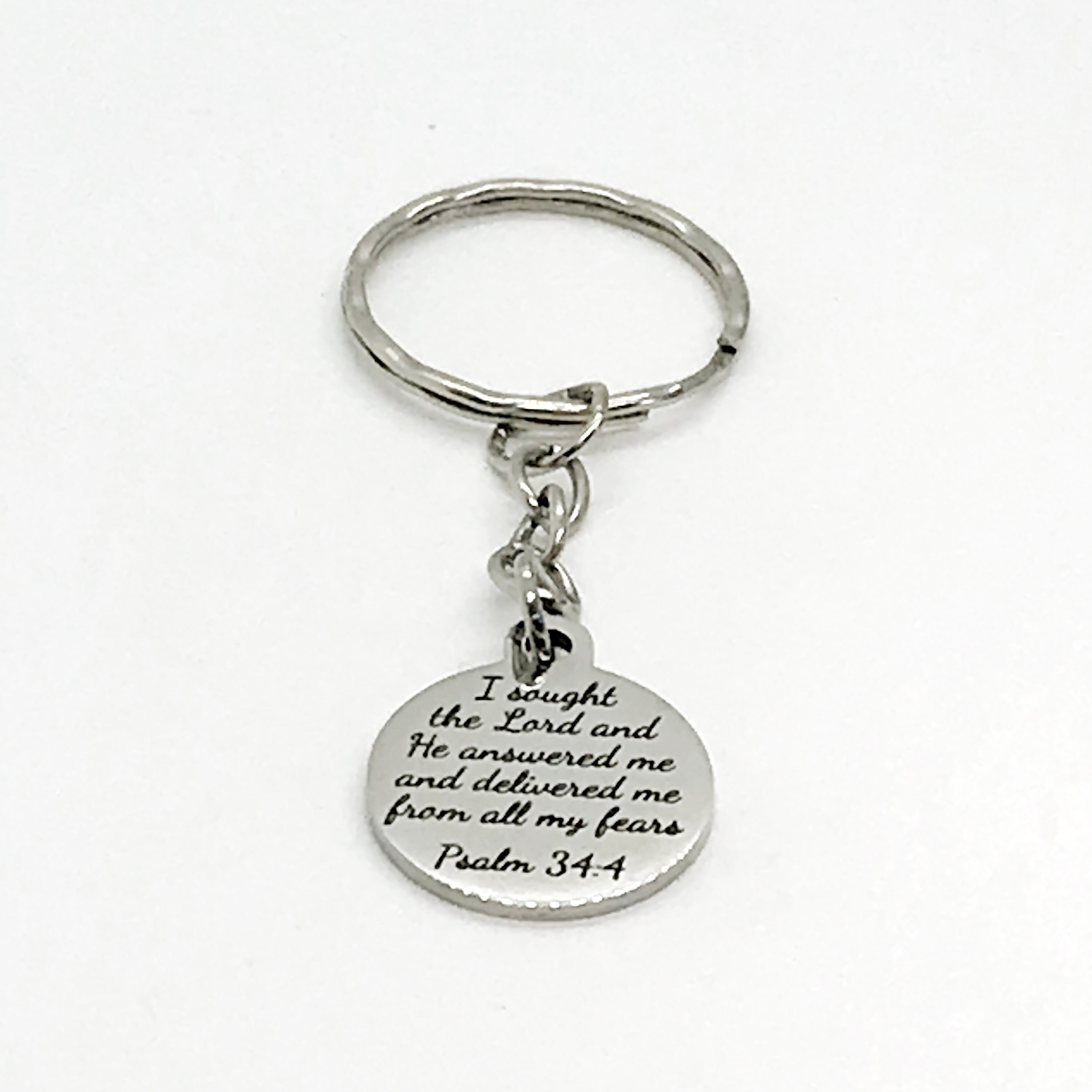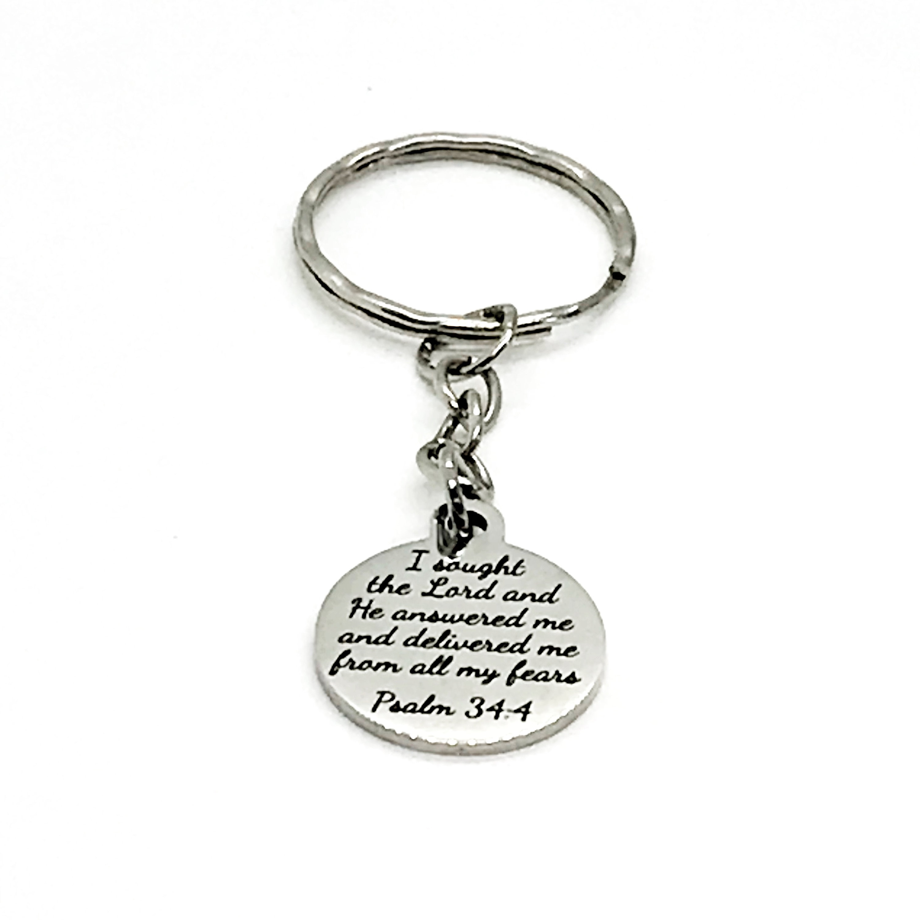 This is a great scripture keychain gift. It has a stainless steel laser engraved charm that says, “I sought the Lord and He answered me and delivered me from all my fears” from Psalm 34:4.