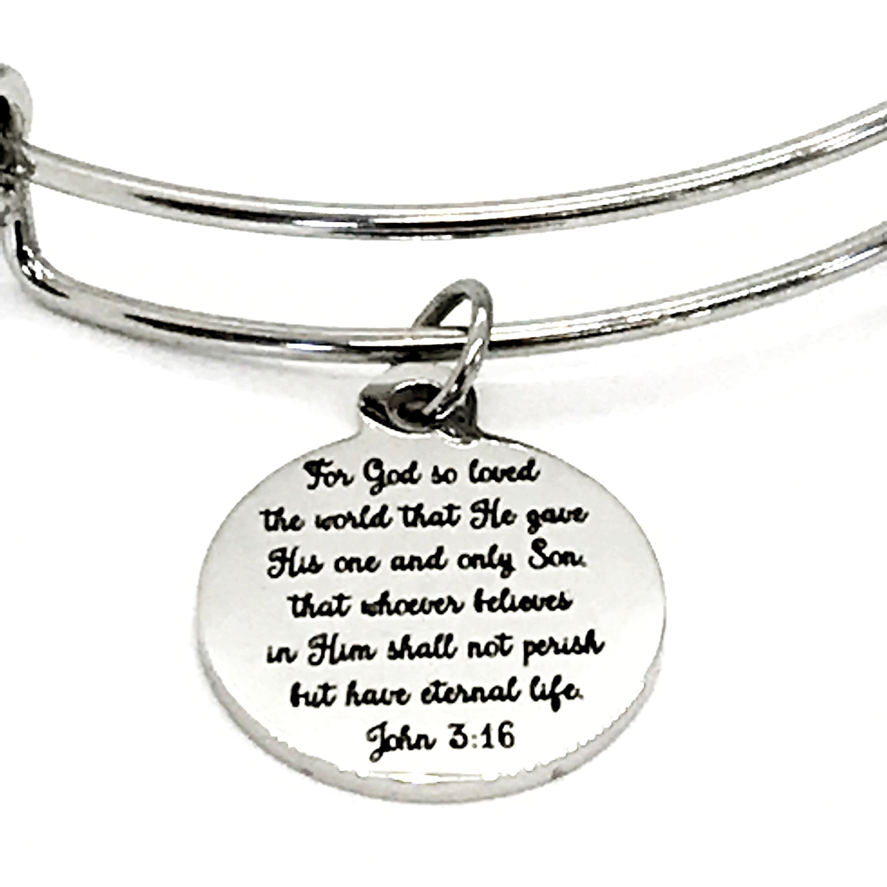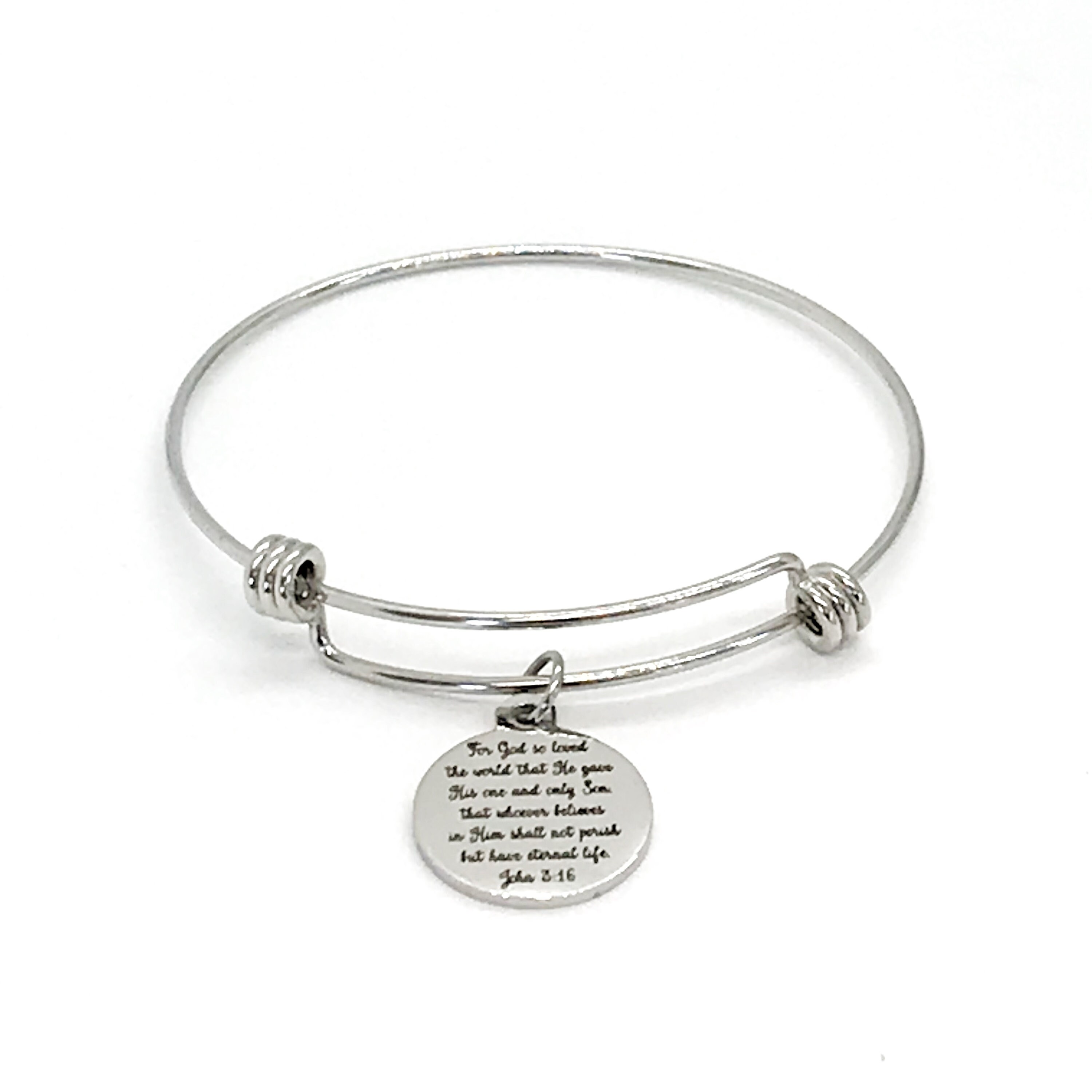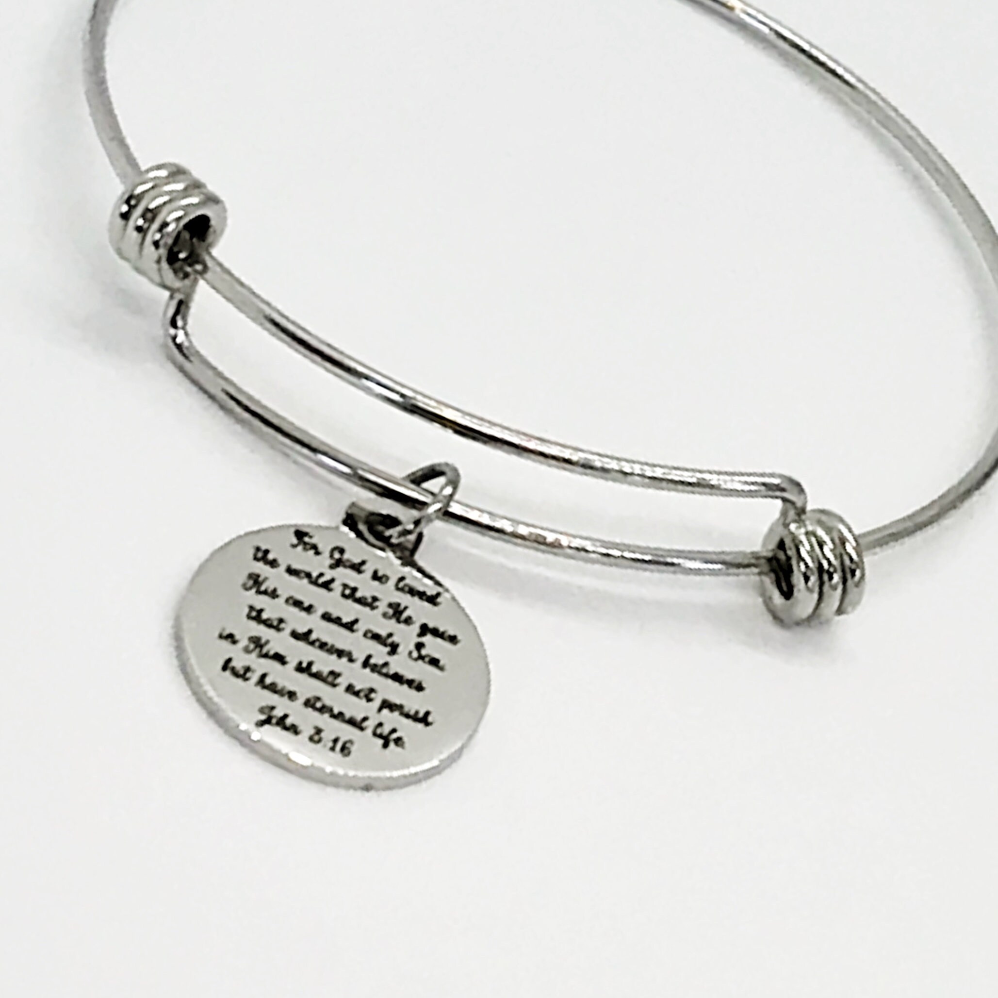 This is a beautiful bangle bracelet with a laser engraved stainless steel charm that has "For God so loved the world that He gave His only Son that whoever believes in Him shall not perish but have eternal life" from John 3:16 on it.
