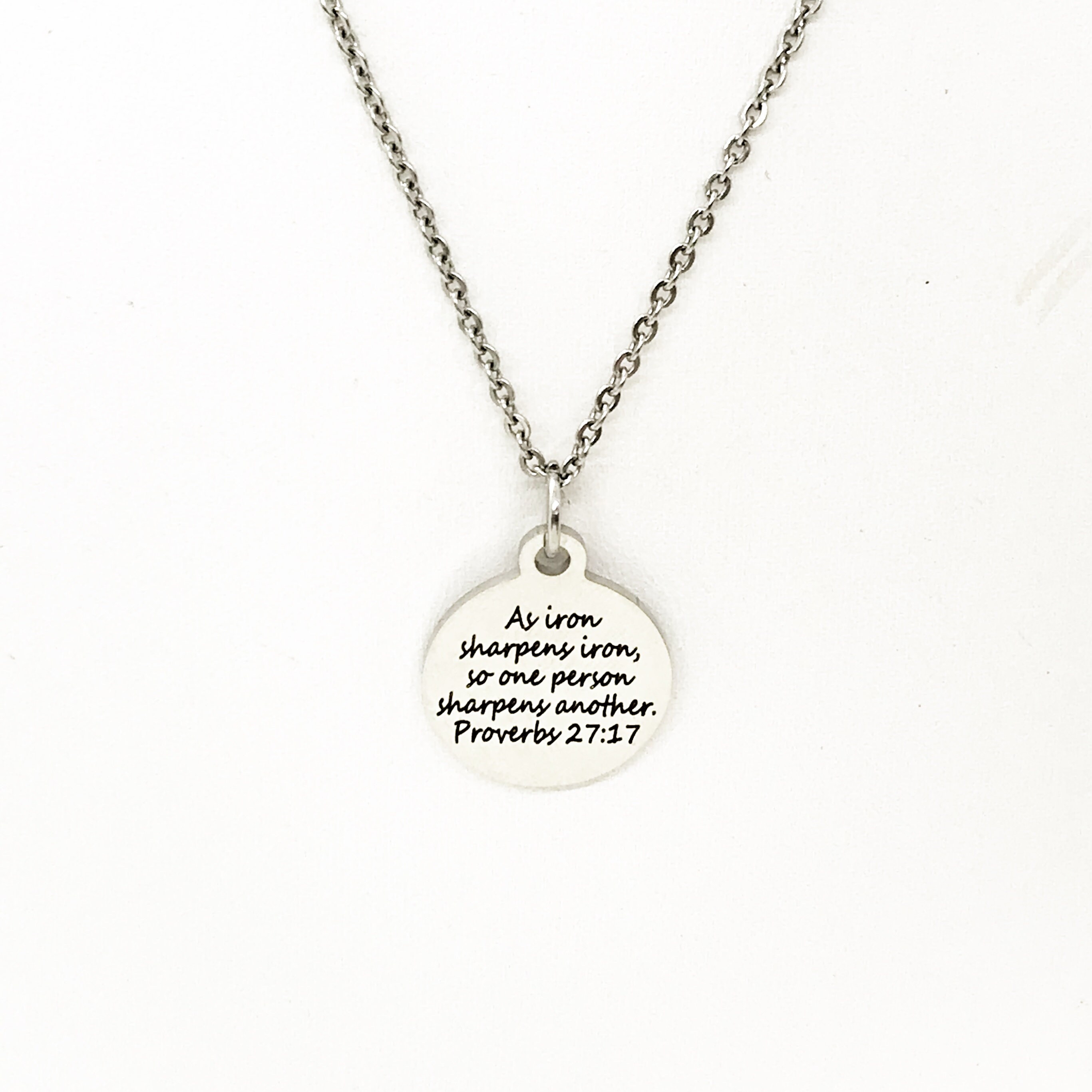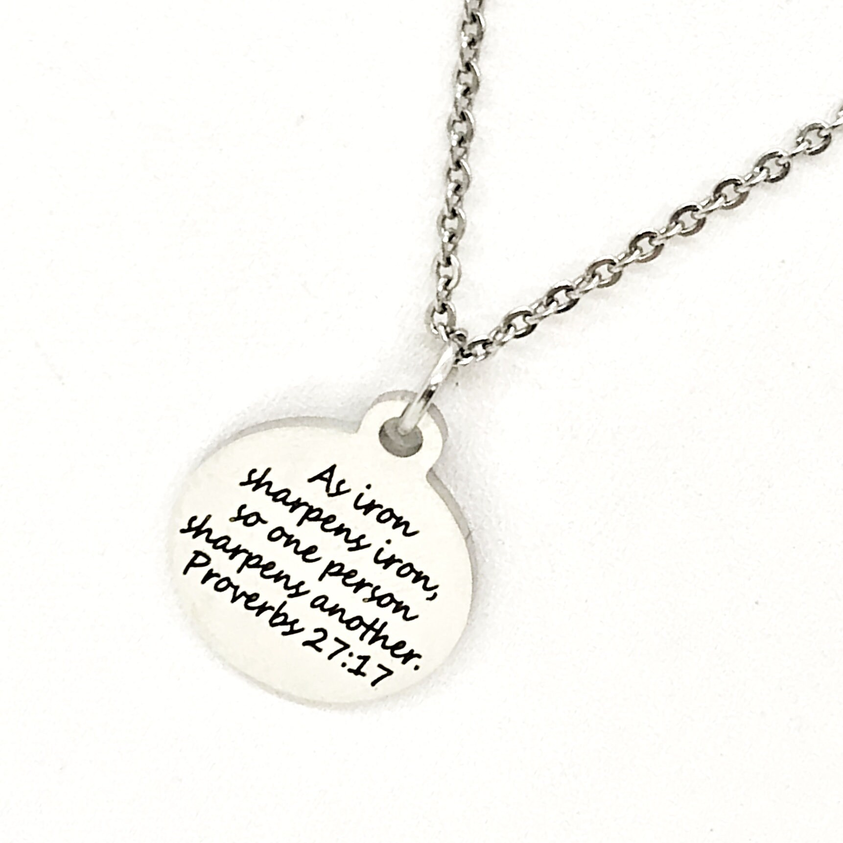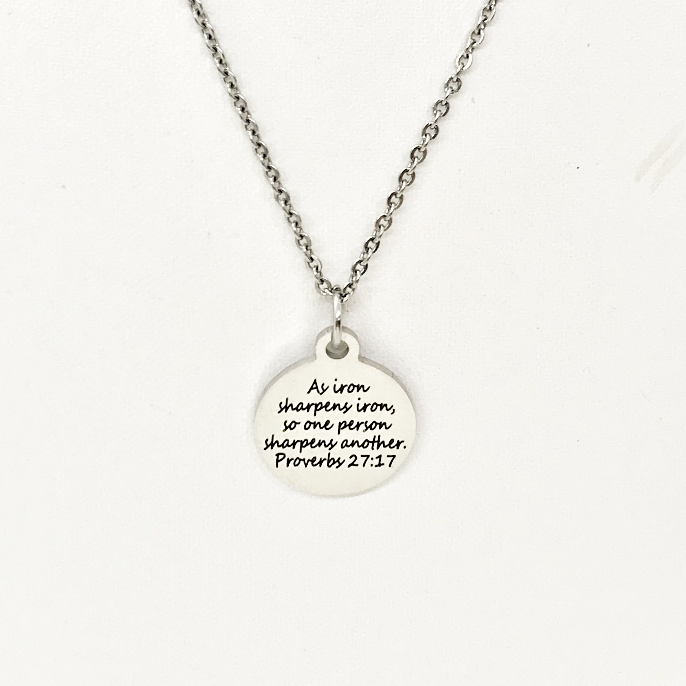 This necklace would make a wonderful baptism or confirmation gift. The pendant is a stainless steel laser engraved charm with “As iron sharpens iron, so one person sharpens another” from Proverbs 27:17 on it.