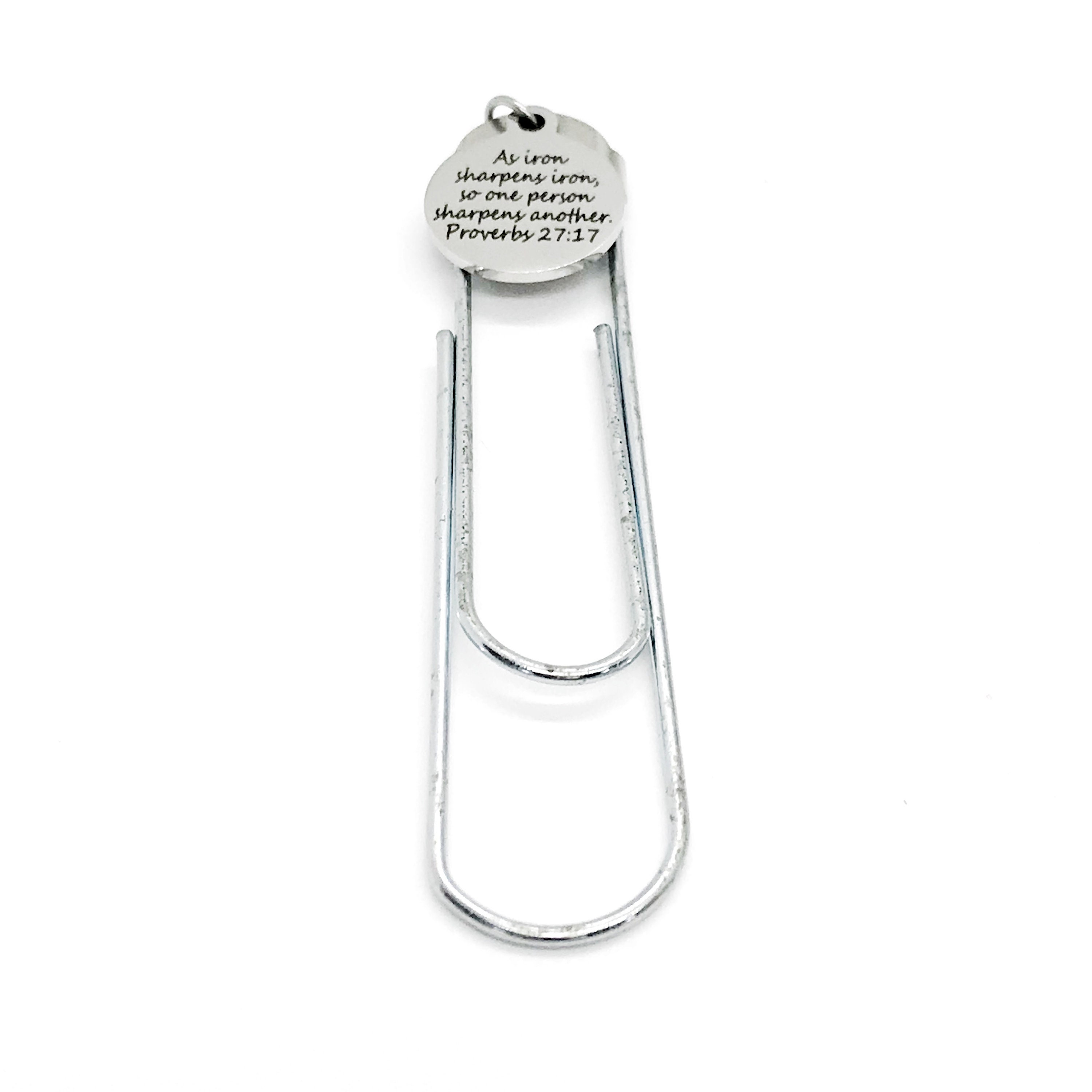 This bookmark has stainless steel laser engraved charm that says, “As iron sharpens iron, so one person sharpens another” from Proverbs 27:17 on it. This would be a great way to encourage someone.