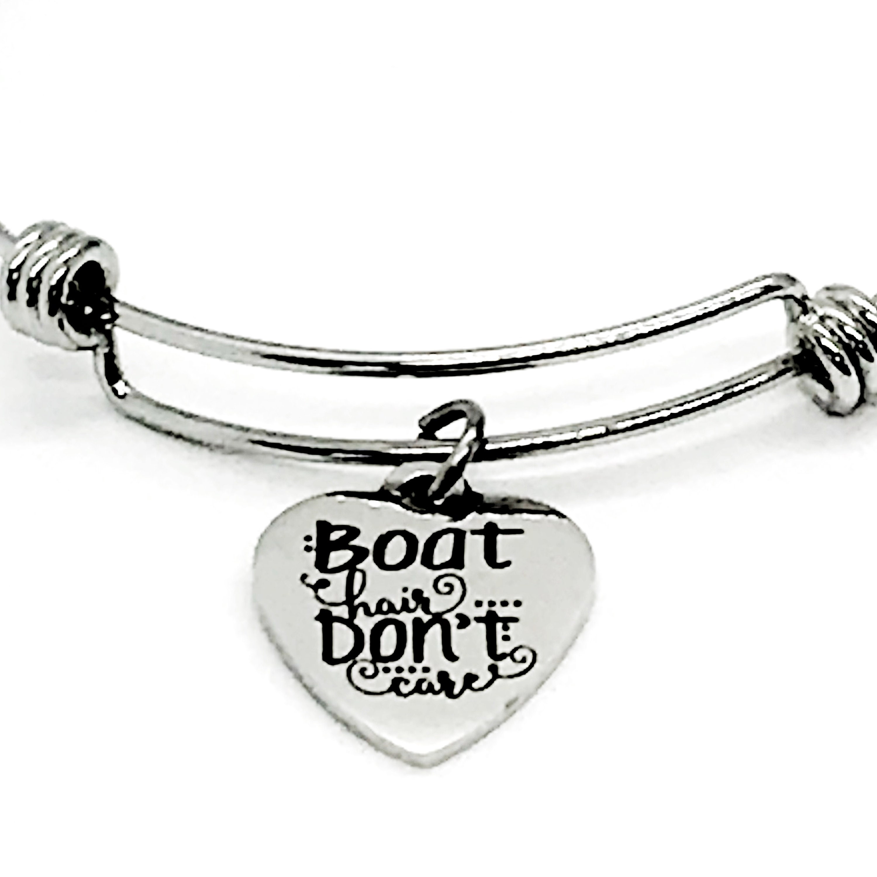 This is a beautiful stacking bangle charm bracelet with a stainless steel laser engraved charm that has “Boat Hair Don’t Care” on it.