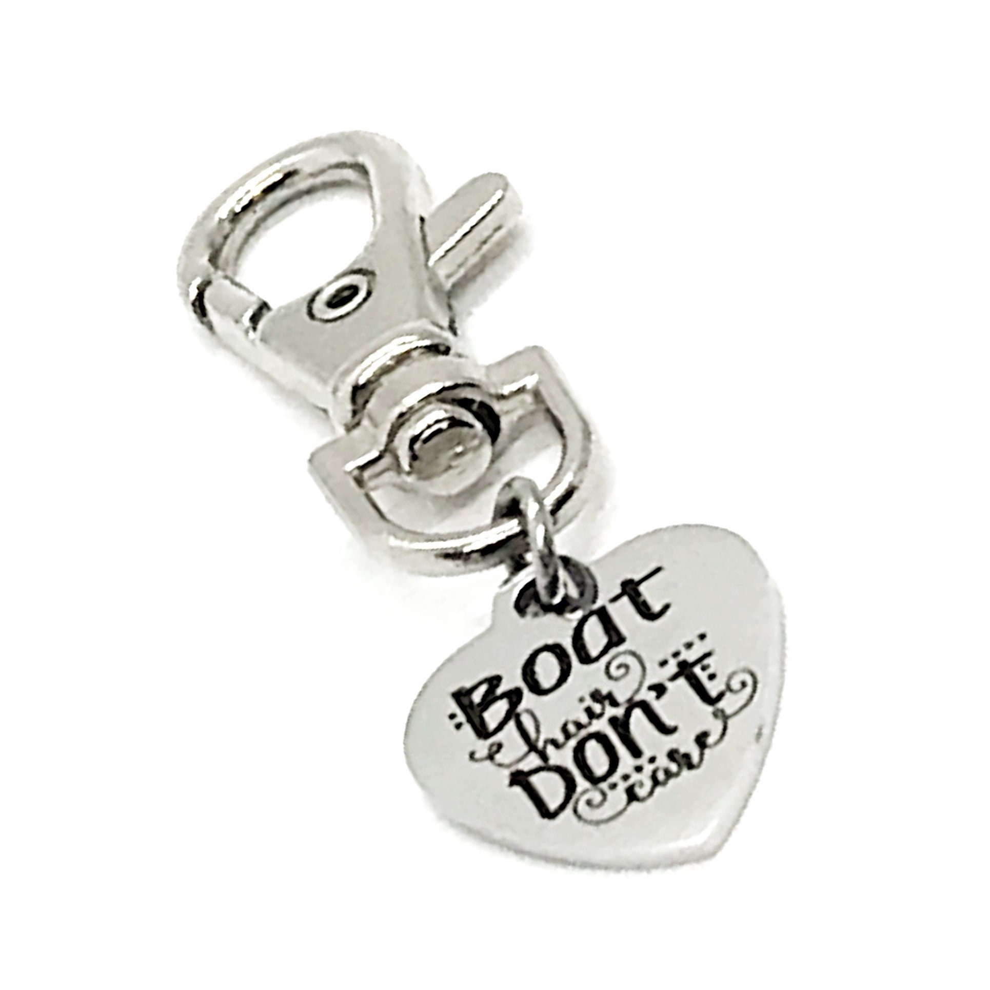 This is a great zipper pull or bag charm clip gift that would be a great gift for someone that loves the beach or boat life. It would be a great charm to clip onto a tote, purse, sports bag, book bag or keychain. It has a stainless steel laser engraved charm with “Boat hair don’t care” on it.