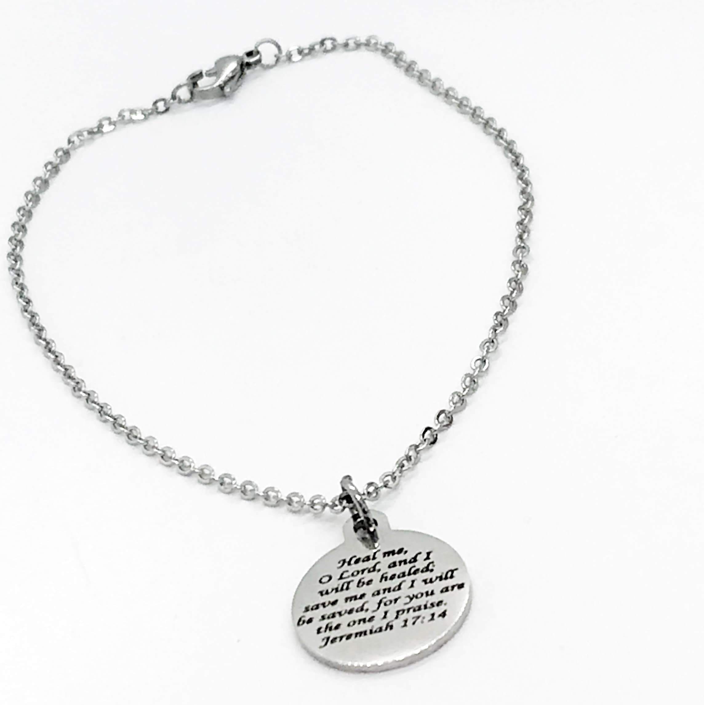 This is a beautiful stainless steel charm bracelet with “Heal me, O Lord and I will be healed; save me and I will be saved for you are the one I praise” from Jeremiah 17:14 on it.