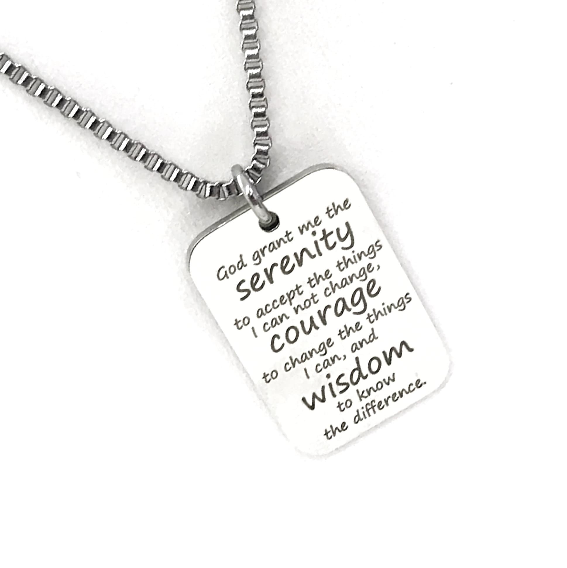 This is great stainless steel necklace for a man. This necklace comes with a stainless steel laser engraved charm pendant on a 22 inch stainless steel box chain. The pendant has The Serenity Prayer on it.