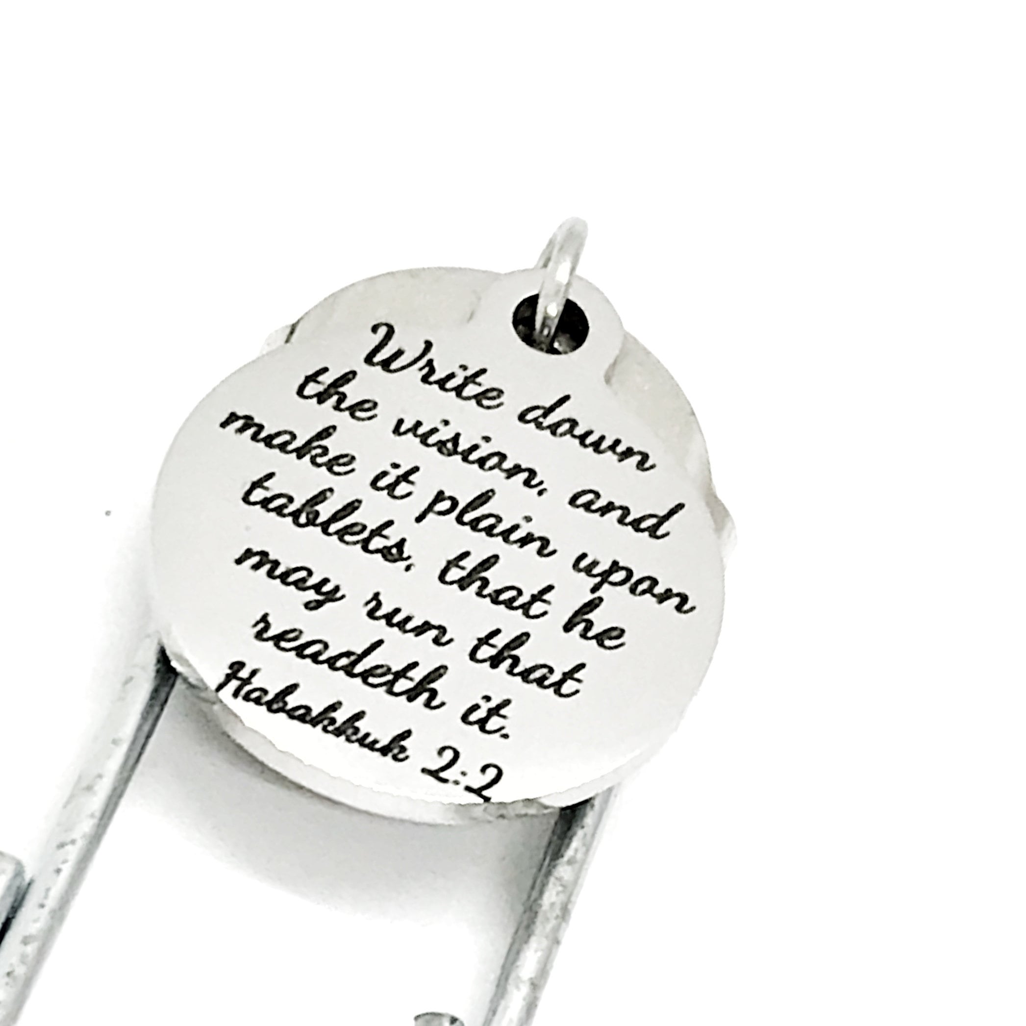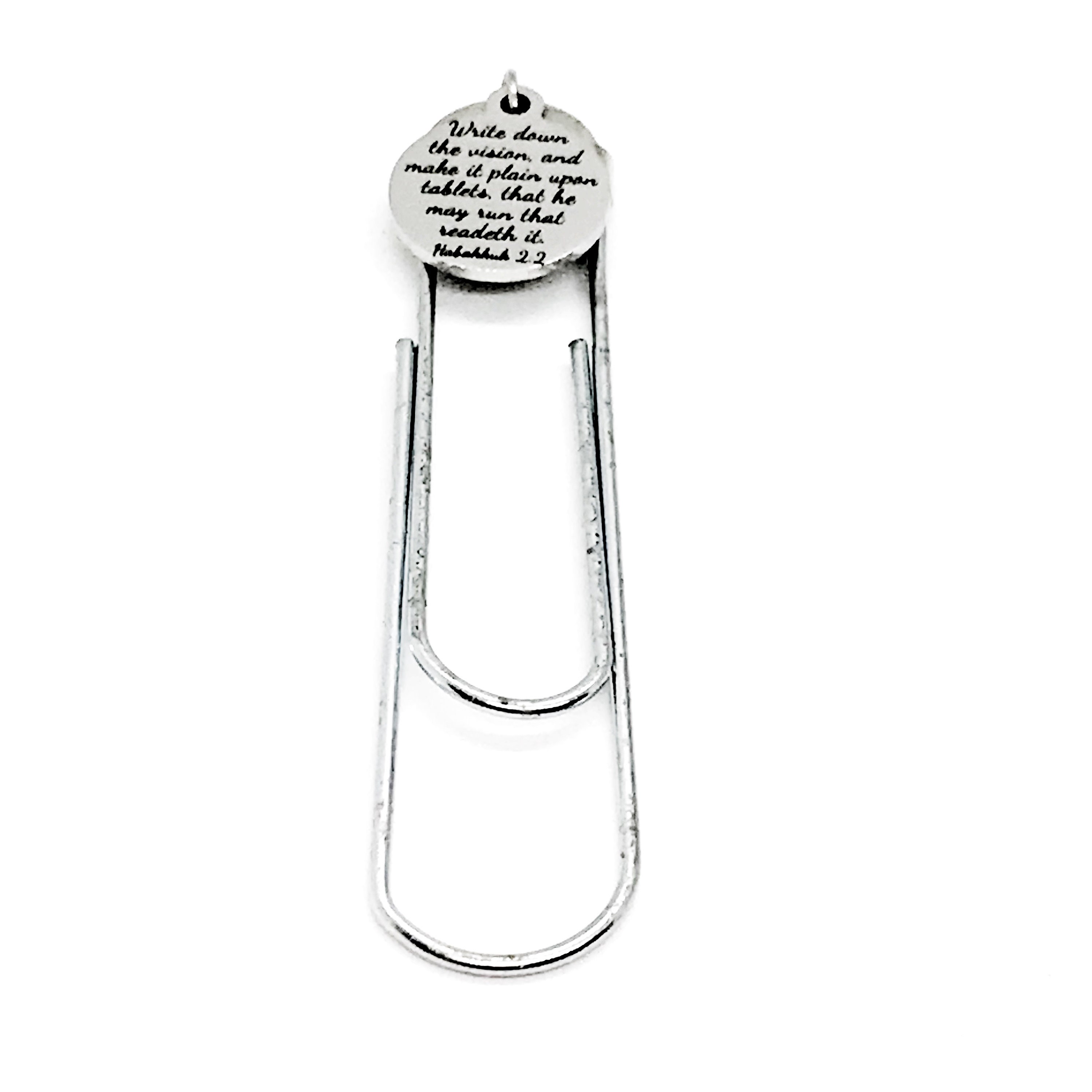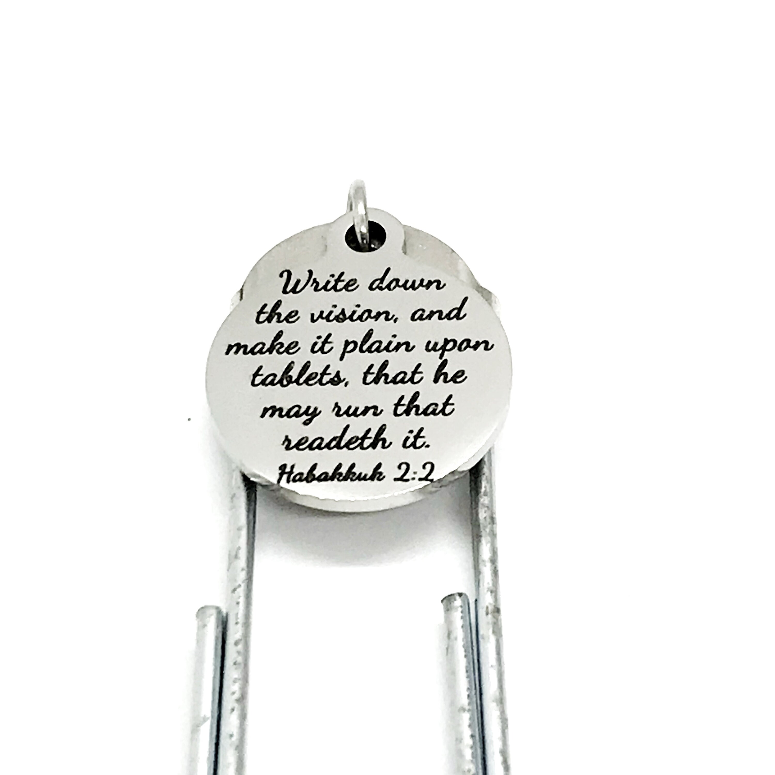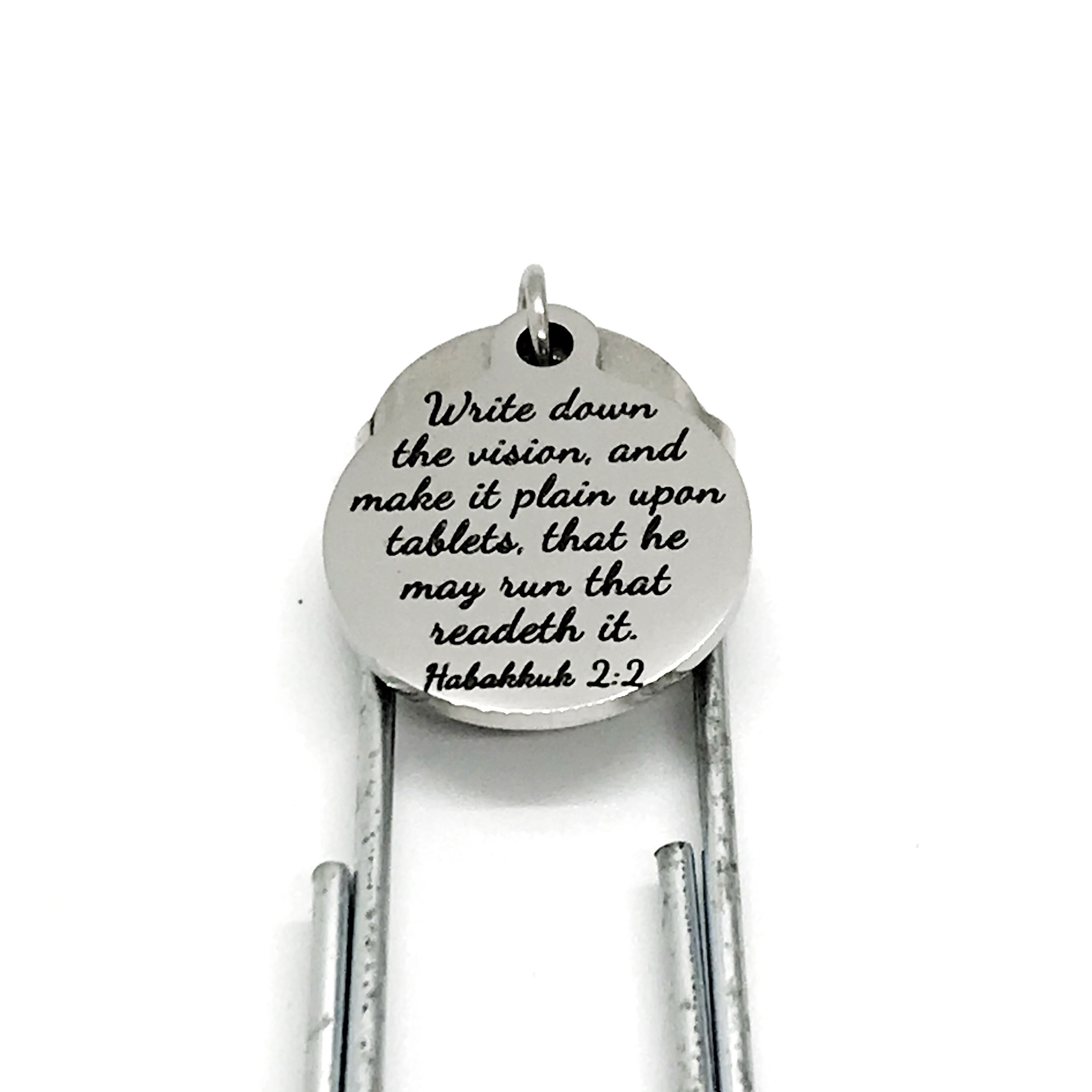 This bookmark has stainless steel laser engraved charm with “Write down the vision and make it plain on tablets, that he may run that readeth it” from Habakkuk 2:2 on it. It would be a great gift of encouragement.