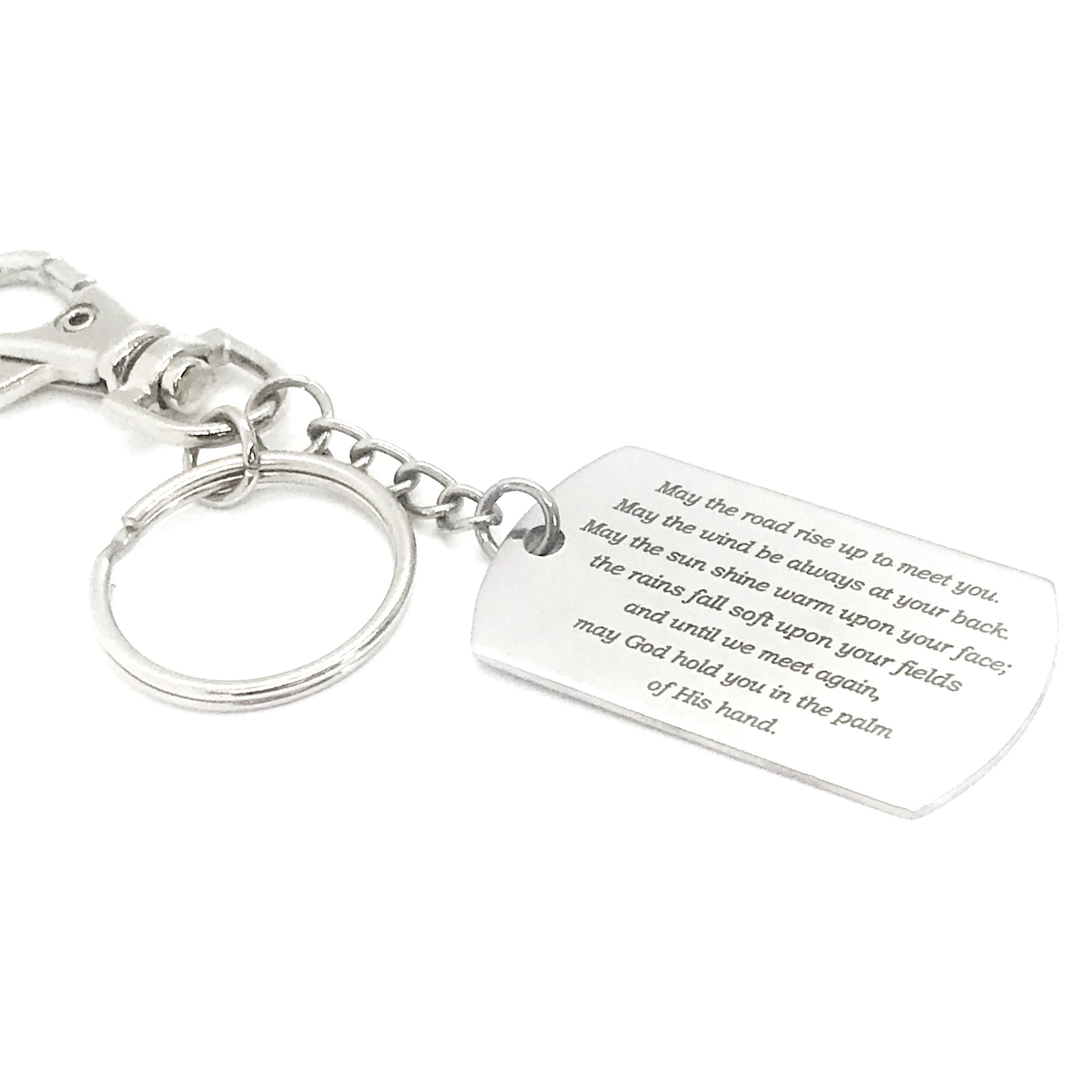 This is a great Irish Blessing keychain gift . The keyring can be clipped onto your bag to make it easy to access without digging to the bottom of the bag. It has a stainless steel laser engraved charm with the following Irish Blessing on it: