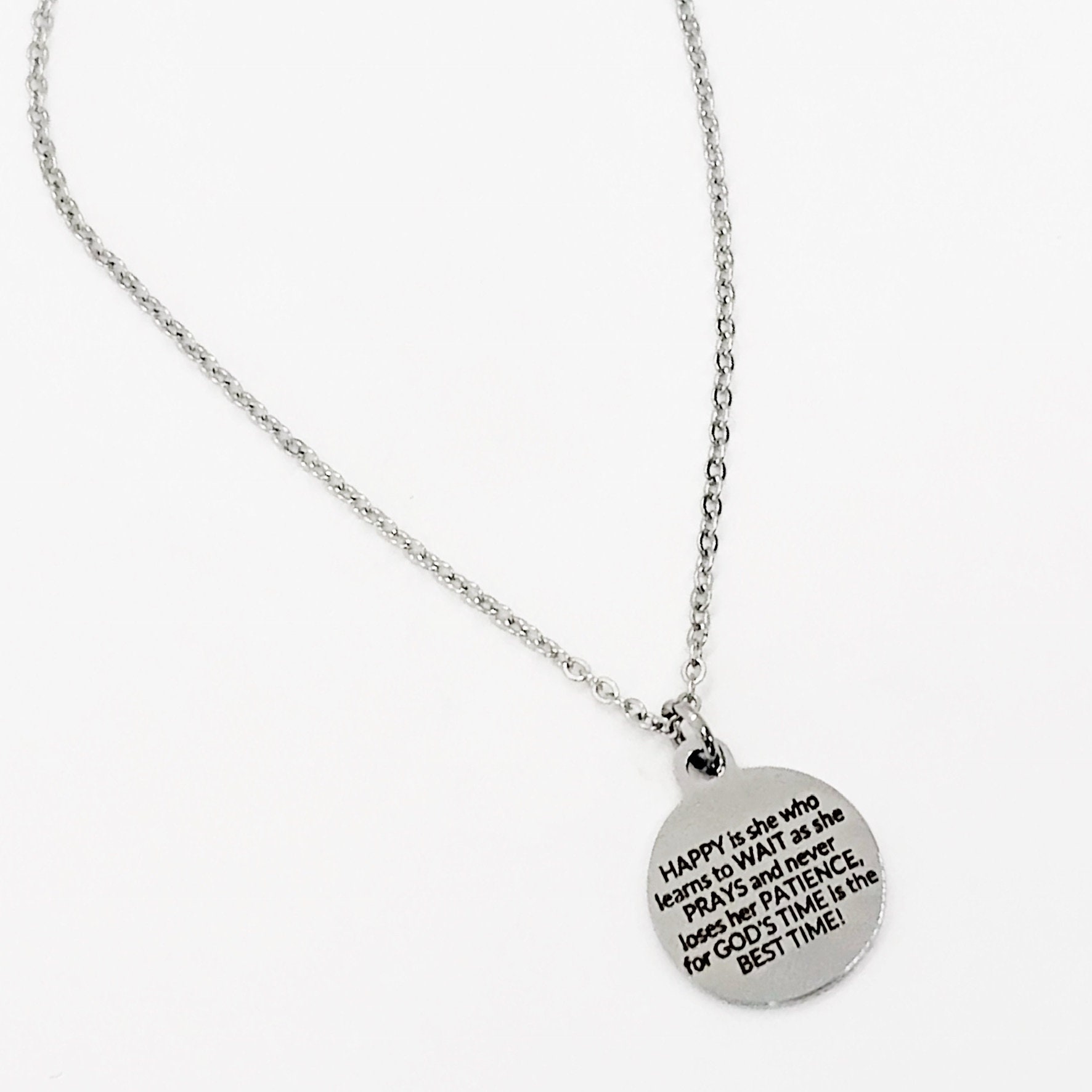 This is a beautiful stainless steel charm anklet with an encouraging Christian message that says “HAPPY is she who learns to WAIT as she PRAYS and never loses her PATIENCE, for GOD’S TIME is the BEST TIME!”