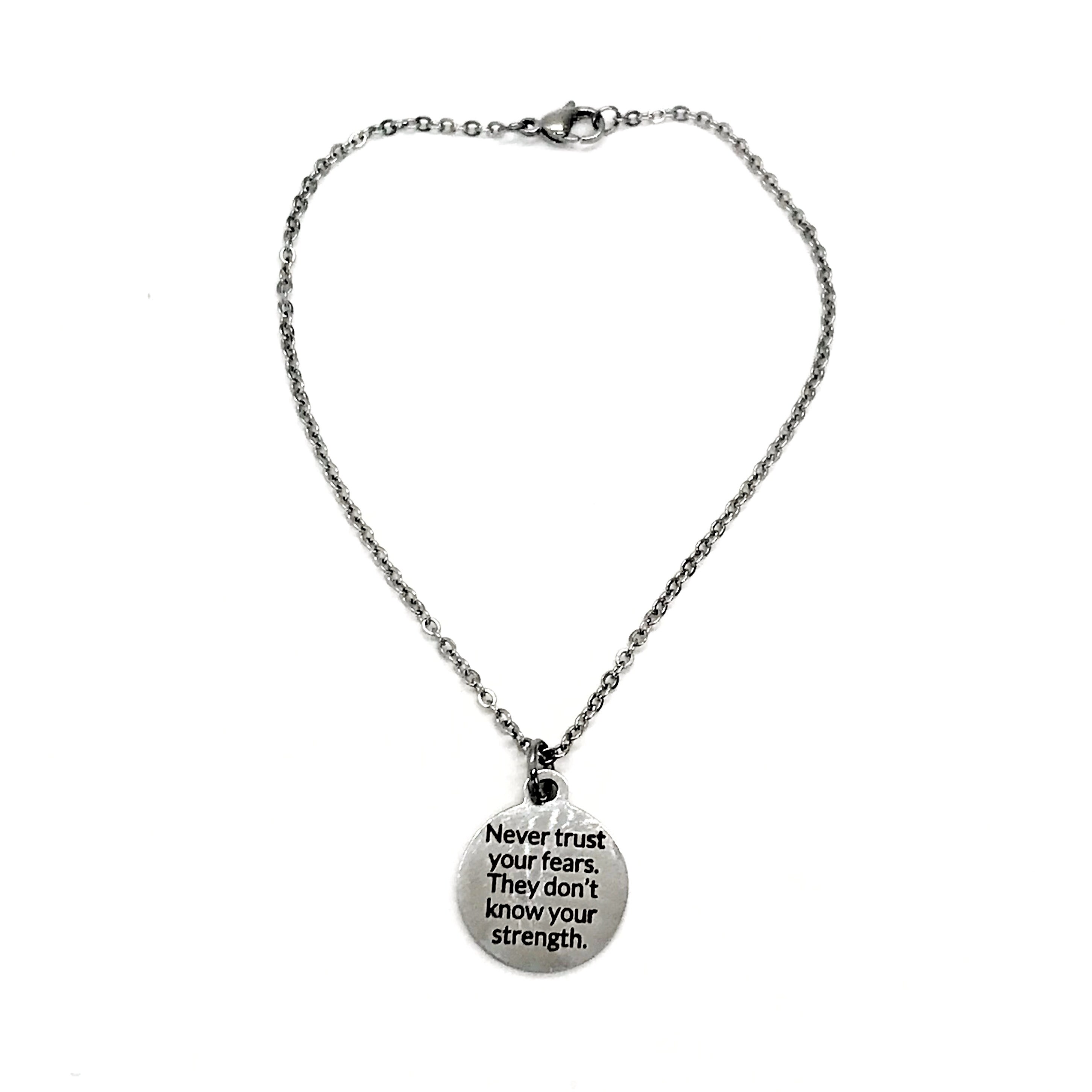 This is a beautiful stainless steel charm bracelet with an encouraging message that says “Never trust your fears. They don’t know your strength.”