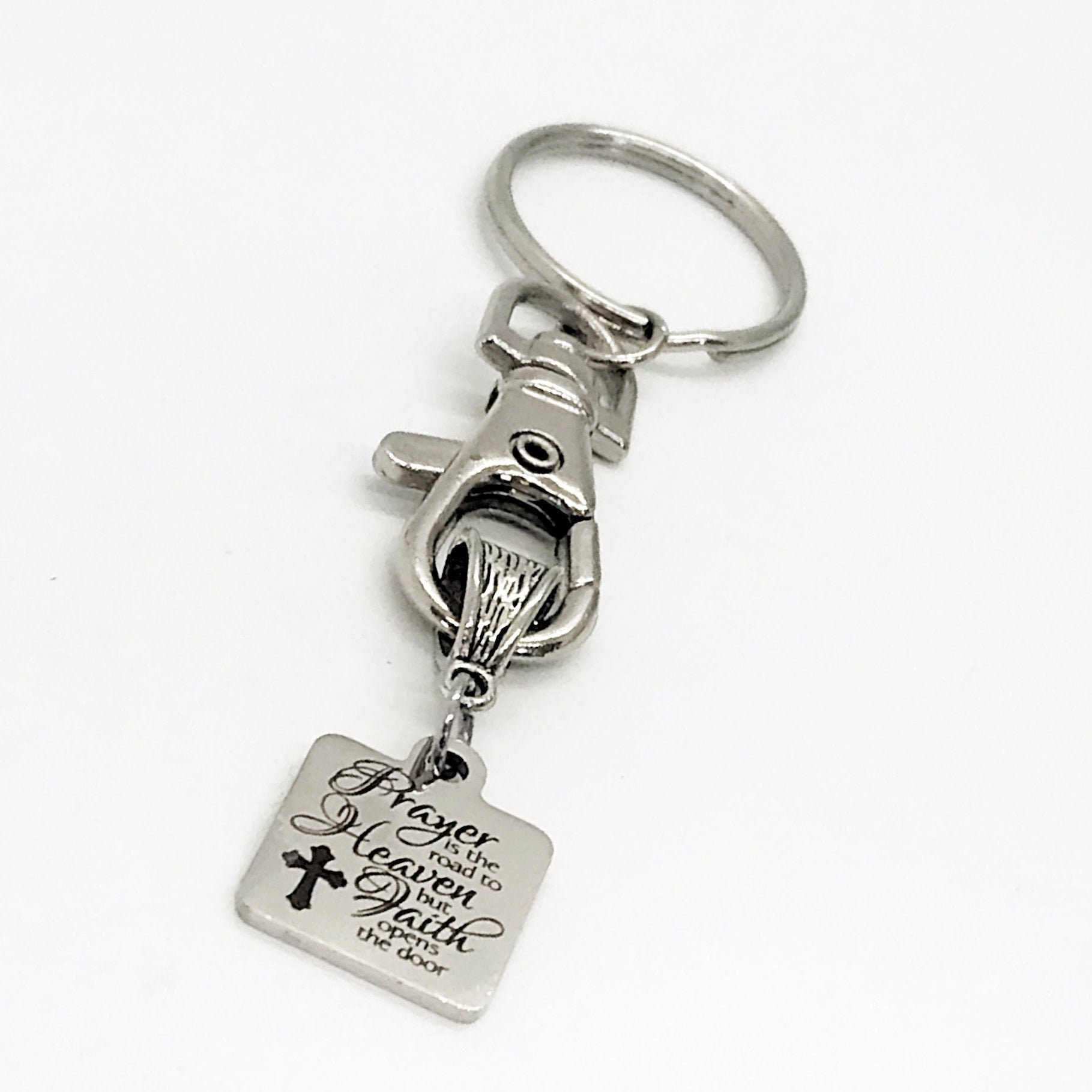 This keychain gift would make a great Christian gift. It has a stainless steel laser engraved charm with “Prayer is the road to heaven, but faith opens the door” on it.