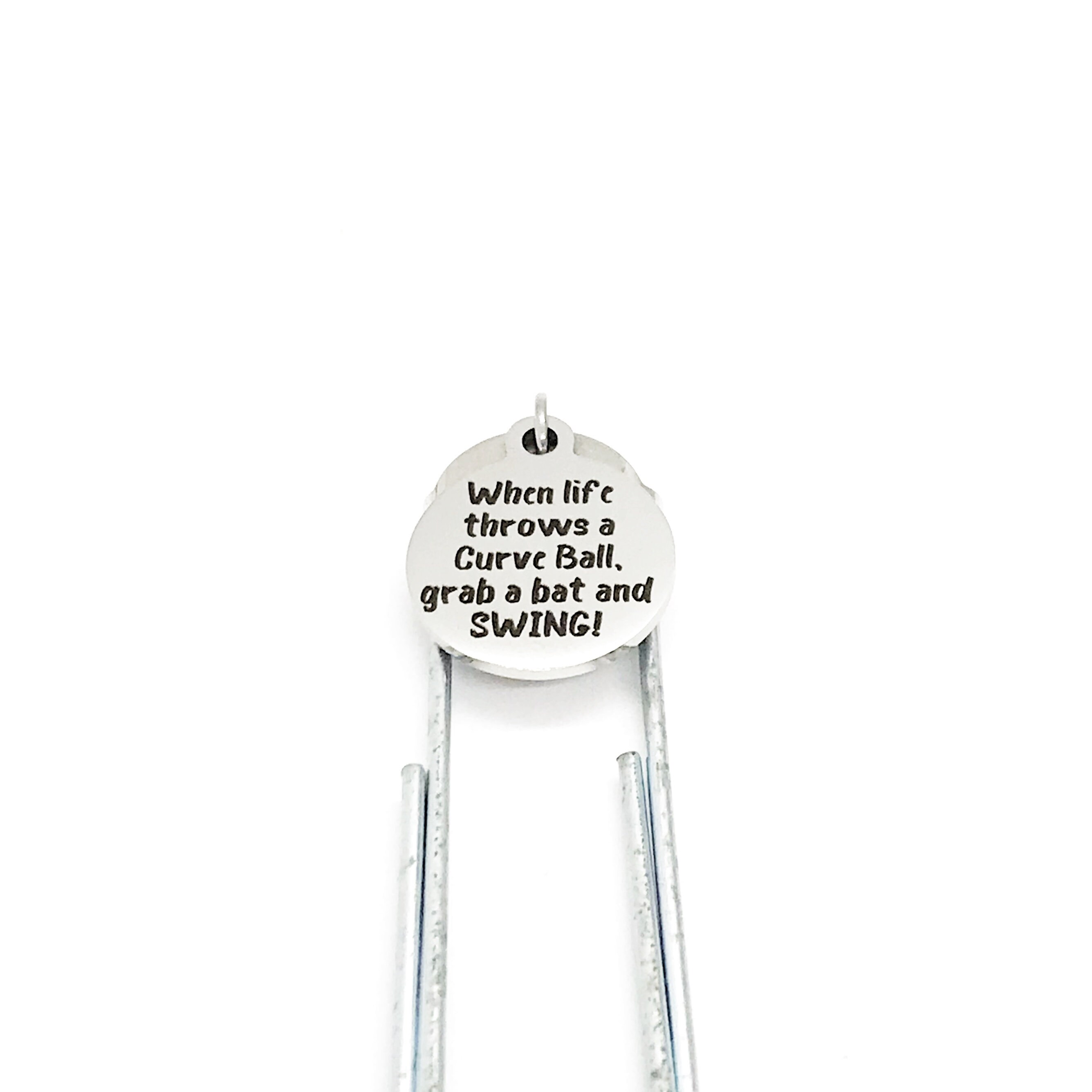 This bookmark has stainless steel laser engraved charm with “When life throws a curve ball, grab a bat and SWING!” on it.