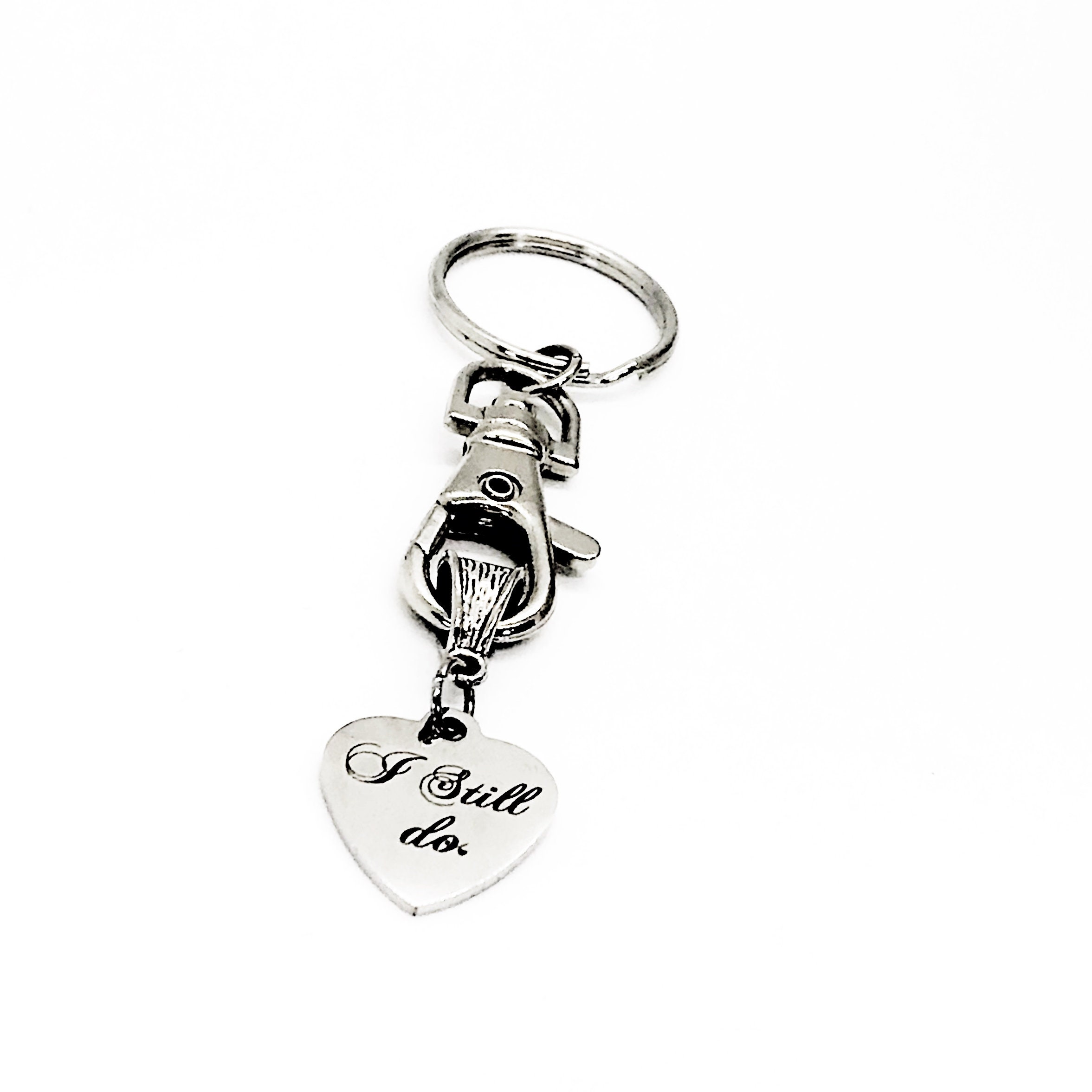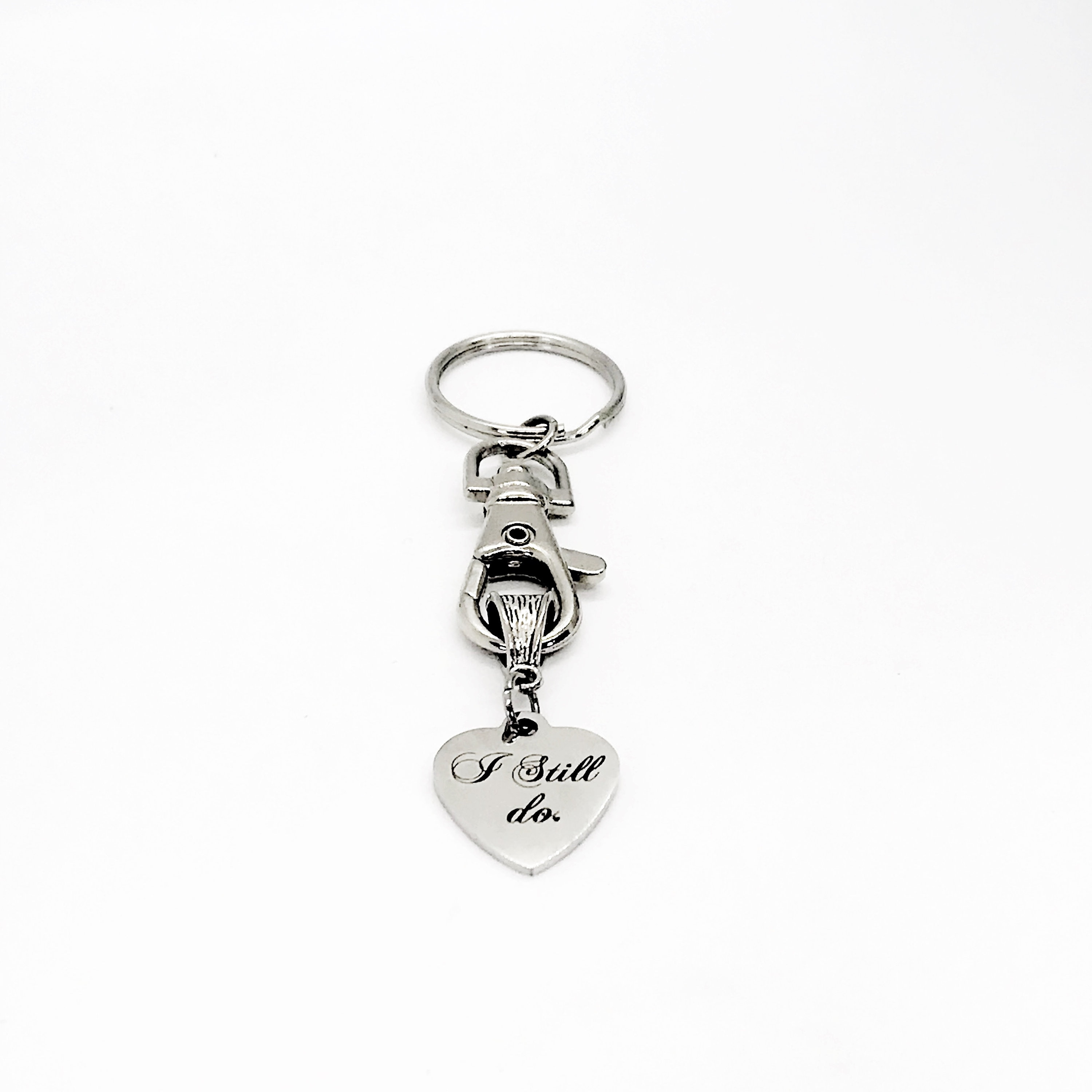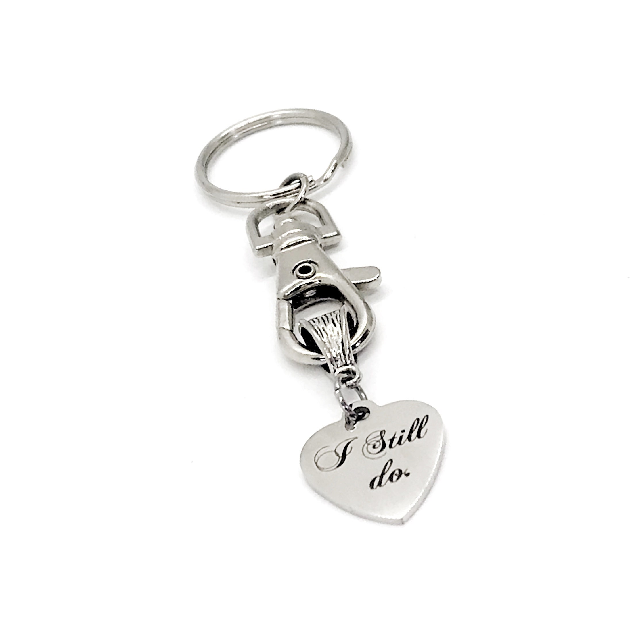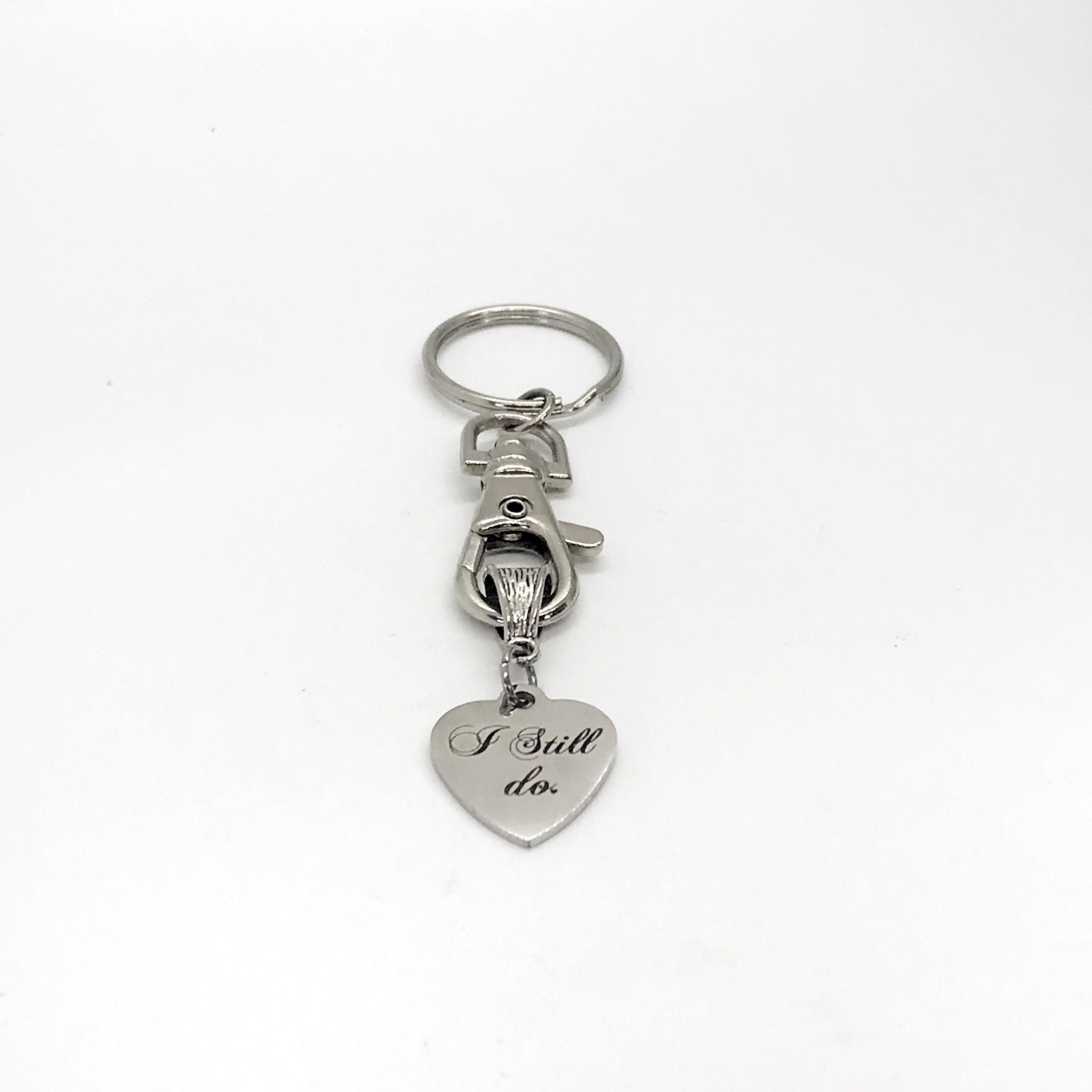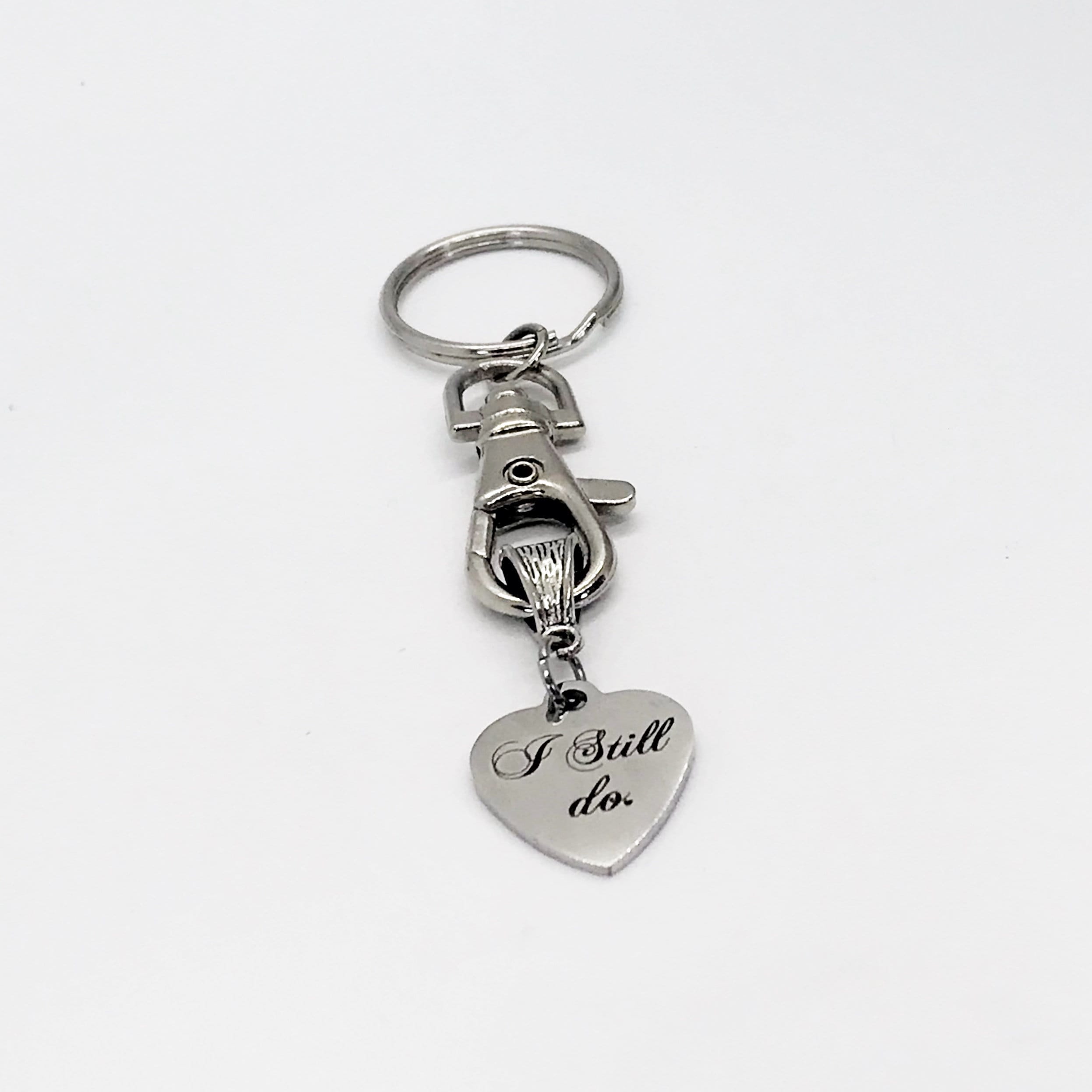 This keychain would make a great Anniversary or I Love You gift. It has a stainless steel laser engraved charm with “I still do” on it.