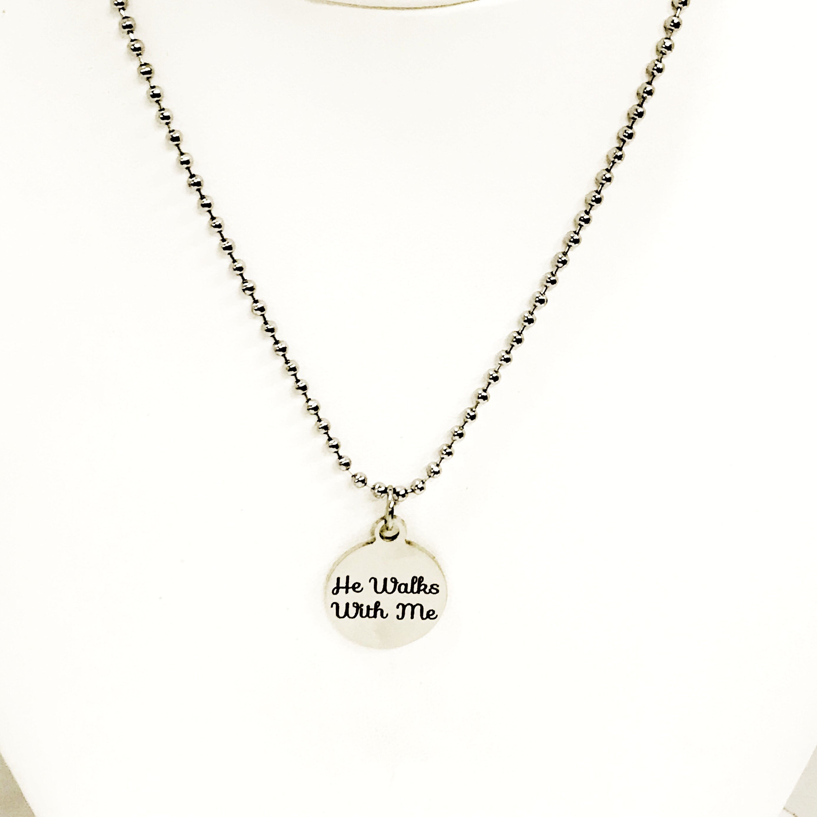 The pendant is a stainless steel laser engraved charm on a 24 inch ball chain. It would make a wonderful gift for the Christian man in your life. The charm has “He walks with me” on it.