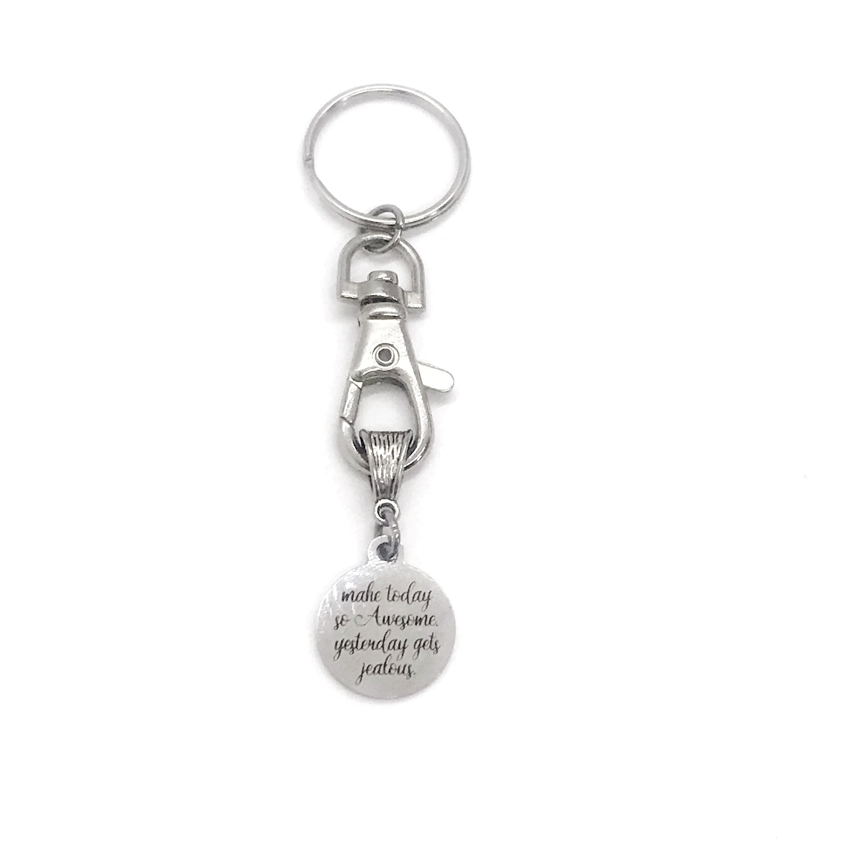 This keychain would make a motivational gift. It has a stainless steel laser engraved charm with “Make today so awesome yesterday gets jealous” on it.